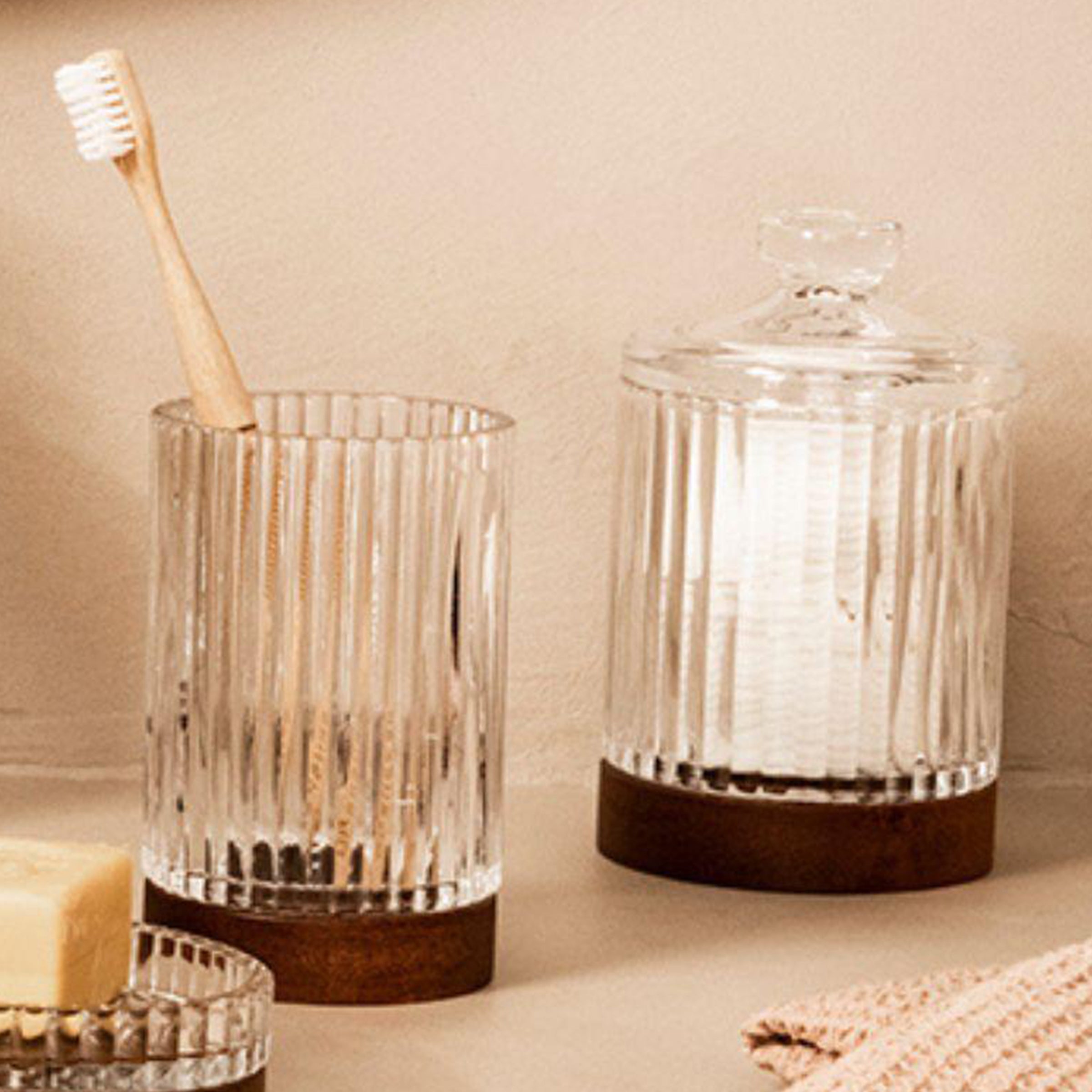 Scatola in vetro trasparente con coperchio, ideale da utilizzare come scatola per cotton fioc, per riporre dischetti struccanti o anche bastoncini per le orecchie. Ha una base in legno scuro che gli conferisce uno stile classico ed elegante.