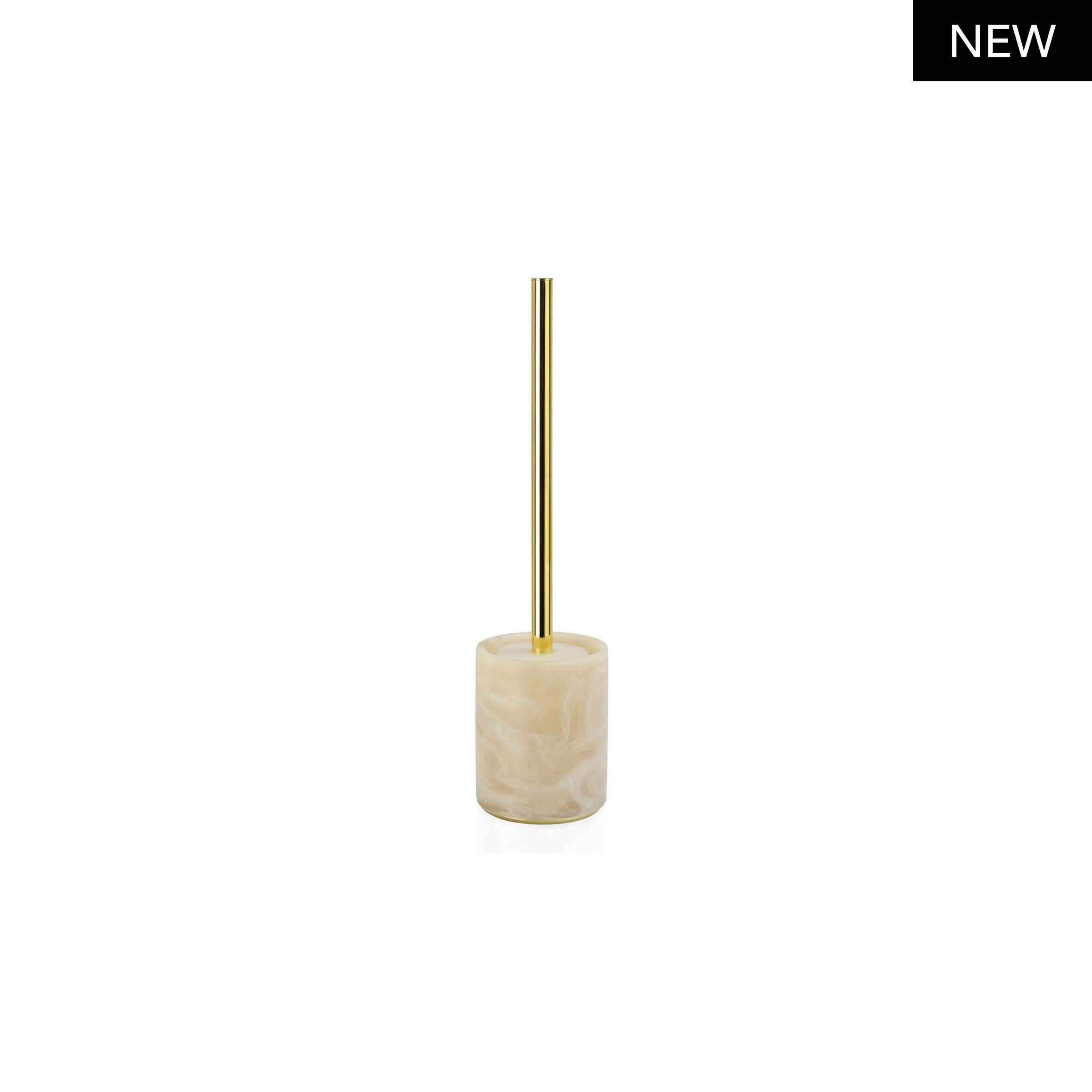 Questo è un accessorio da bagno classico ed elegante, il contenitore è realizzato in poliresina effetto marmo rosa e il manico della spazzola è in metallo dorato.