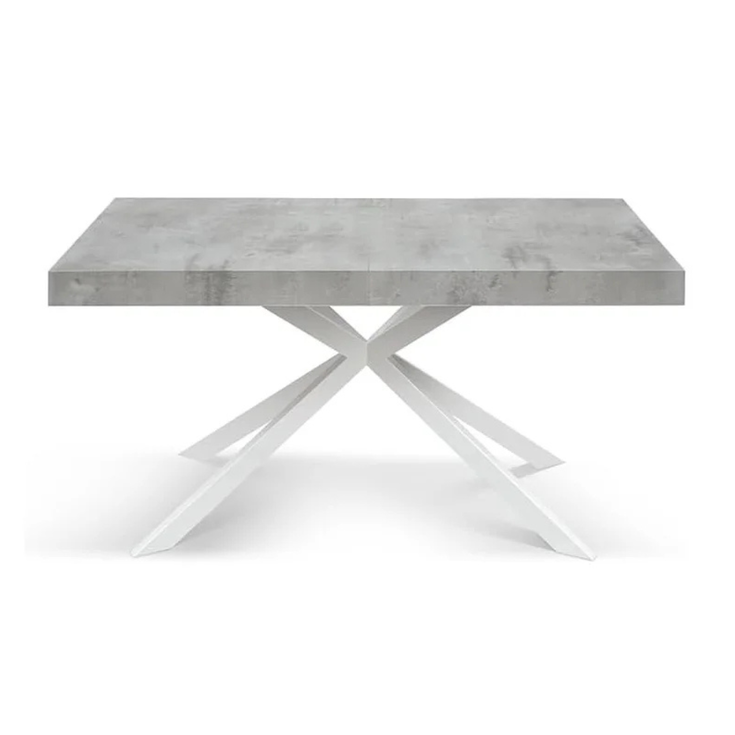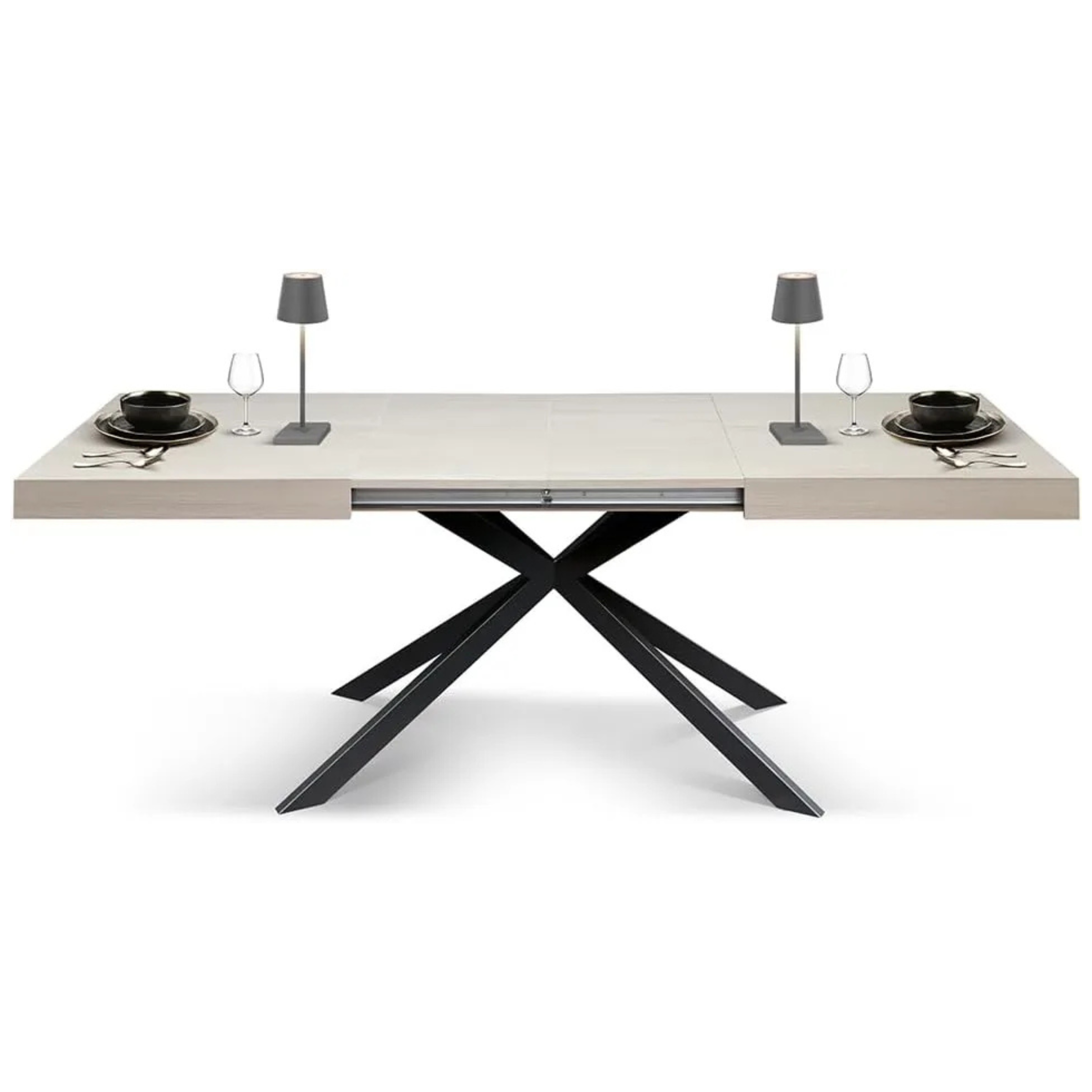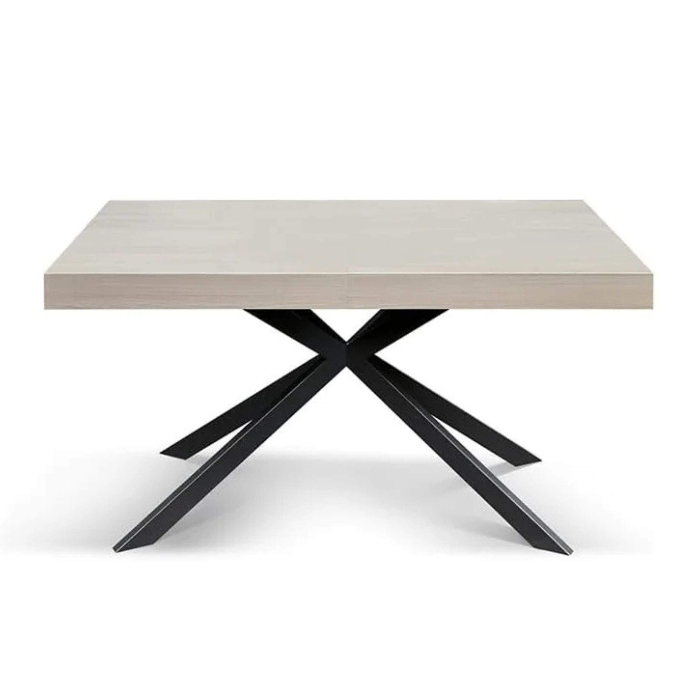 Il punto focale è la struttura: le gambe in acciaio verniciato sono disposte in un dinamico intreccio a X. Questa configurazione obliqua non solo garantisce una stabilità eccezionale, ma snellisce visivamente il tavolo, donandogli un aspetto sofisticato e leggero nonostante la robustezza dei materiali.