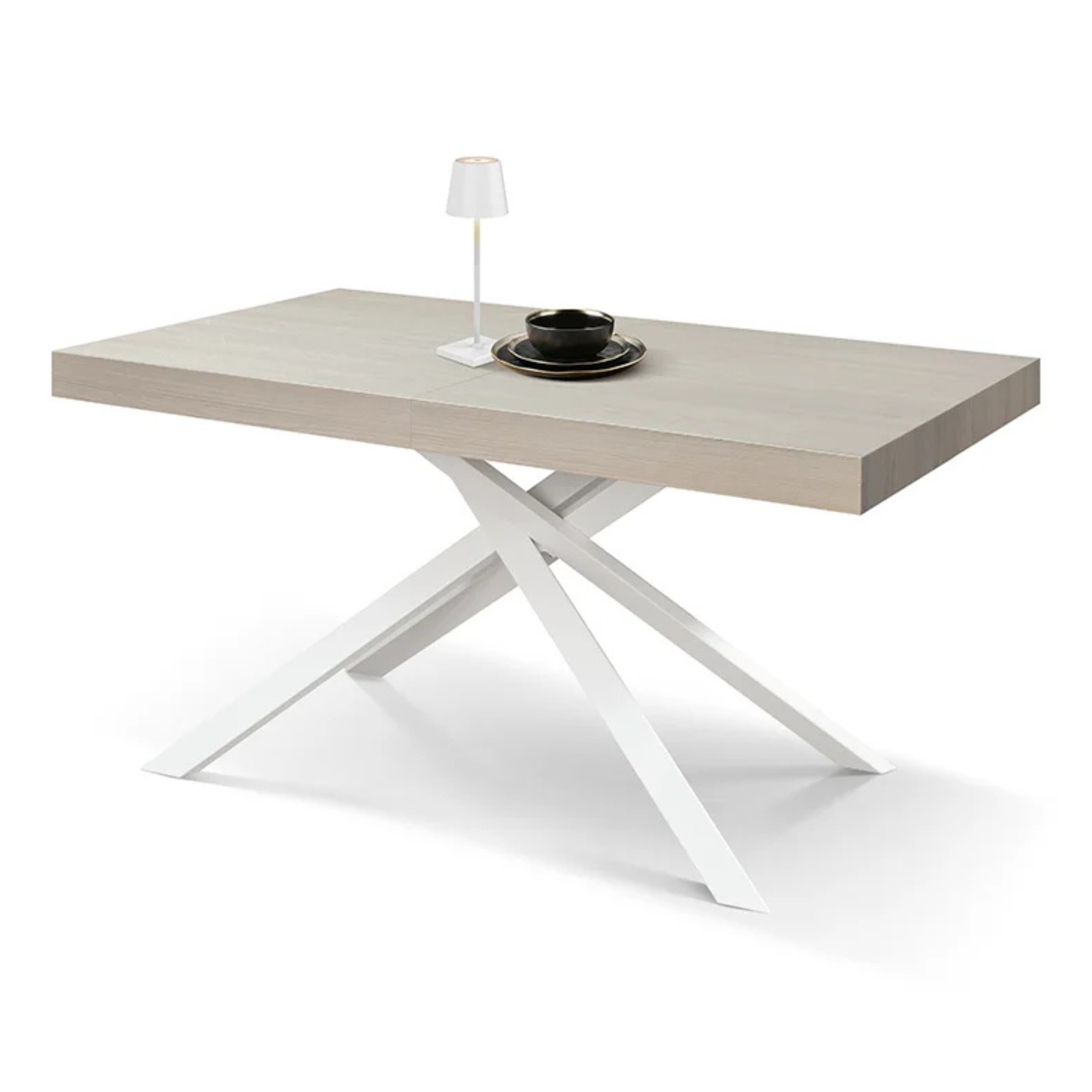 Il suo design cattura immediatamente lo sguardo grazie alla base scultorea in acciaio verniciato. Le gambe, oblique e incrociate in un gioco geometrico sofisticato, non solo garantiscono una stabilità eccezionale, ma conferiscono una leggerezza visiva che modernizza l'intero ambiente.
