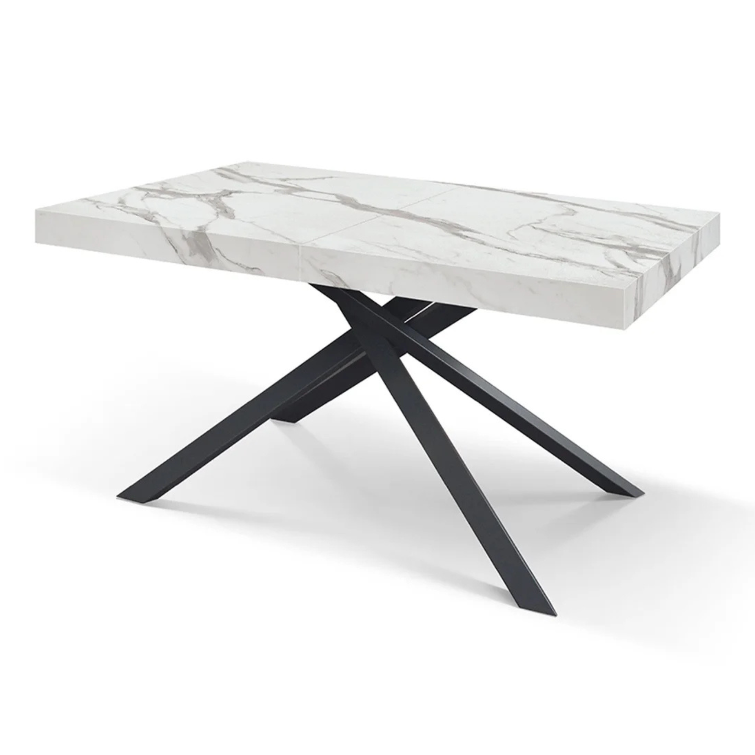 A contrasto con la base, il piano in legno nobilitato melaminico di alta qualità sfoggia una moderna finitura, perfetta per texture materiche e atmosfere urbane. Ma la vera magia di MALMO risiede nella sua versatilità "nascosta". Da chiuso, i suoi 140 cm ospitano comodamente 6 persone, ma in pochi istanti si trasforma per accoglierne fino a 10 (raggiungendo i 220 cm).