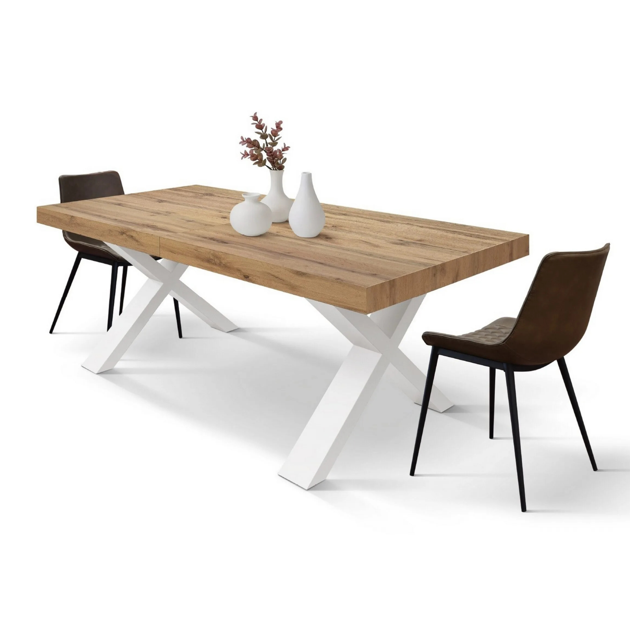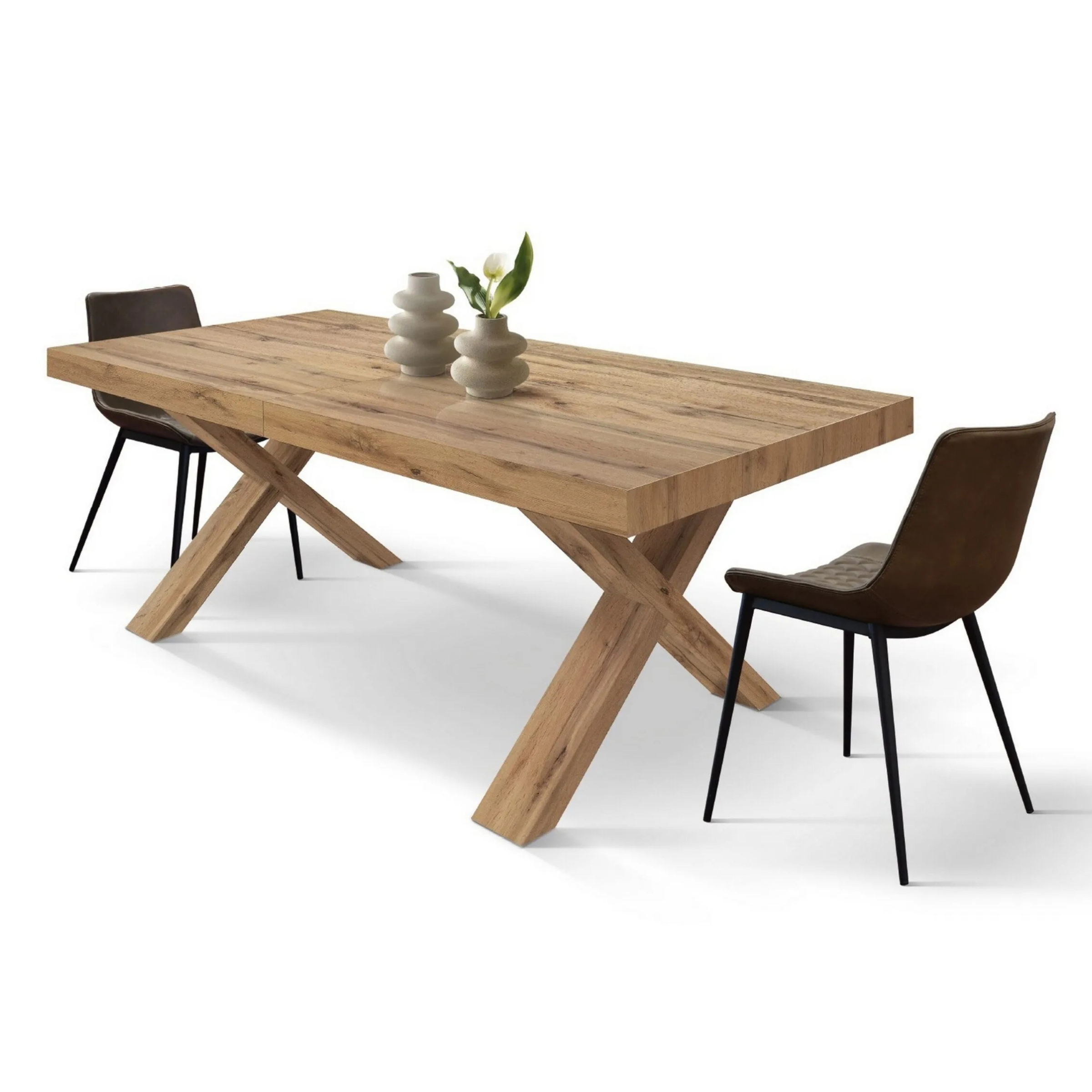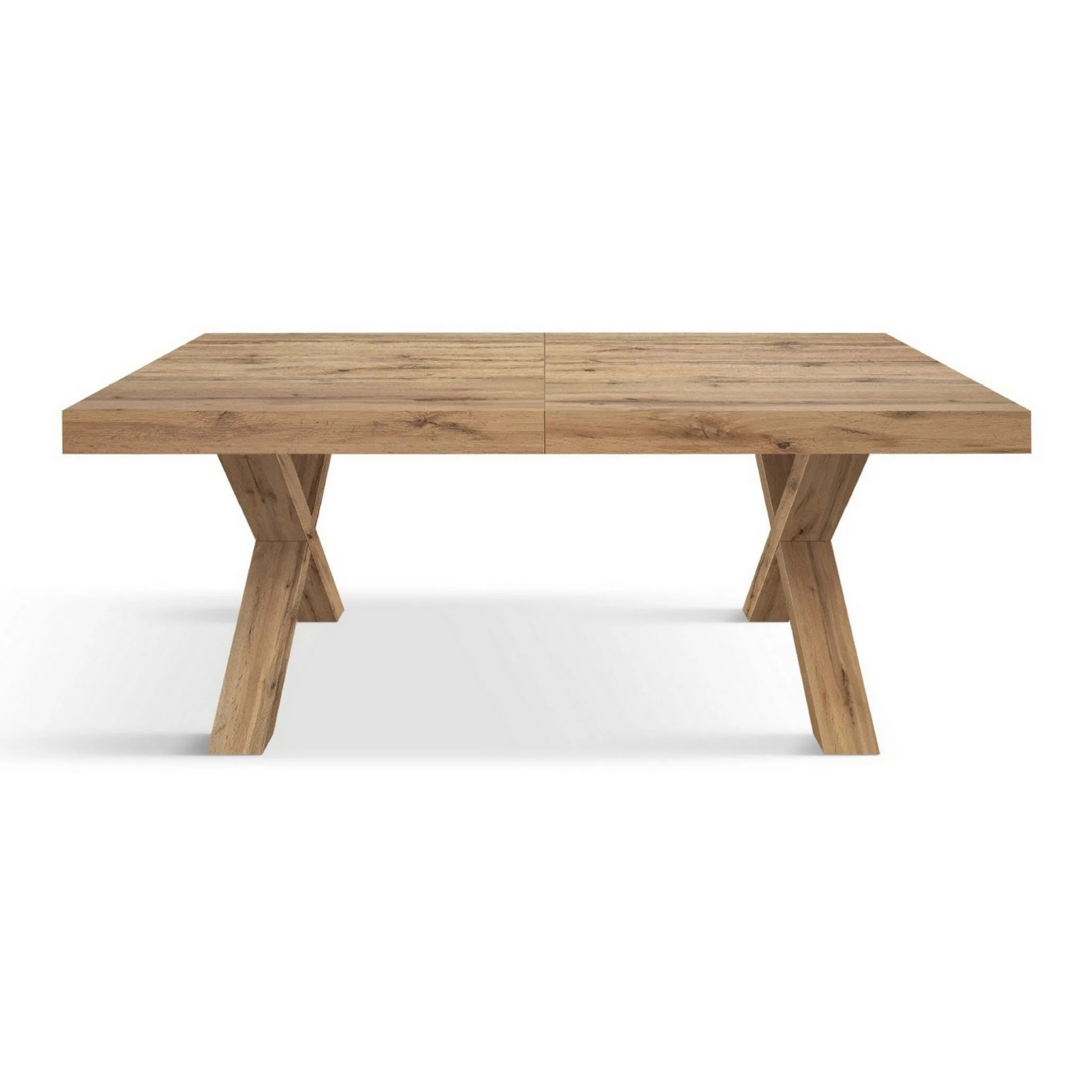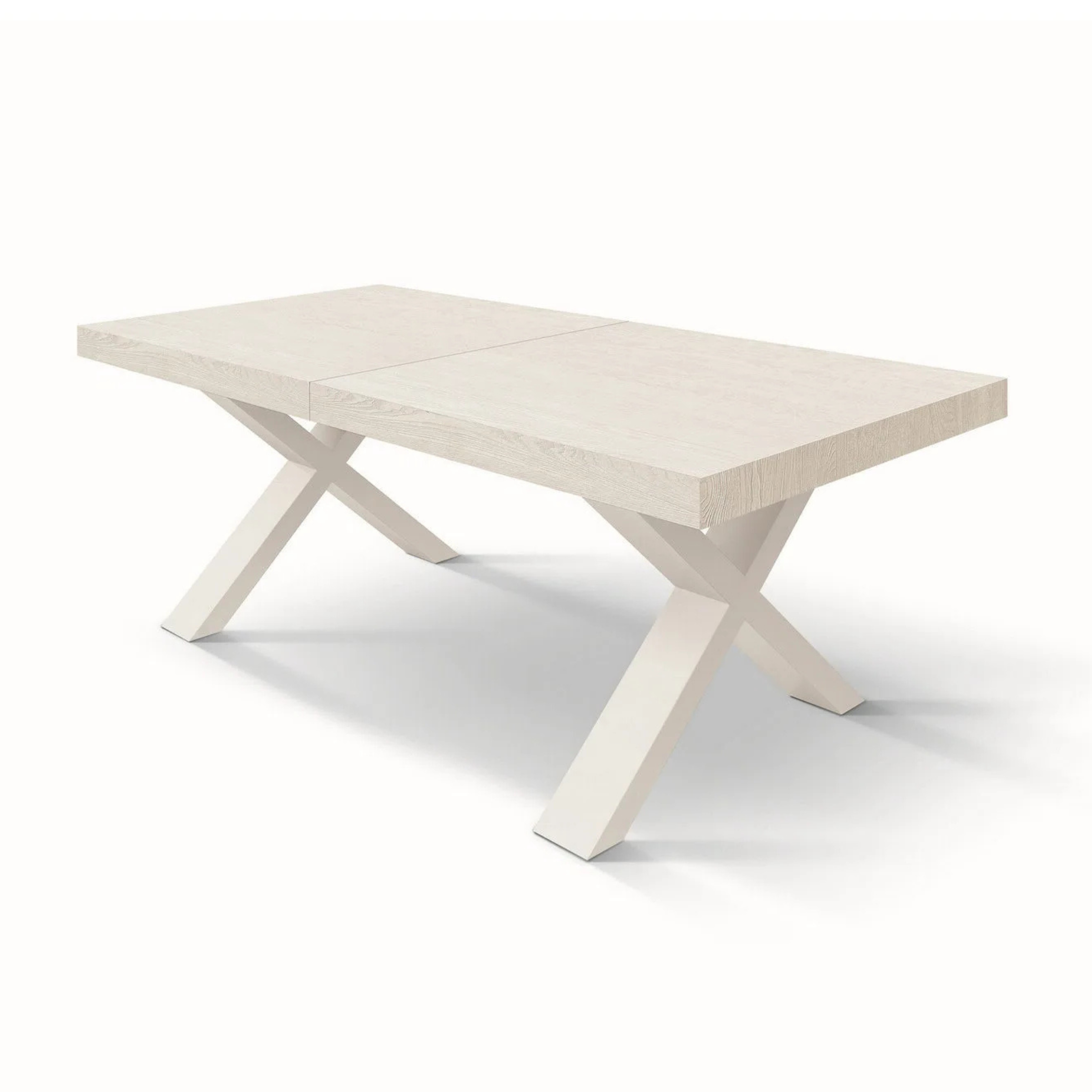 Il piano in legno nobilitato melaminico dona una luminosità naturale e una texture accogliente, mentre le gambe incrociate (disposte nel caratteristico design a X) garantiscono una stabilità impeccabile e un tocco deciso in stile Industrial.