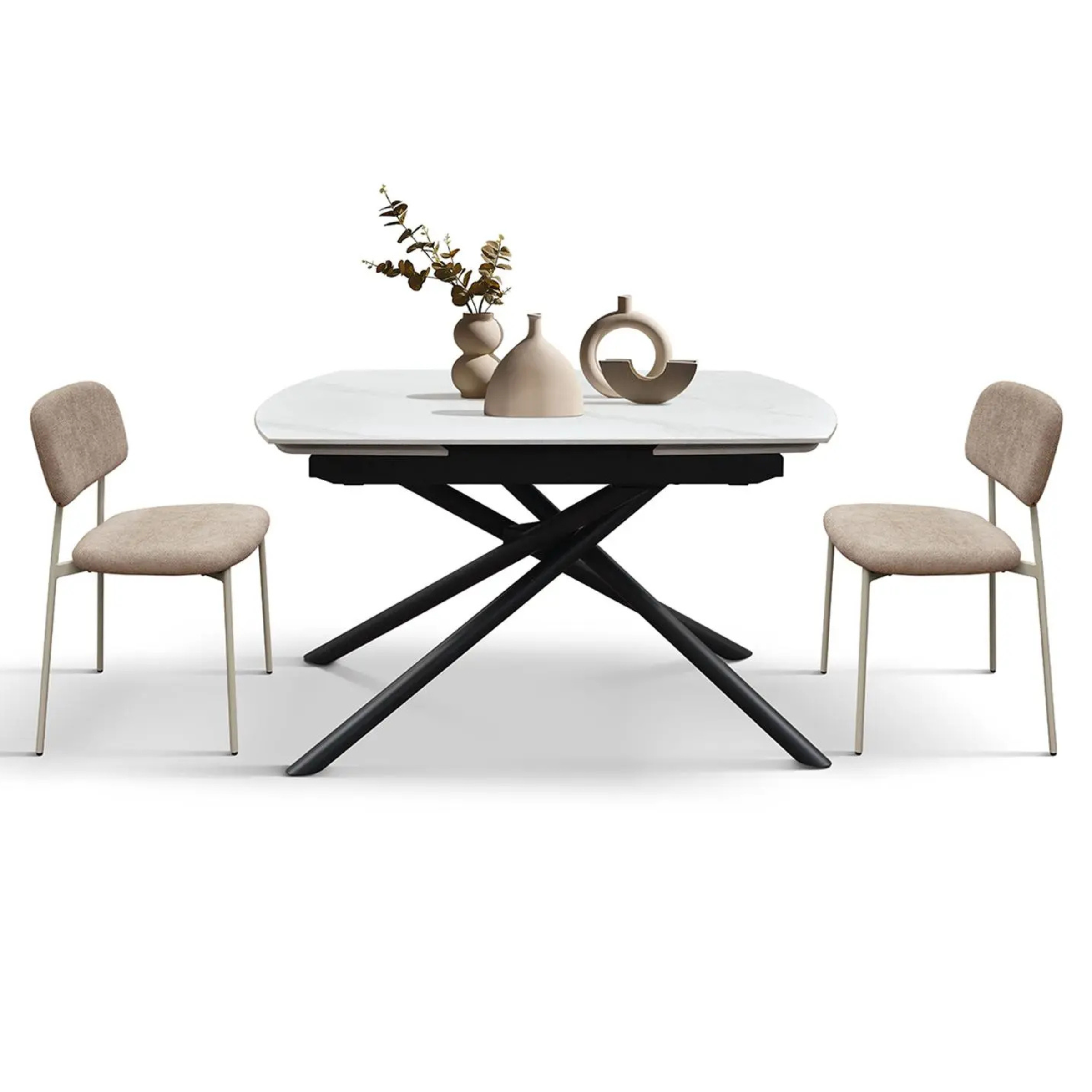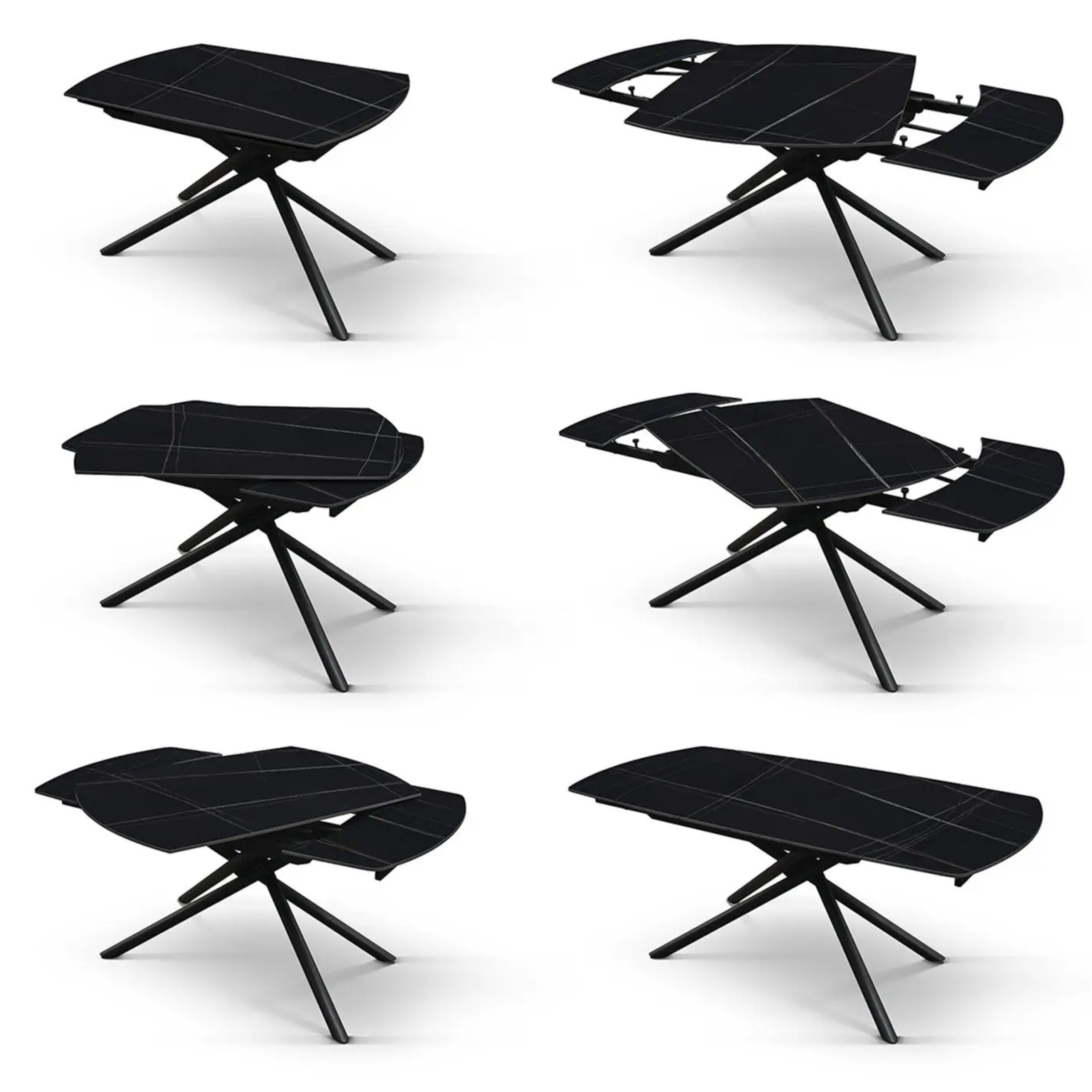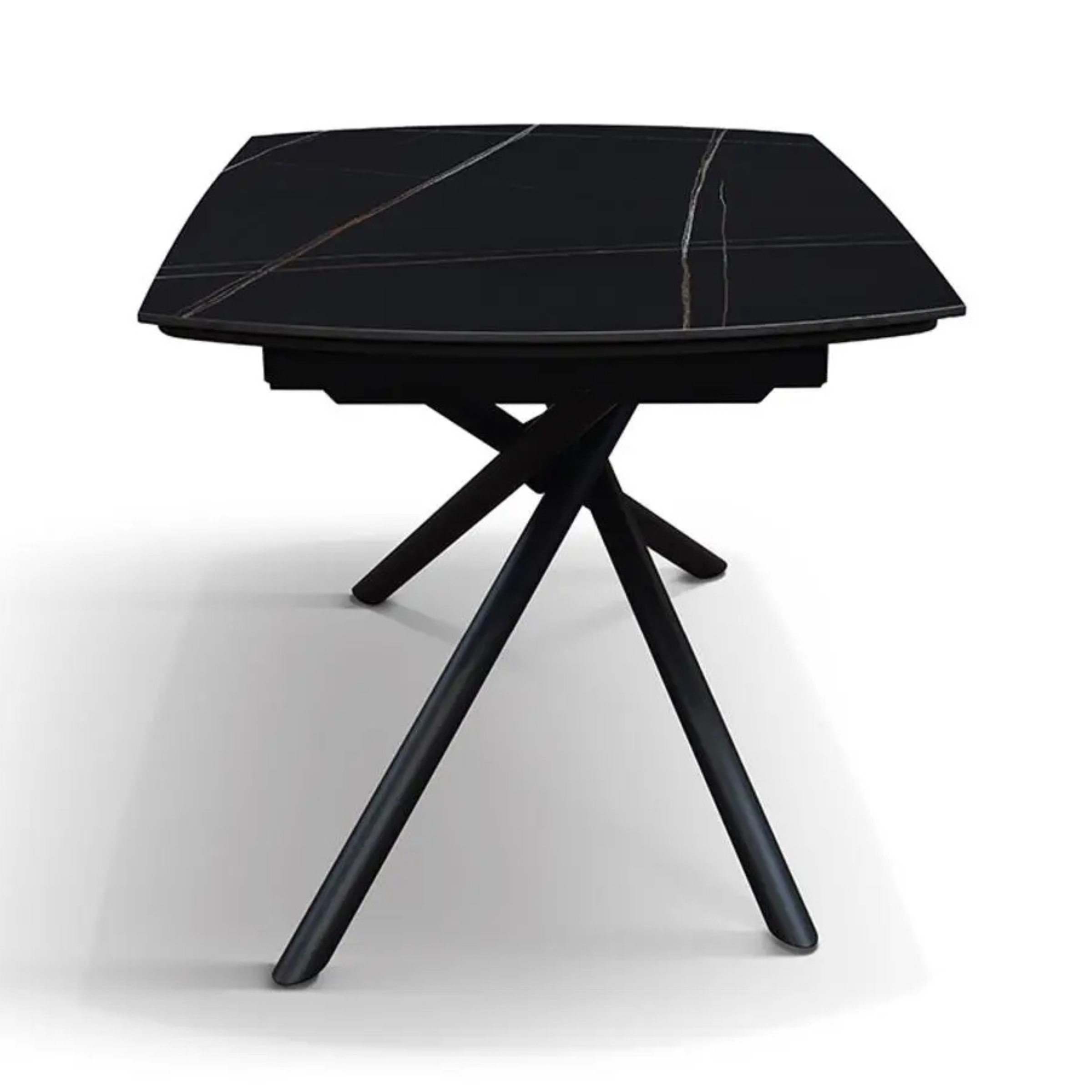 Il piano in ceramica incanta per la sua luminosità e le sue venature profonde, offrendo al contempo una superficie estremamente resistente, igienica e facile da mantenere. La base è dotata di una struttura tubolare a raggiera in metallo nero opaco , che garantisce stabilità e un dinamismo visivo capace di catturare ogni sguardo.