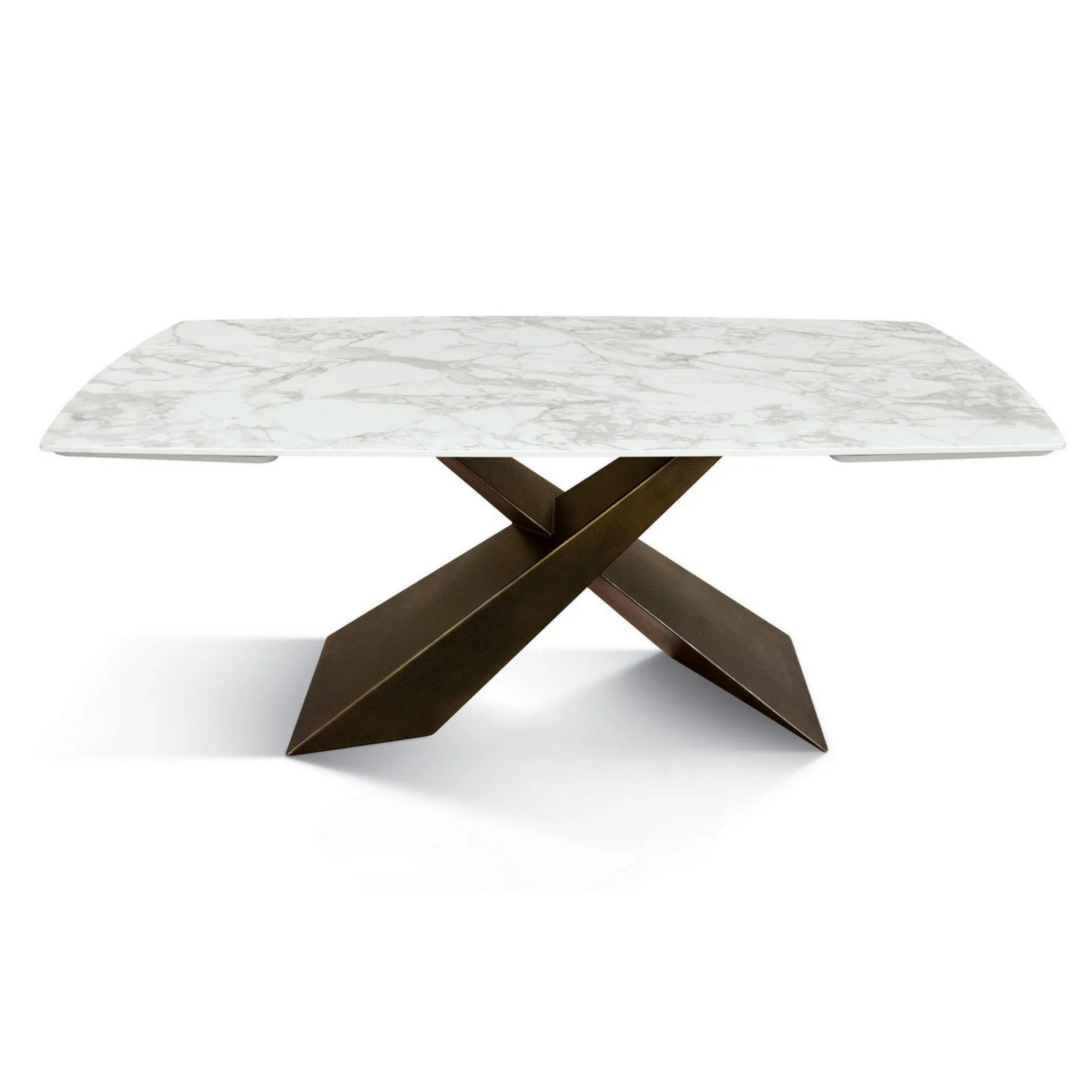 A sostenere questa superficie preziosa troviamo un basamento a gambe incrociate a X in metallo. Questa finitura calda e materica crea un contrasto magnetico con il candore del piano, conferendo al tavolo un carattere "Glam" e una stabilità impeccabile, rendendolo il vero protagonista di ogni sala da pranzo o salotto moderno.
