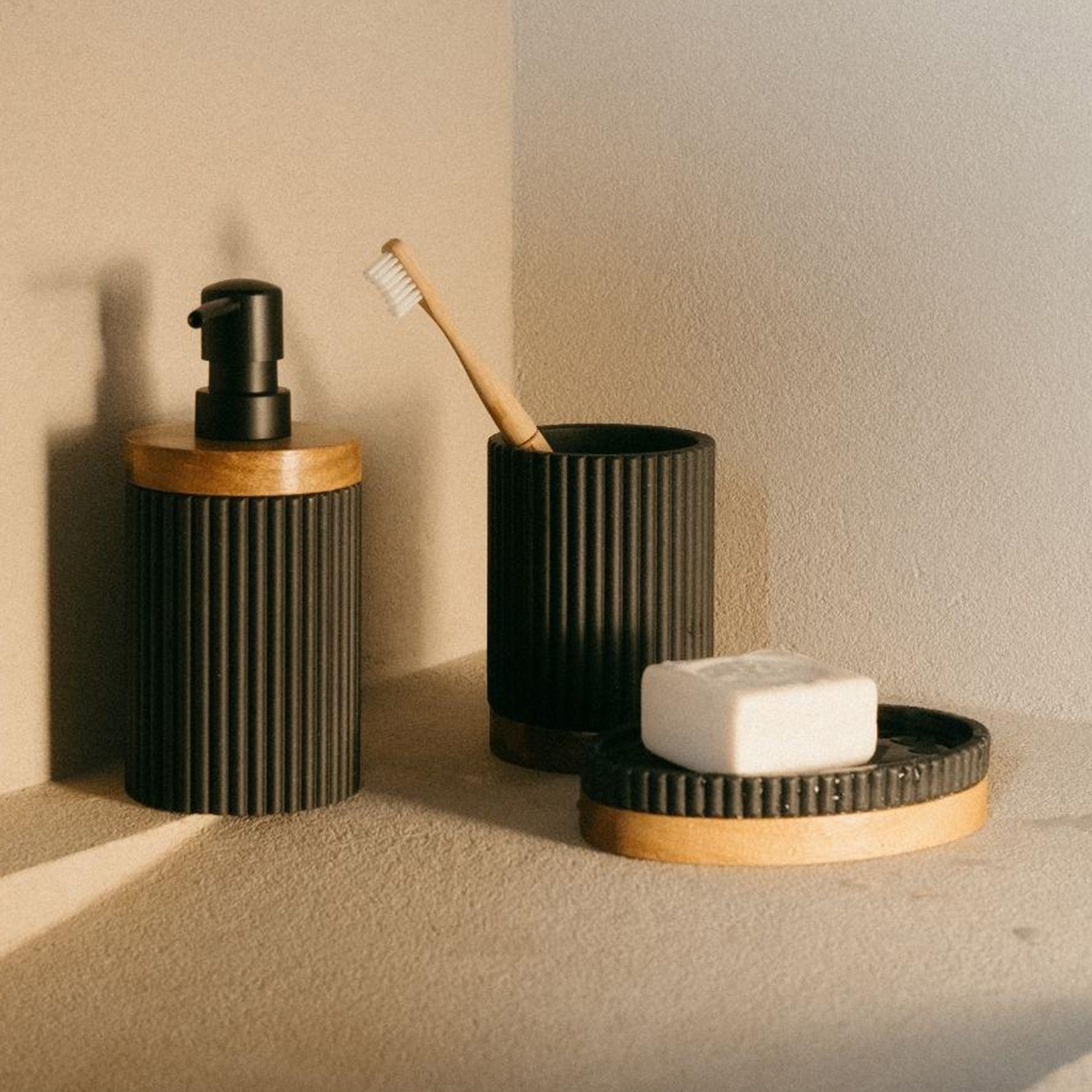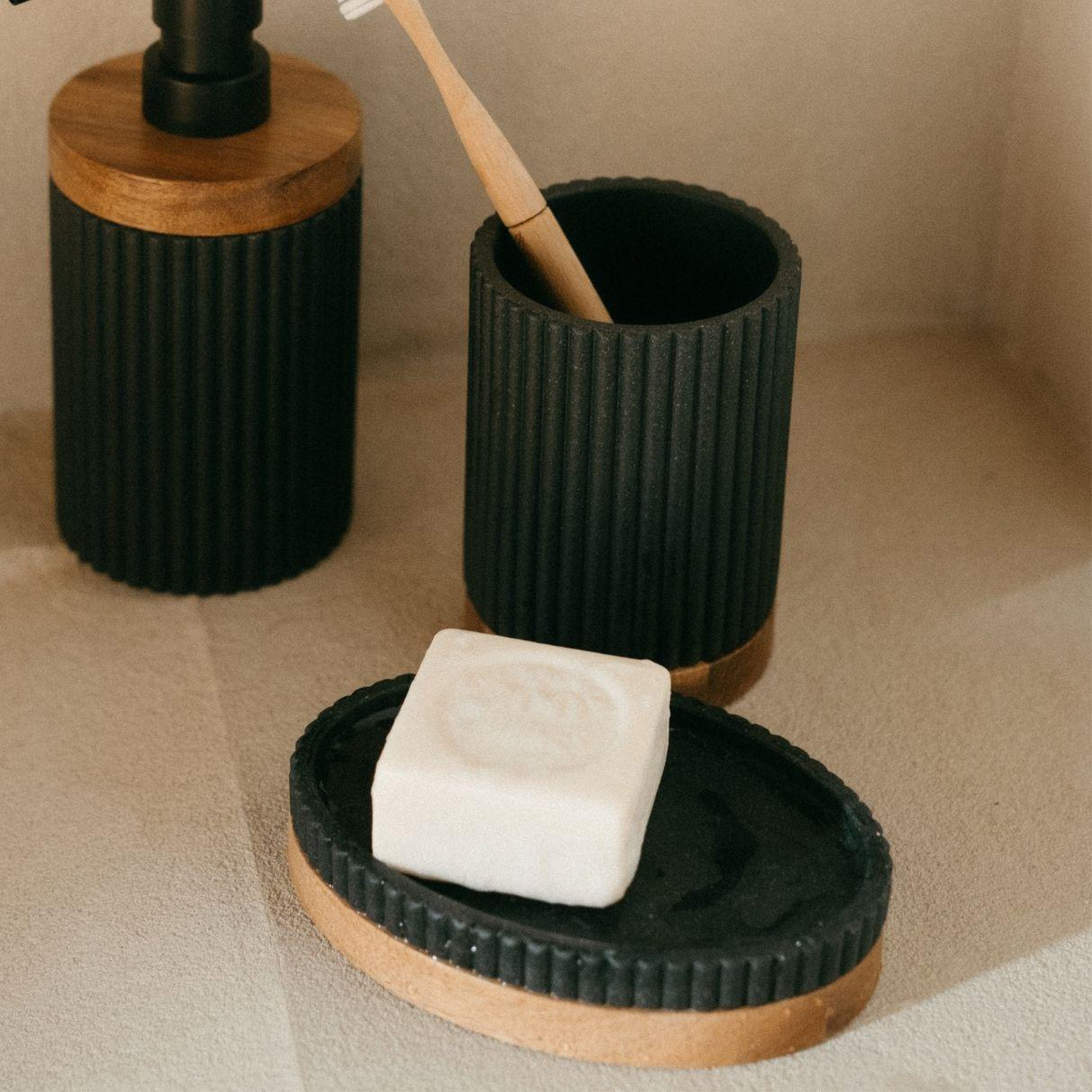 Questo portasapone ha una forma ovale, una texture ruvida al tatto e linee in rilievo. È realizzato in poliresina nera e legno di acacia naturale.