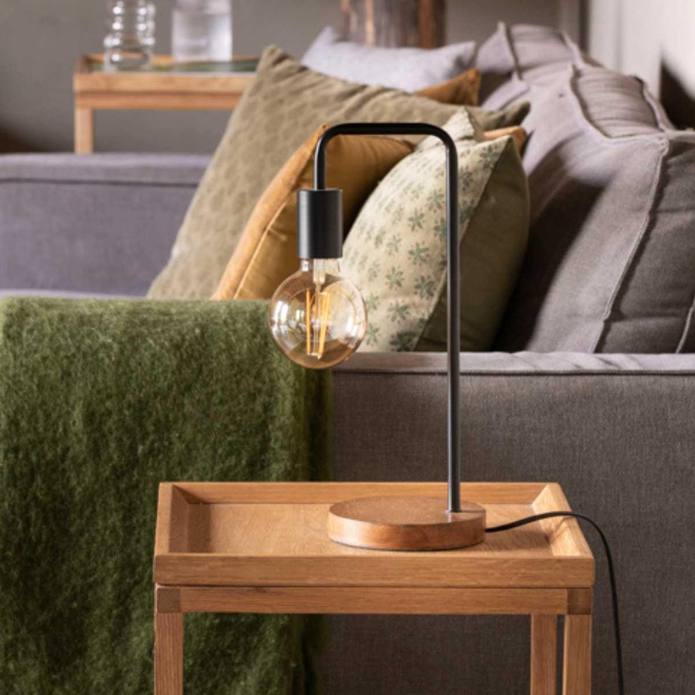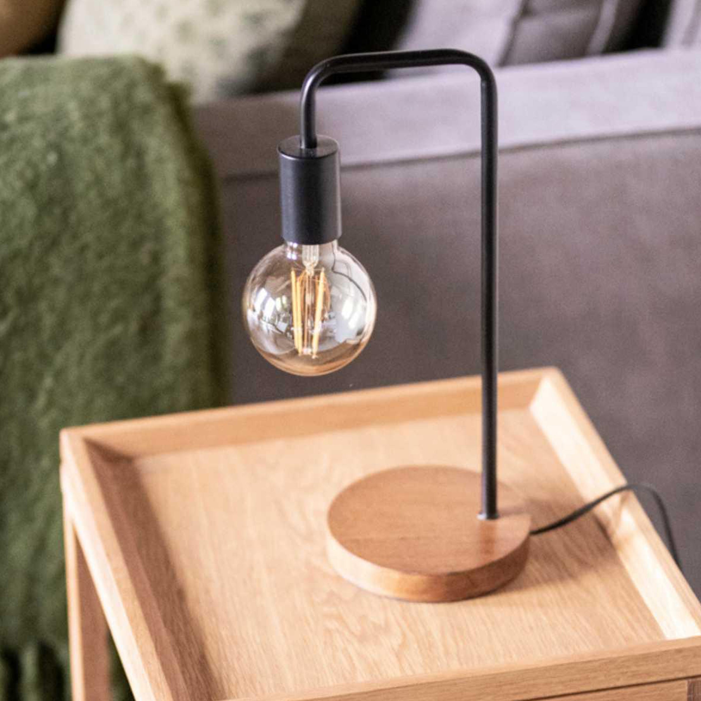 Questa lampada da tavolo in metallo nero opaco con base in legno è ideale da abbinare a lampadine decorative e originali. È stata progettata per adattarsi a qualsiasi ambiente: in un soggiorno in stile industriale, in un angolo lettura con poltrone in velluto, o sul comodino in una camera da letto in stile nordico. Le sue linee curve e i colori scuri conferiscono un'aria sobria ed elegante: l'alleato perfetto dell'illuminazione ausiliaria per qualsiasi spazio.
