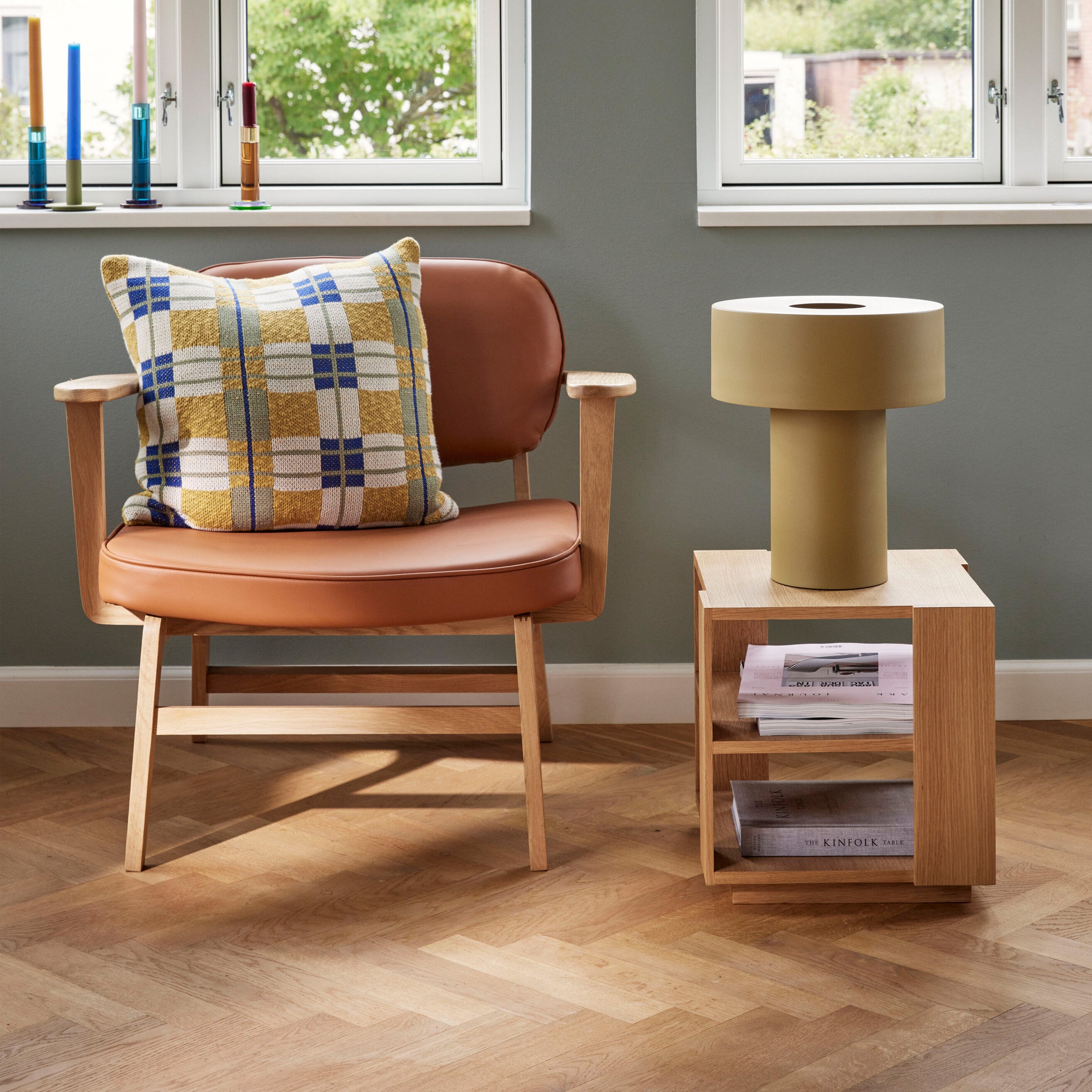 L'aspetto vellutato della lampada da tavolo AKI è stupendo e la profondità del metallo colore kaki dona un'idea di lusso quotidiano. Semplice ed elegante questa lampada da tavolo si illuminerà ovunque la posizionerai.