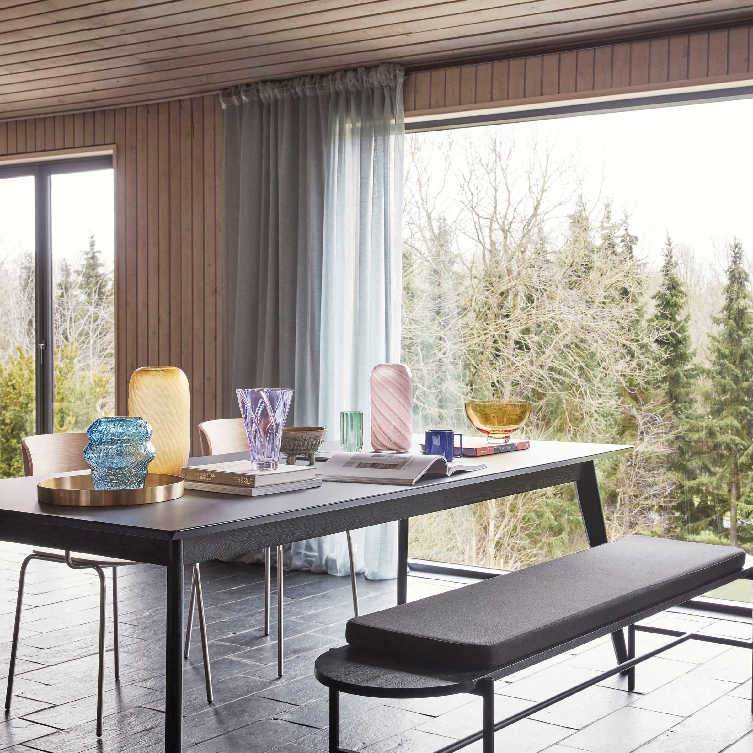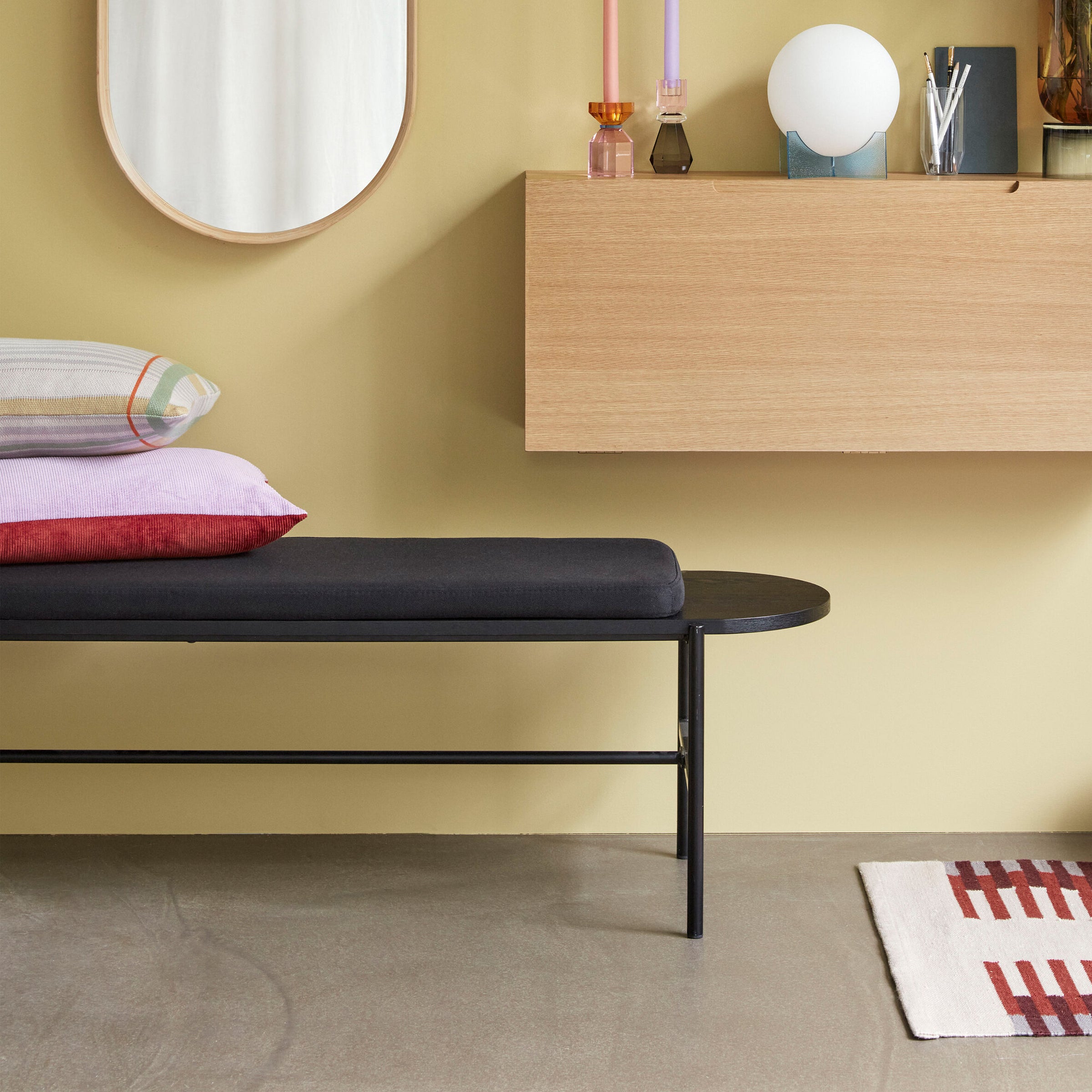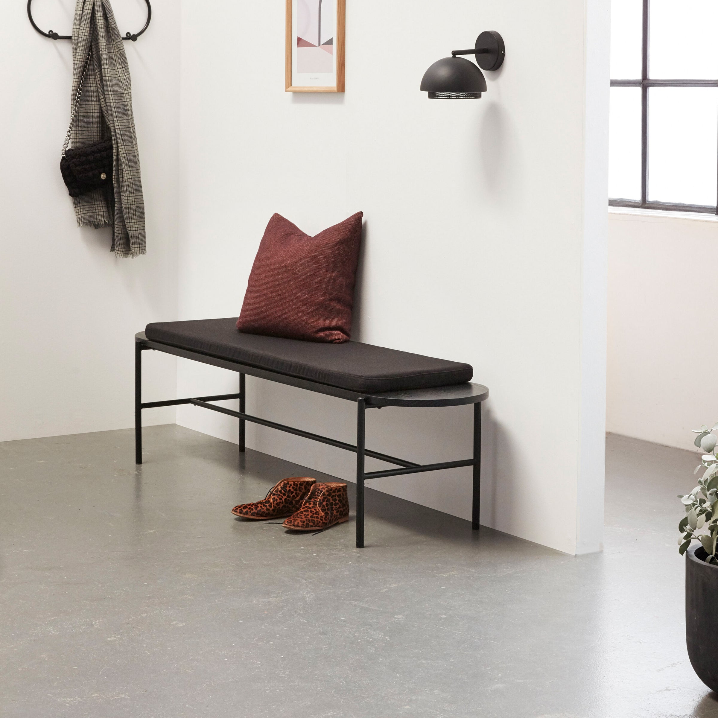 La panca NORMAD è una soluzione di seduta ultramoderna e confortevole per la tua casa. Realizzata in metallo verniciato nero e dotata di un comodo cuscino in tessuto grigio scuro, questa panca ha anche dei bellissimi dettagli in rovere certificato FSC nero. La panca Norm è perfetta per aggiungere un tocco moderno a qualsiasi soggiorno o camera da letto e sarà sicuramente un'aggiunta comoda ed elegante alla tua casa.
