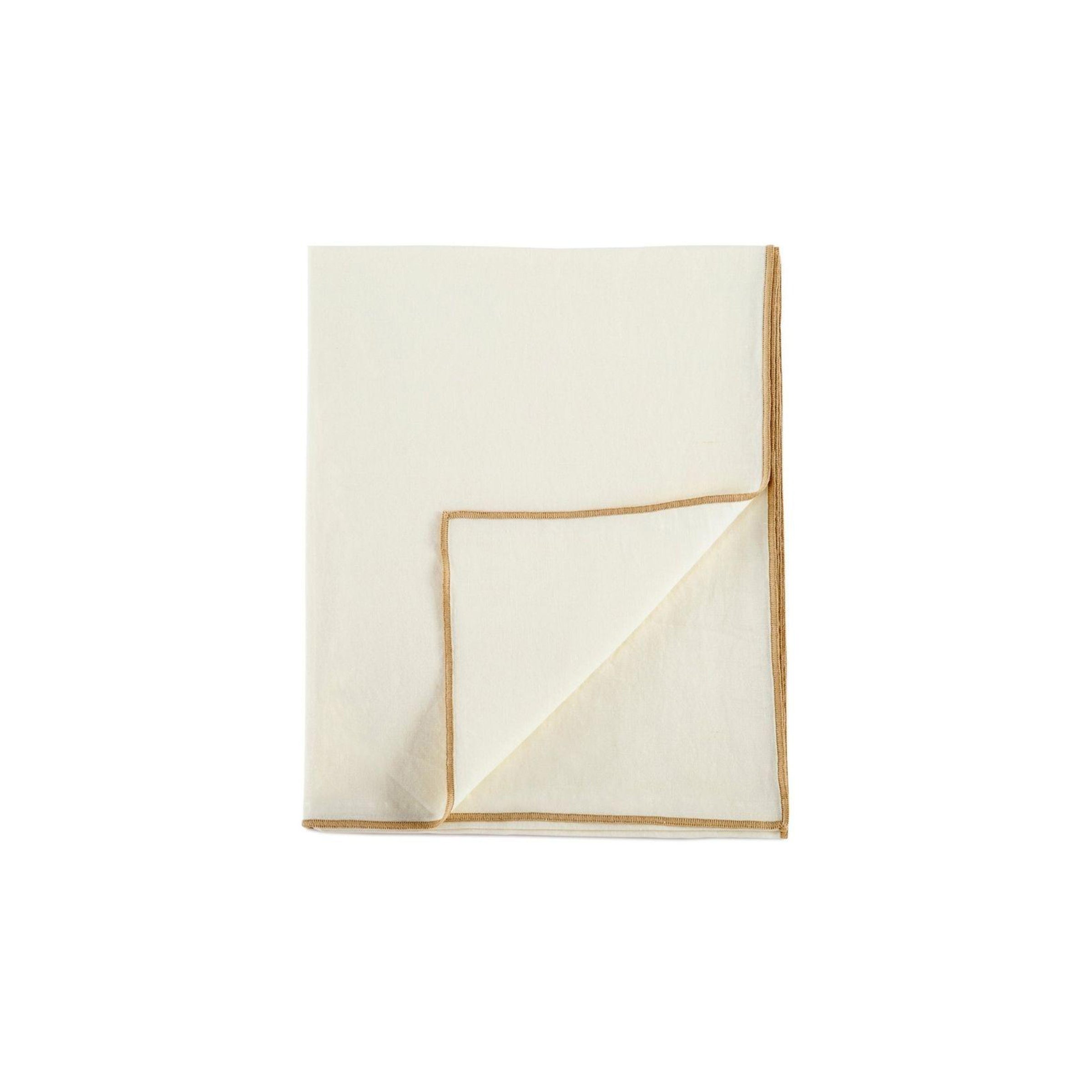 Runner da tavolo in cotone e lino bianco con finiture ricamate beige. L'accessorio da tavola perfetto per vestire una tavola elegante, sia in un arredamento classico che in una sala da pranzo moderna.