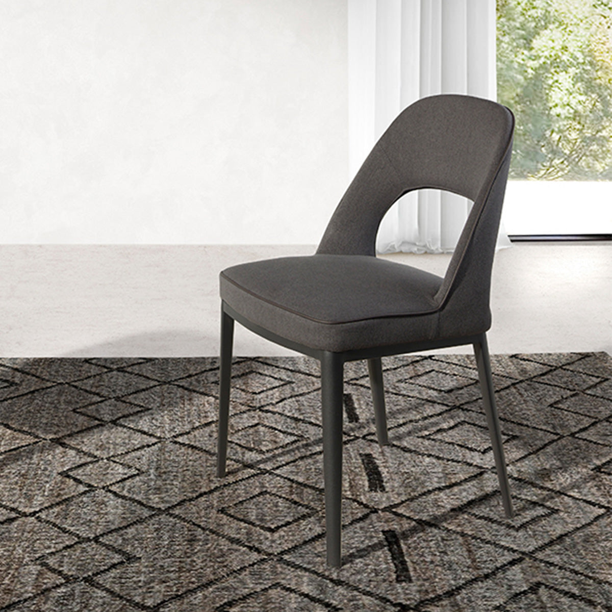 Sedia da pranzo dal design moderno rivestita in tessuto e struttura della gamba in acciaio epossidico verniciato nero. Una sedia originale che combina lo stile più moderno con il massimo del comfort e della funzionalità, grazie al suo sedile e allo schienale in schiuma di poliuretano da 25kg / m3. Un pezzo dell'ultima tendenza che non vorrai perderti nella tua sala da pranzo.