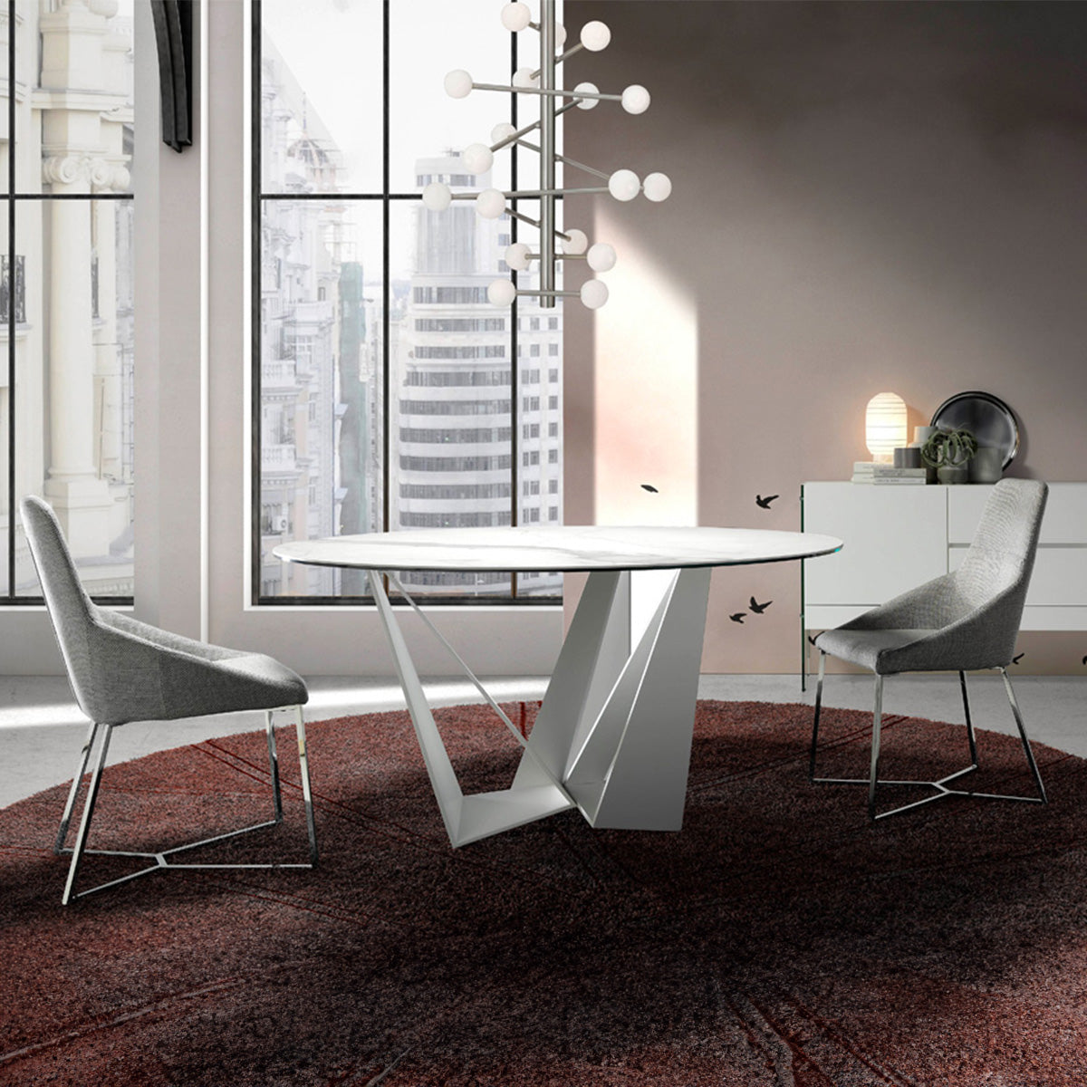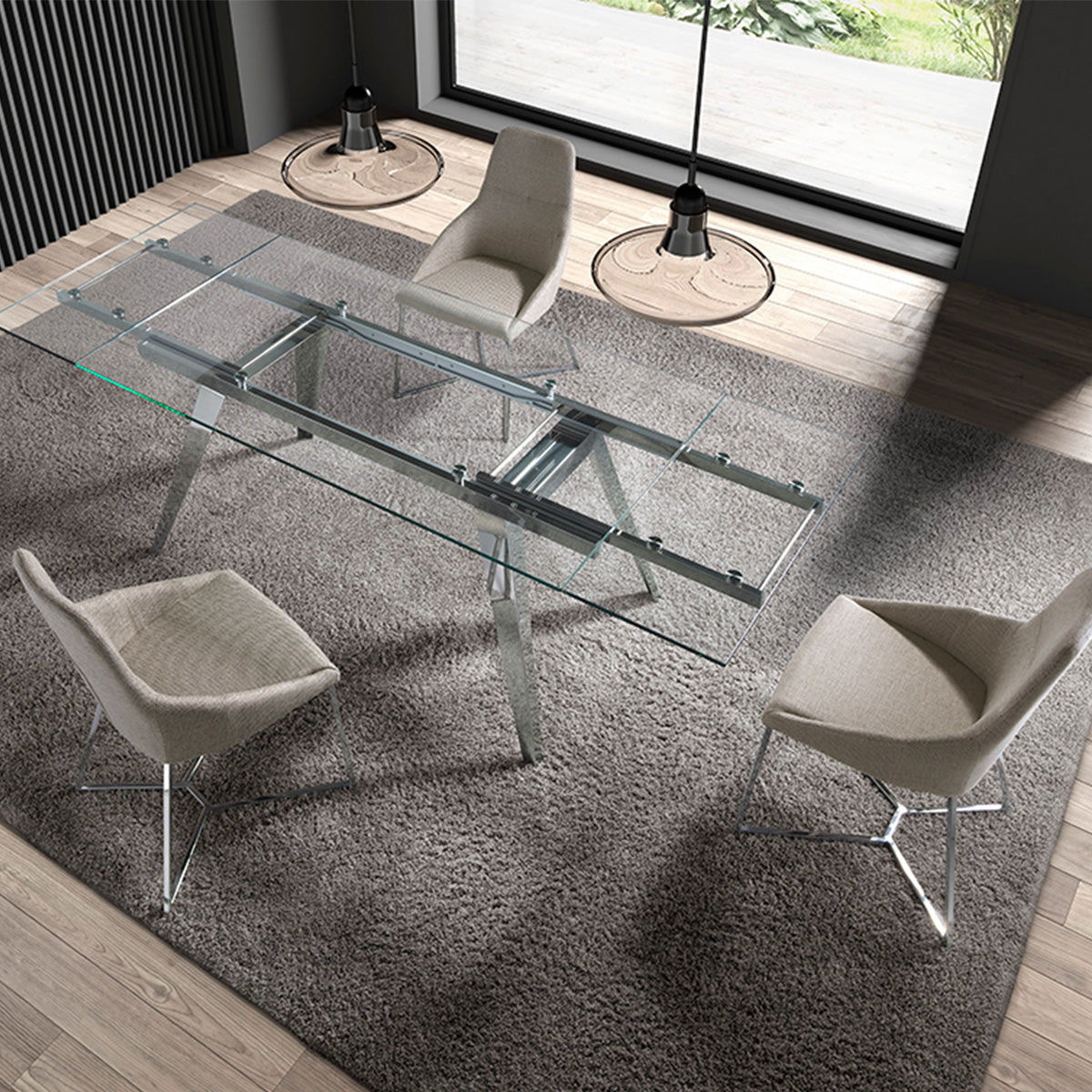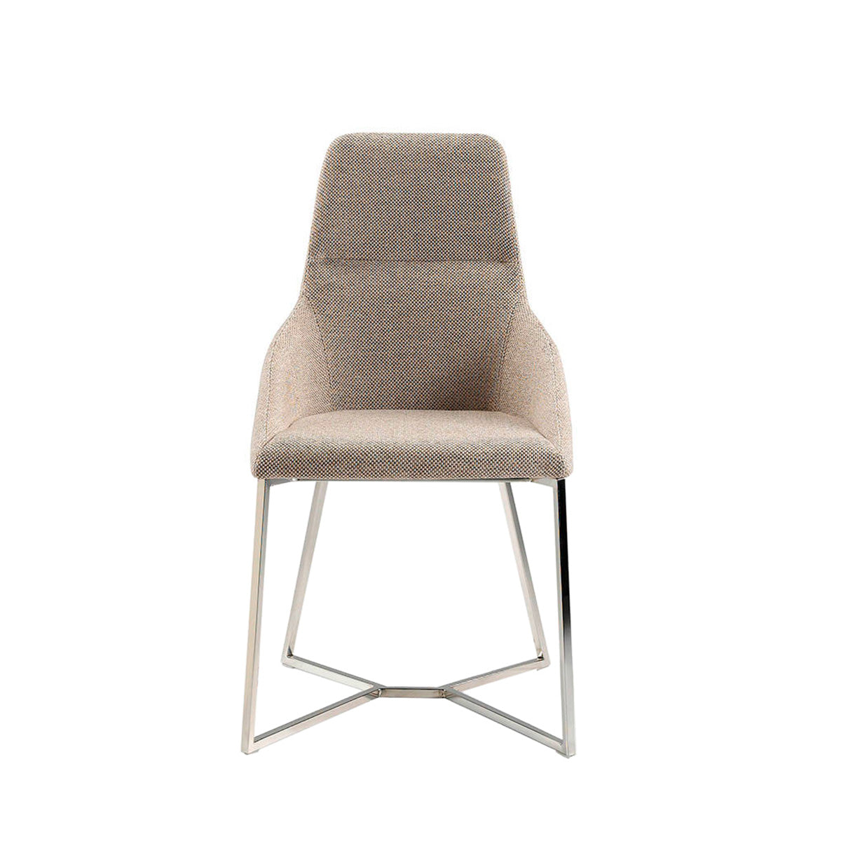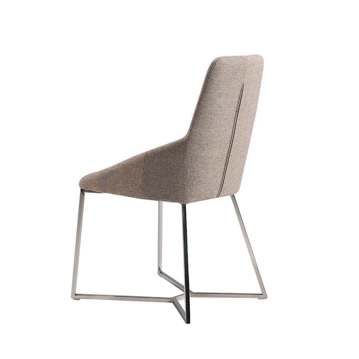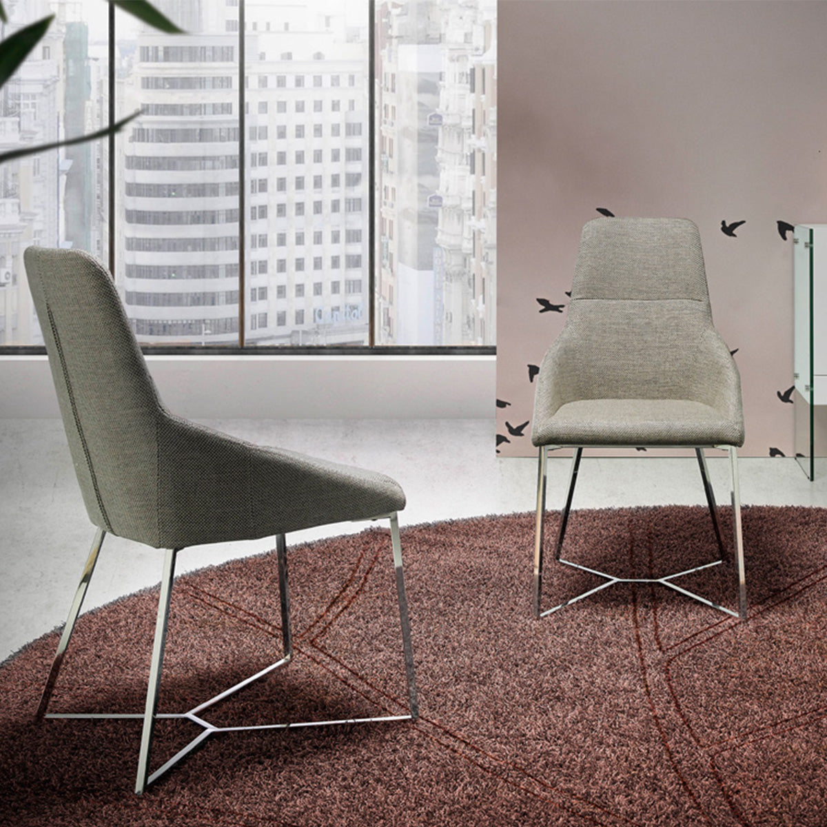 Sedia da pranzo dal design moderno rivestita in tessuto. Una sedia all'avanguardia e attuale con una struttura originale di gambe in acciaio inox cromato da 22 micron. Il suo sedile in schiuma di poliuretano da 25 kg / m3 e il design avvolgente, gli conferiscono quello stile unico, combinandolo con il massimo comfort.