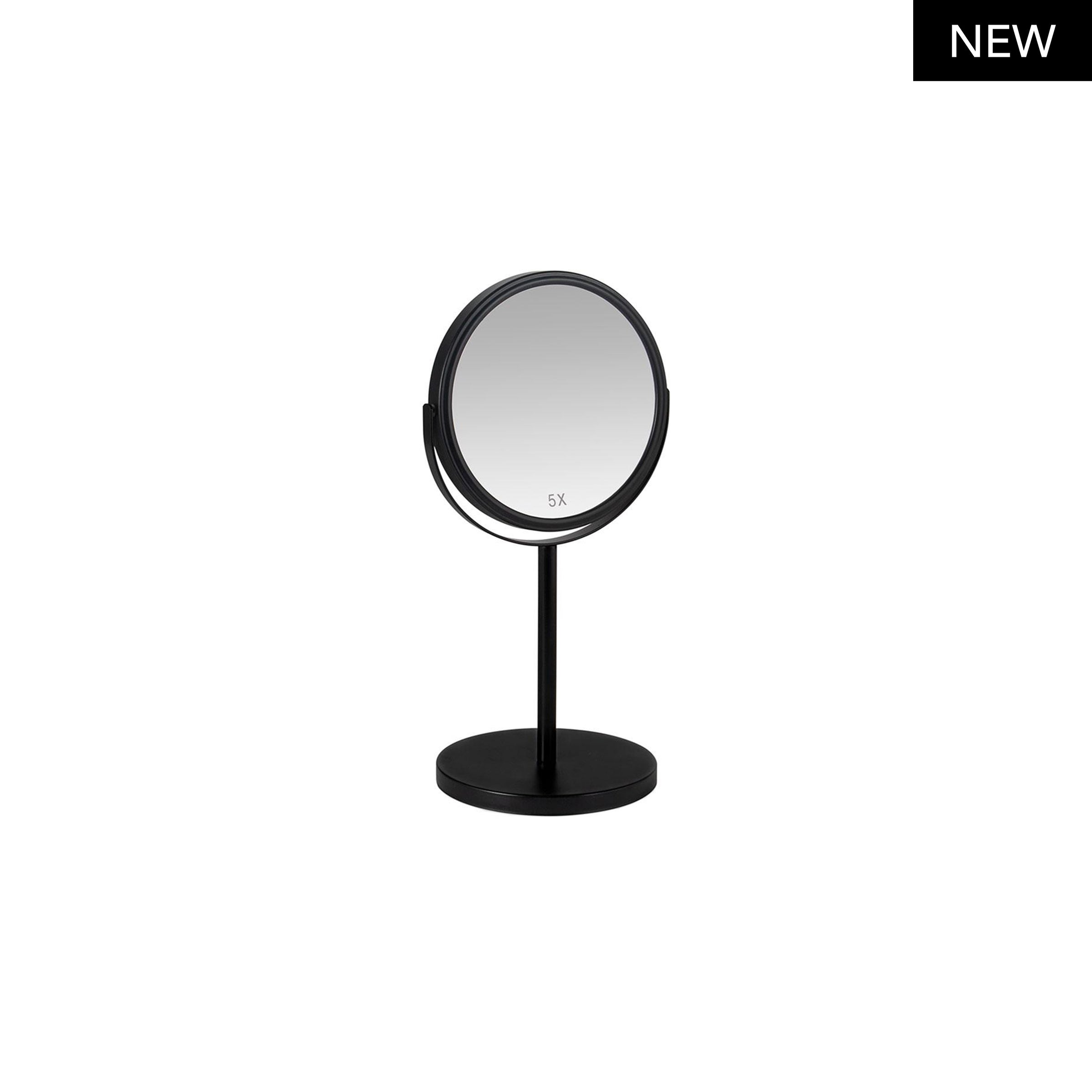 Specchio da bagno nero con ingrandimento x5. Con base rotonda e struttura reclinabile. Da un lato è un normale specchio cosmetico e dall'altro offre una riflessione 5x.