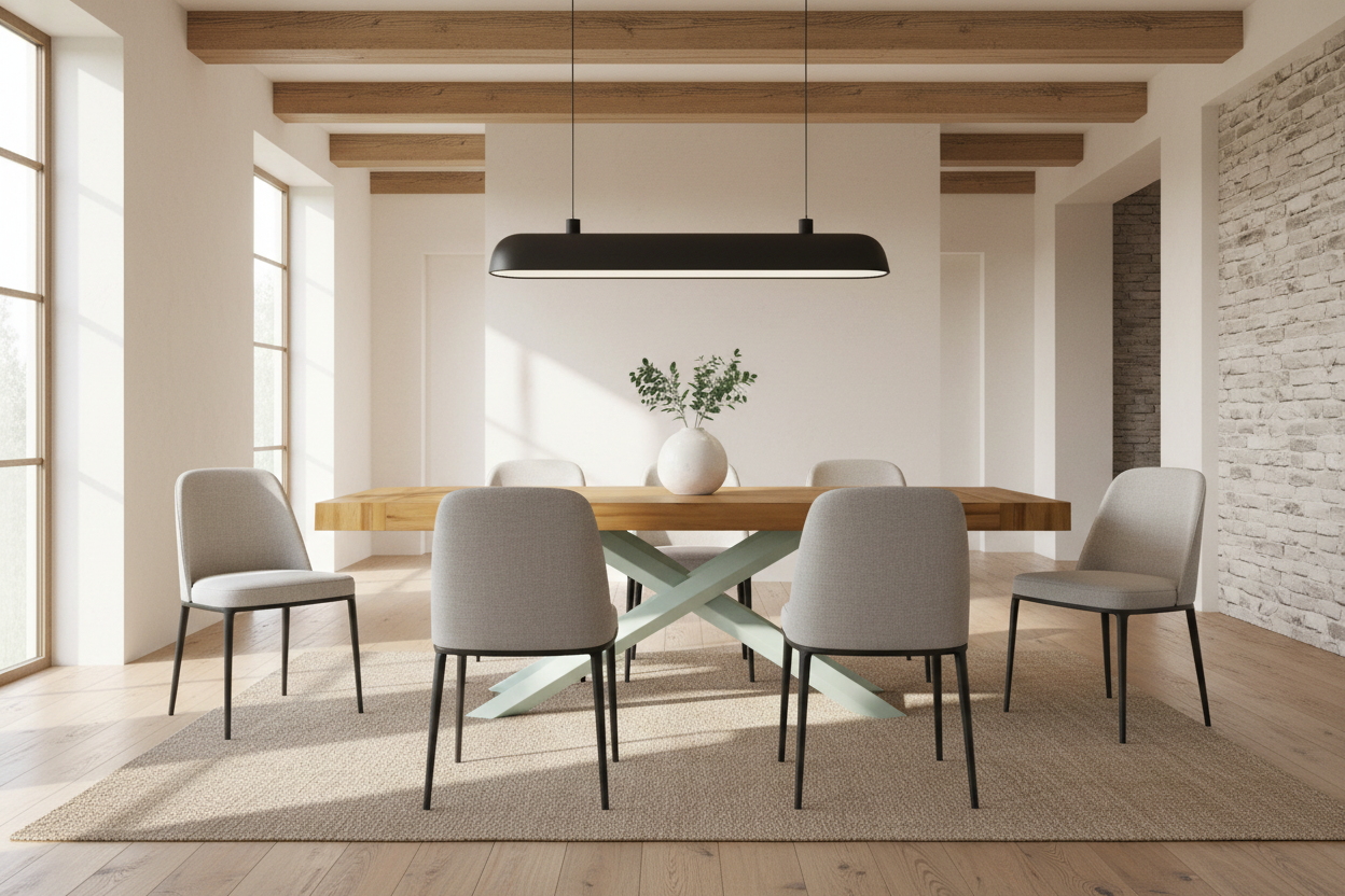 Il consiglio di Wolfem: Per esaltare il carattere ibrido di ROMA, tra rustico e moderno, abbinalo a sedie dalle linee essenziali. Funziona magnificamente sia con sedie in legno che ne richiamano il piano, sia con sedute in metallo o polipropilene bianco per un look total white e luminoso.