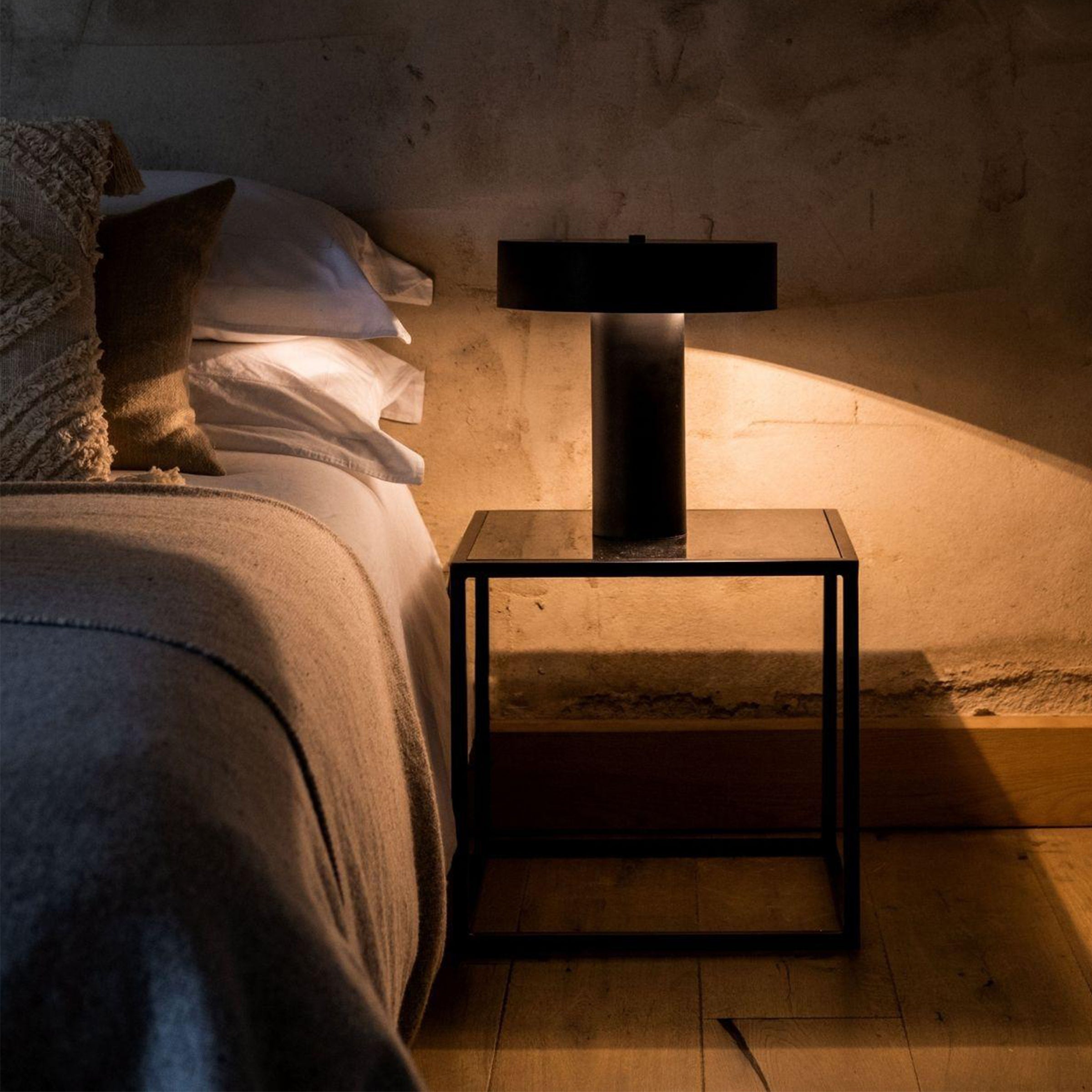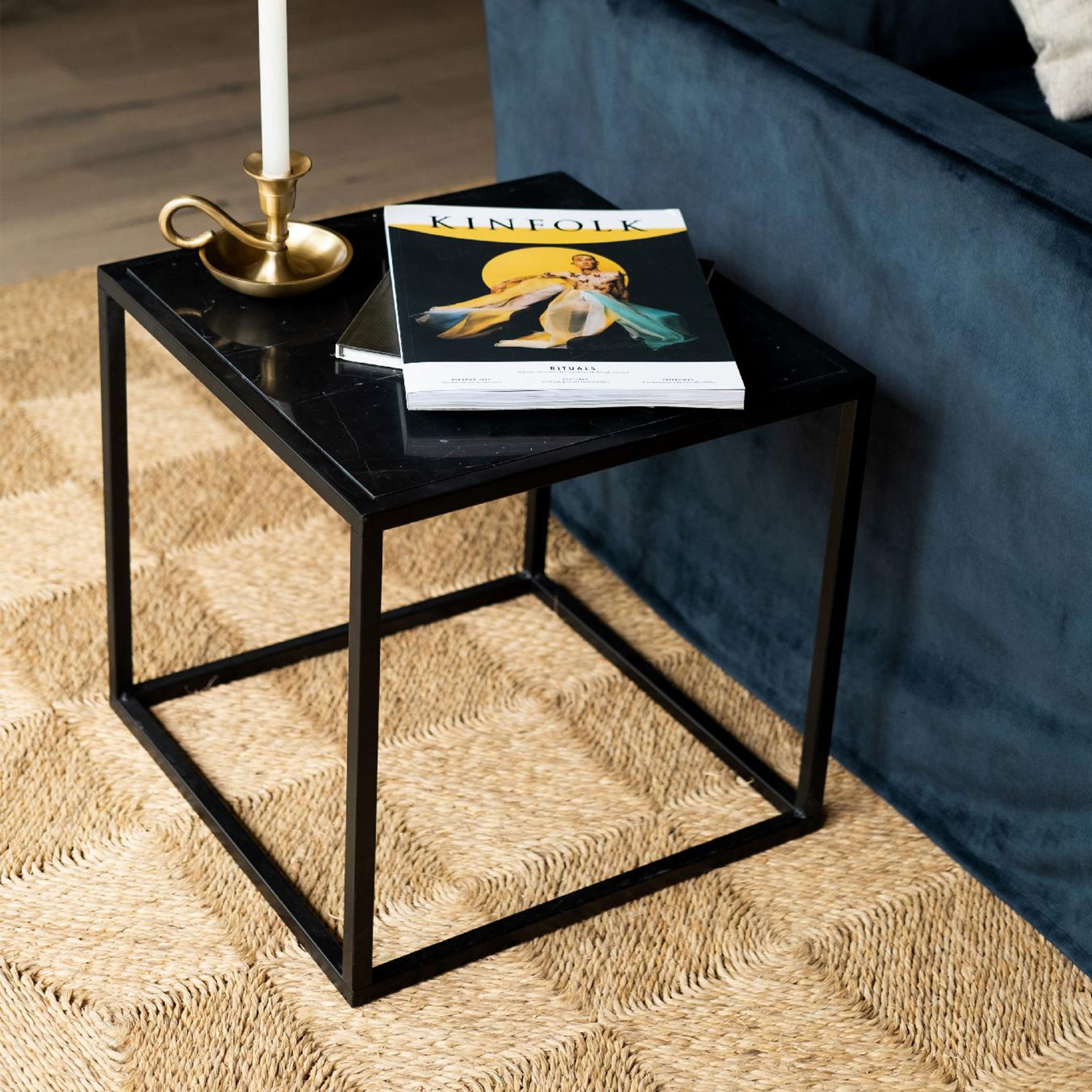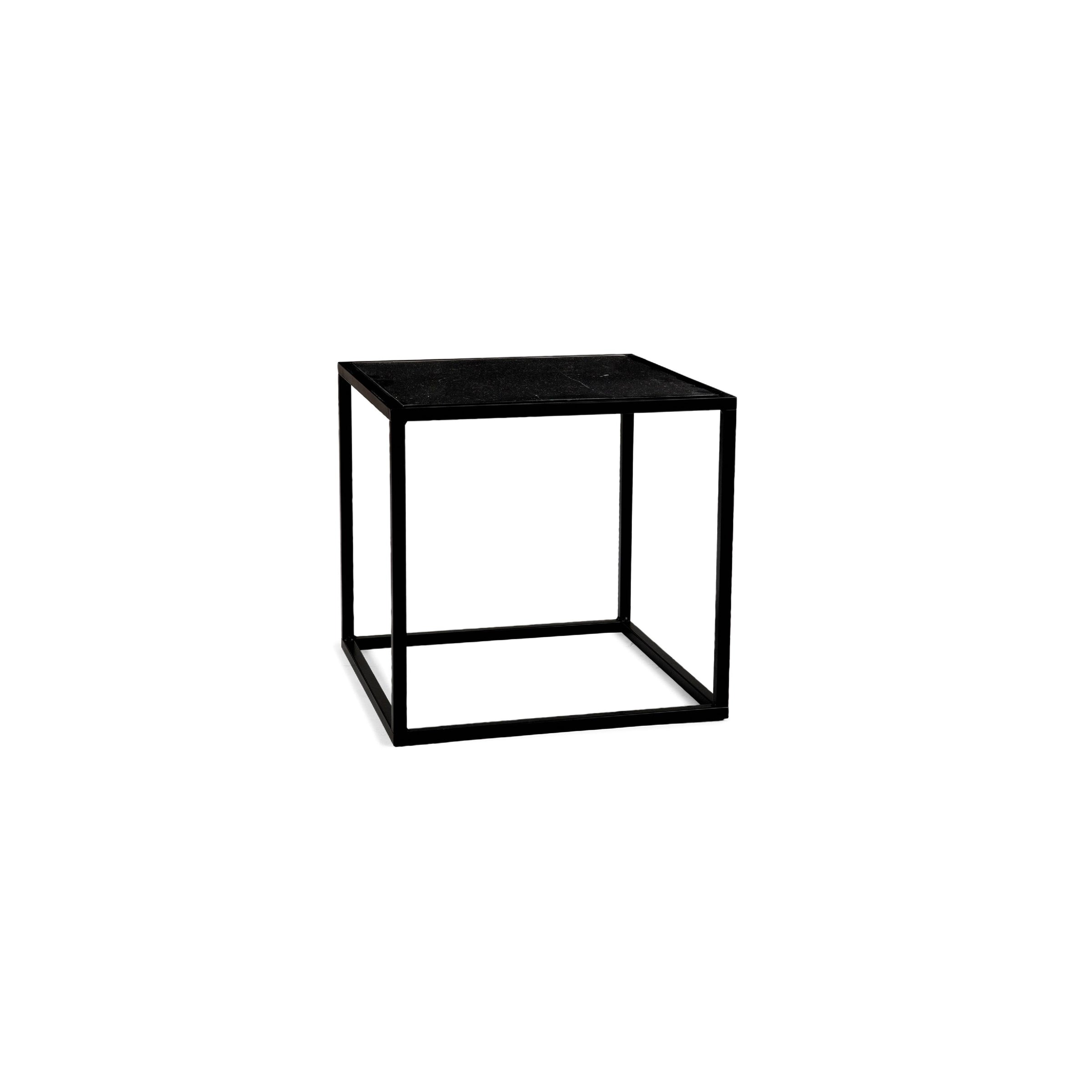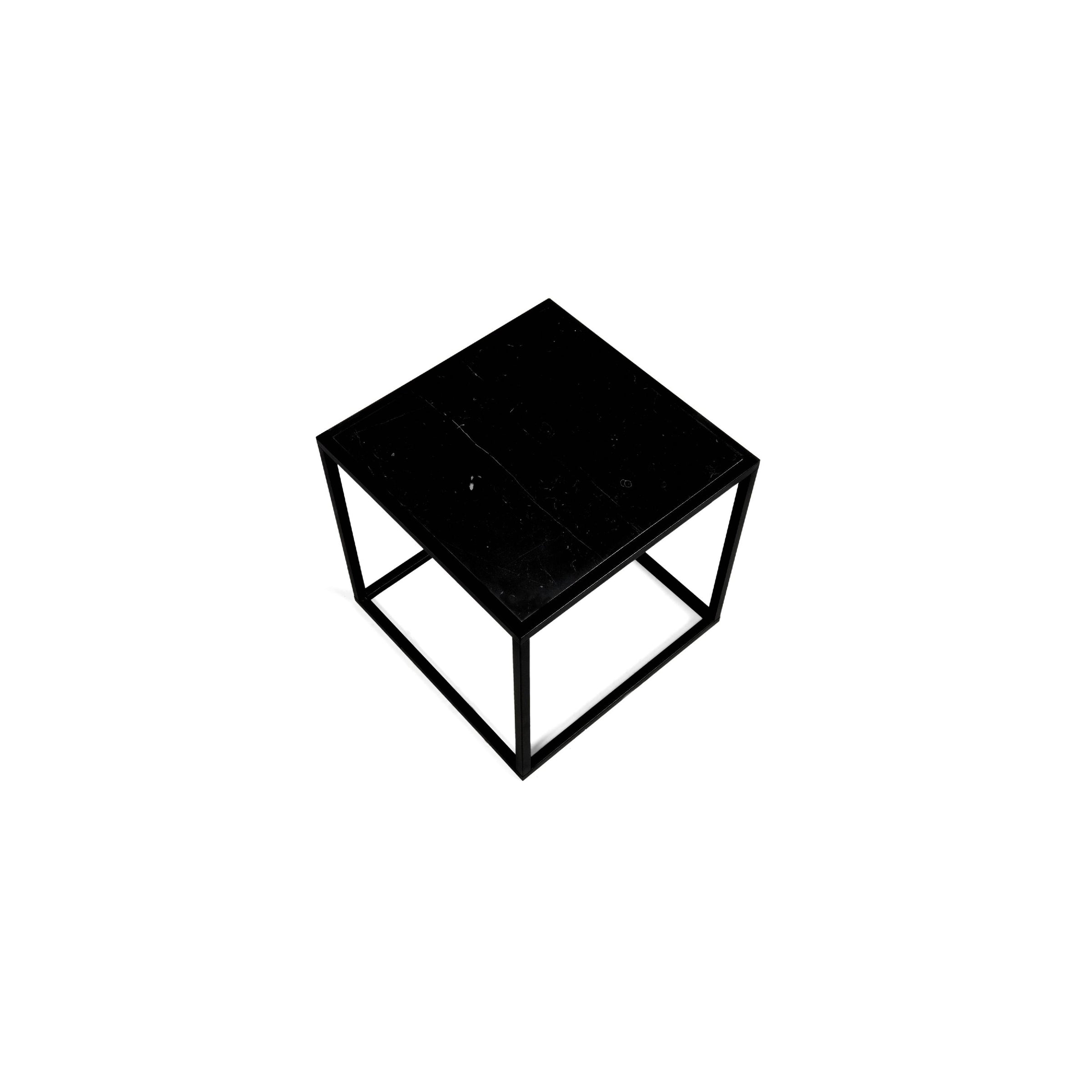 Il tavolino CALISTO quadrato ha la forma di un cubo, La struttura è in metallo nero, mentre il piano è in marmo nero e ha una finitura lucida. È ideale da posizionare a lato del divano, come comodino o in qualsiasi altro angolo della casa.