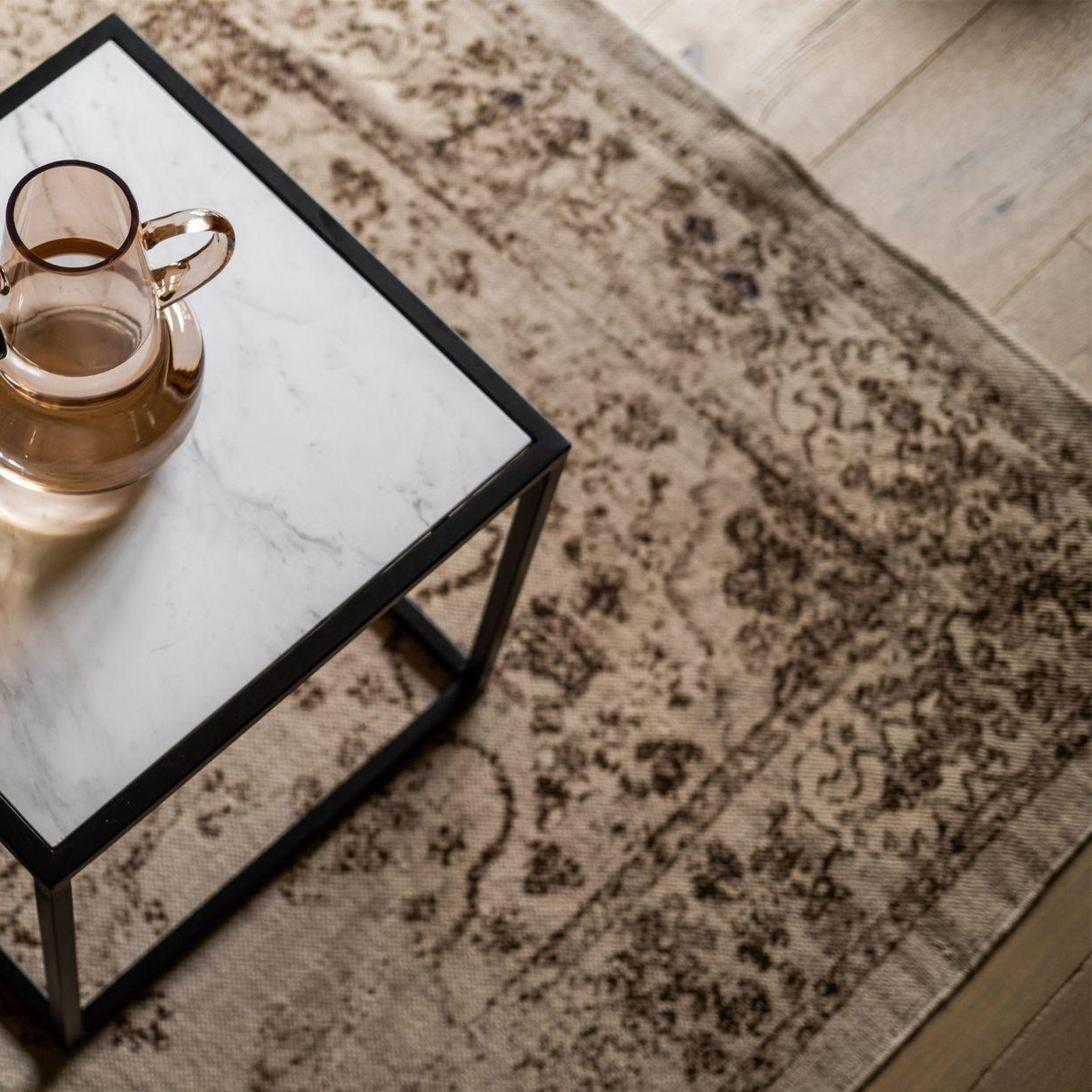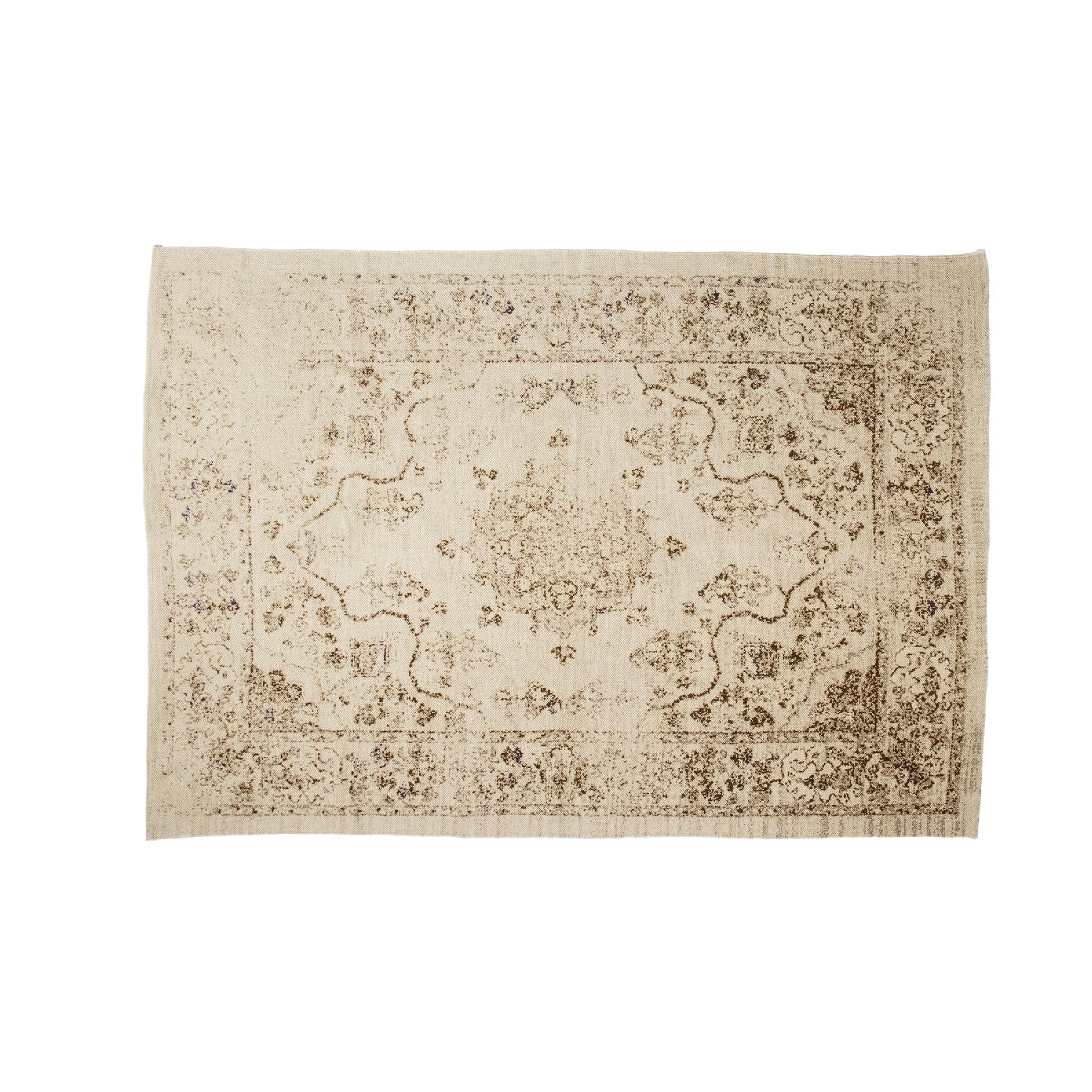 Questo tappeto è realizzato in cotone e presenta una stampa di tipo persiano con un tocco vissuto. Si tratta di un tappeto elegante dai toni neutri : beige, marrone e nero, abbinabile sia in un soggiorno in stile classico che moderno.