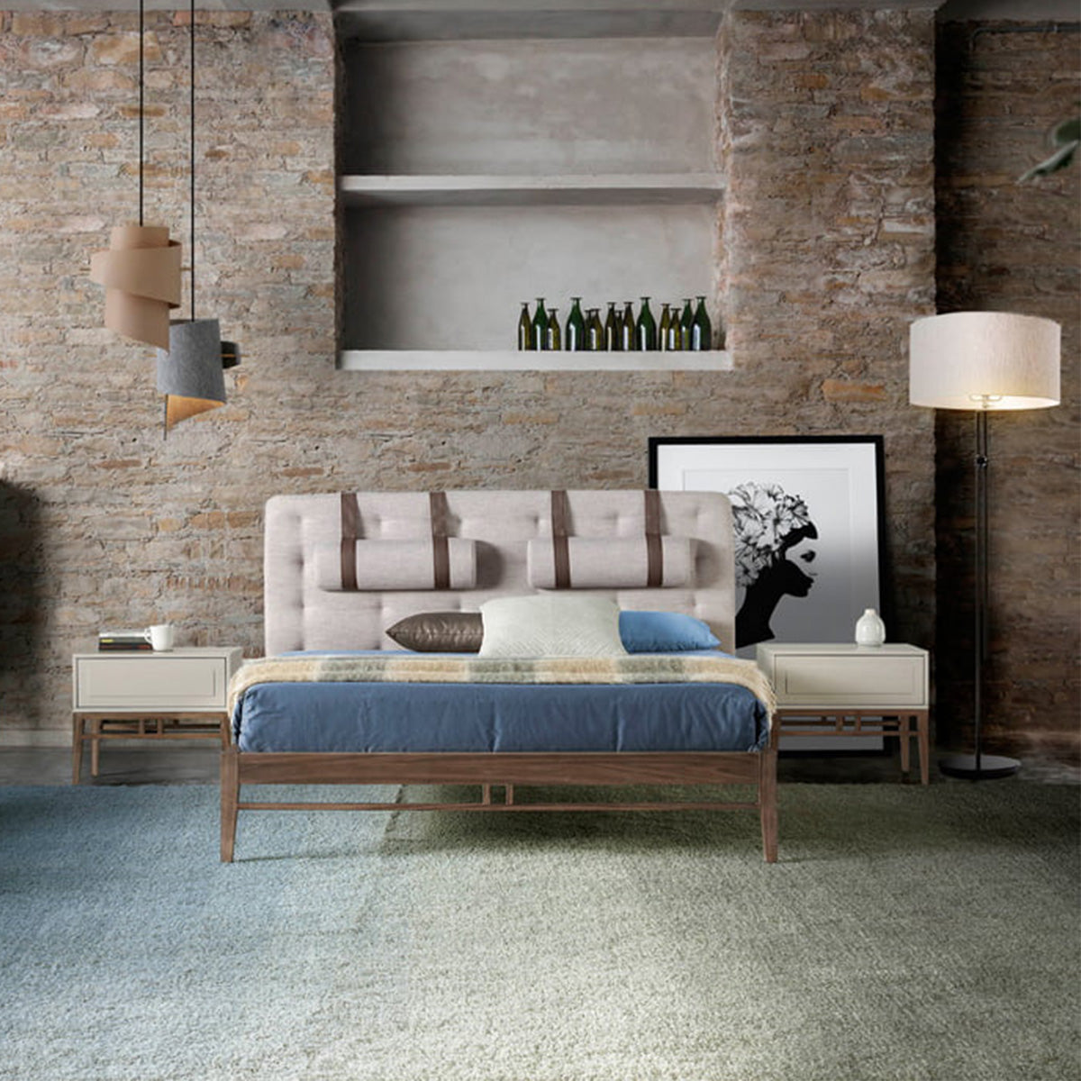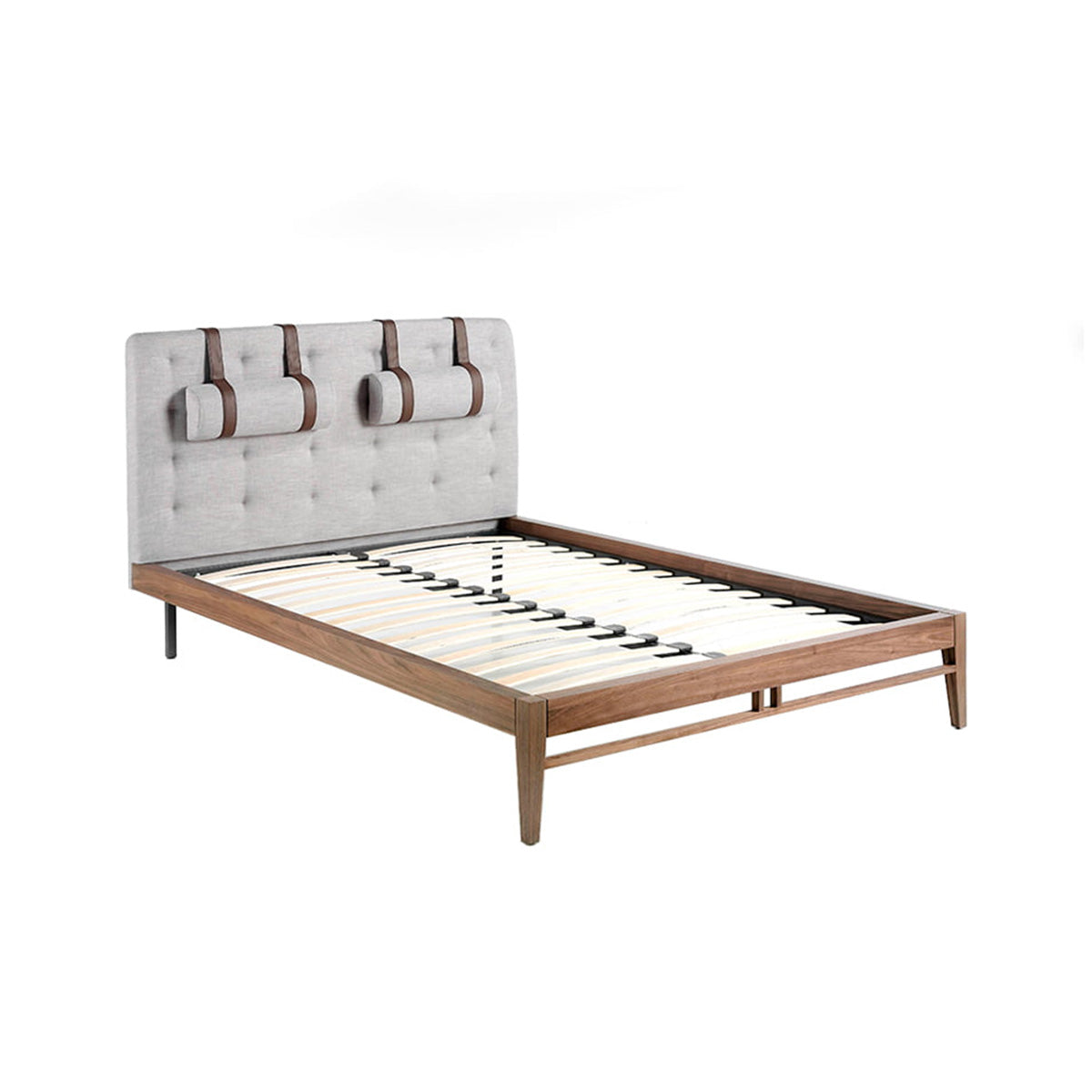 Letto matrimoniale dal design moderno con struttura in legno impiallacciato noce naturale 0,5mm rivestito in tessuto grigio, con un'originale testiera capitonné in stile elegante e con due poggiatesta con listelli in similpelle color cioccolato inclusi, con i quali potrai creare uno spazio accogliente e personale, senza tralasciare il massimo comfort, grazie all'imbottitura in poliuretano espanso da 25kg/m3. Include una comoda base letto a più doghe in legno di pino. Perfetto per il tuo riposo!