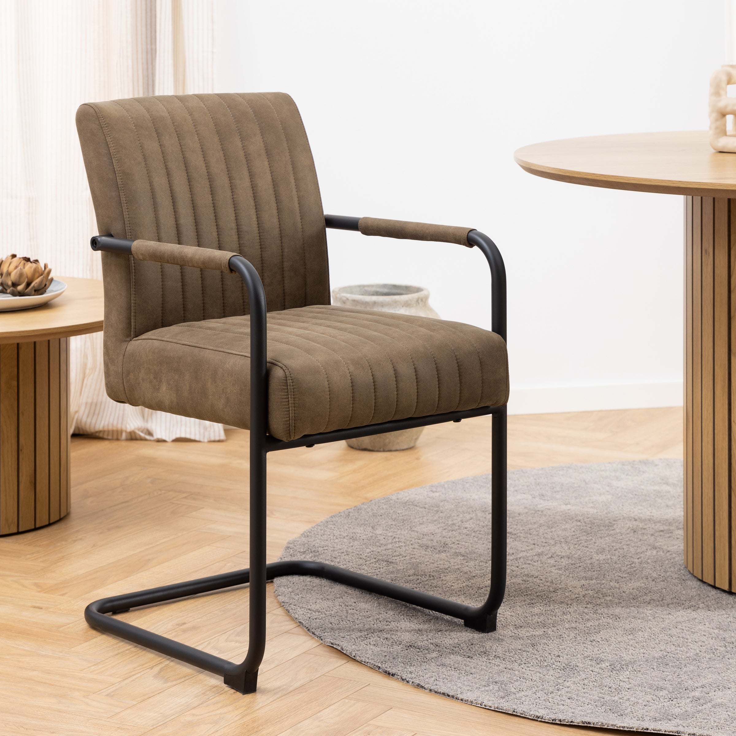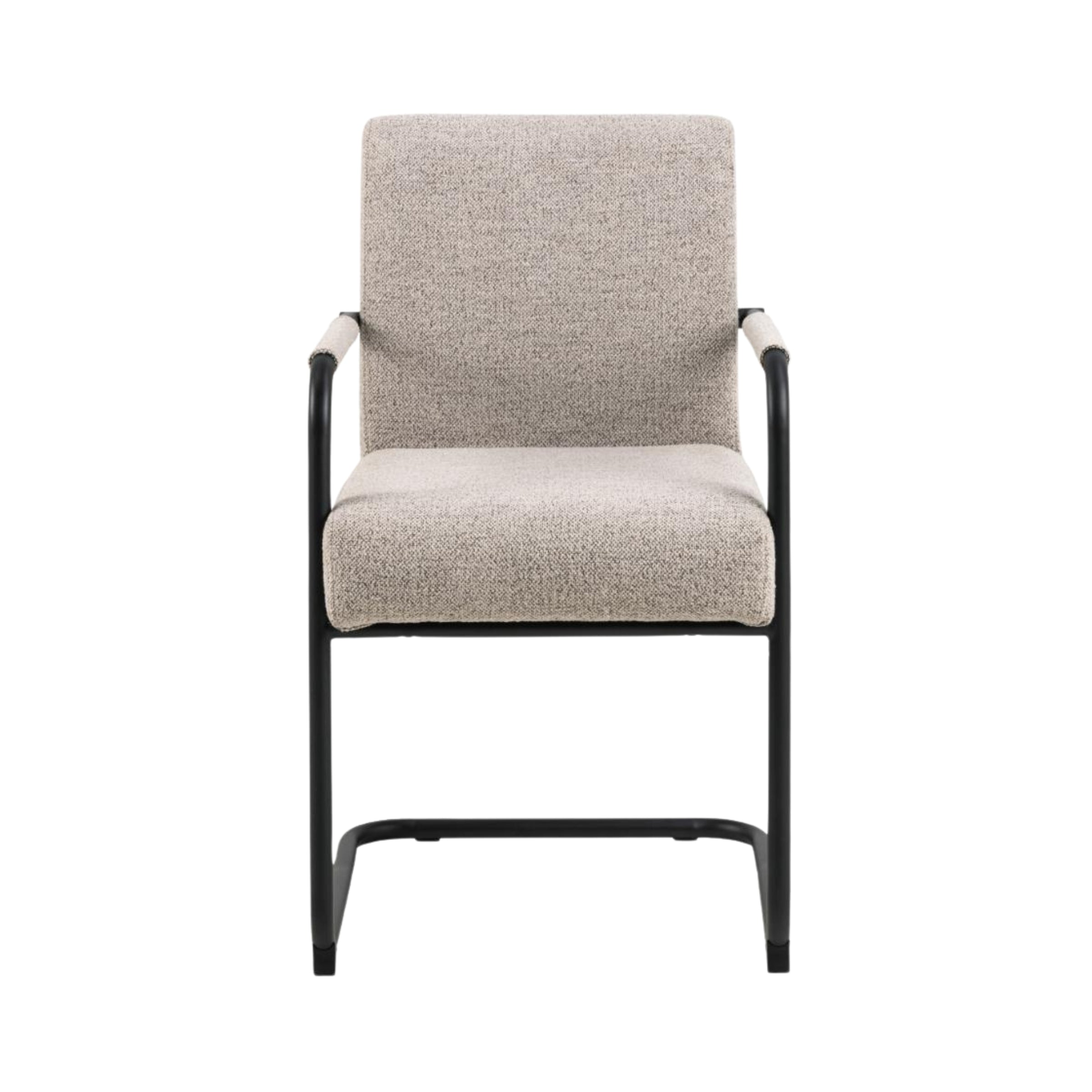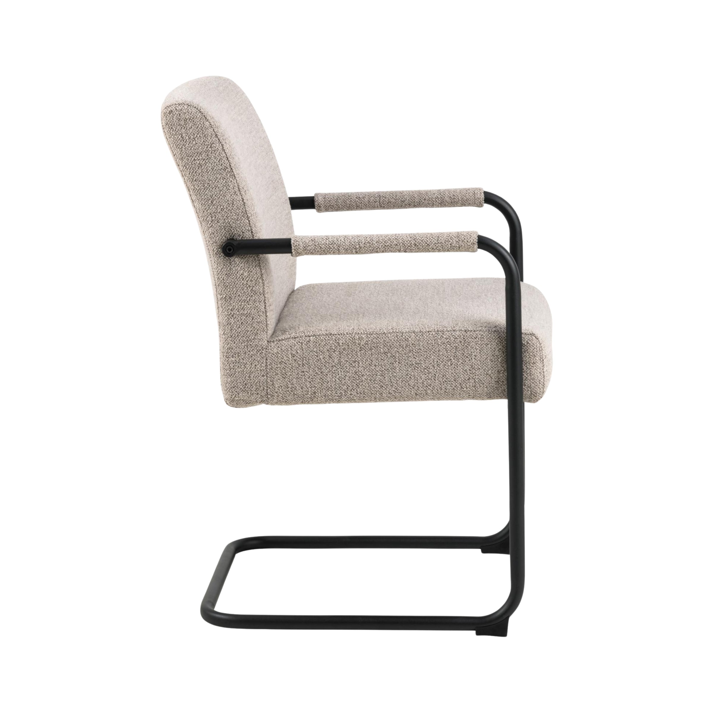 Questa sedia moderna si distingue per il suo design unico, caratterizzato da una base oscillante in metallo nero che garantisce stabilità e un tocco distintivo. Il rivestimento in tessuto non solo è incredibilmente morbido al tatto, ma aggiunge anche una sofisticata texture che si adatta a qualsiasi arredamento.