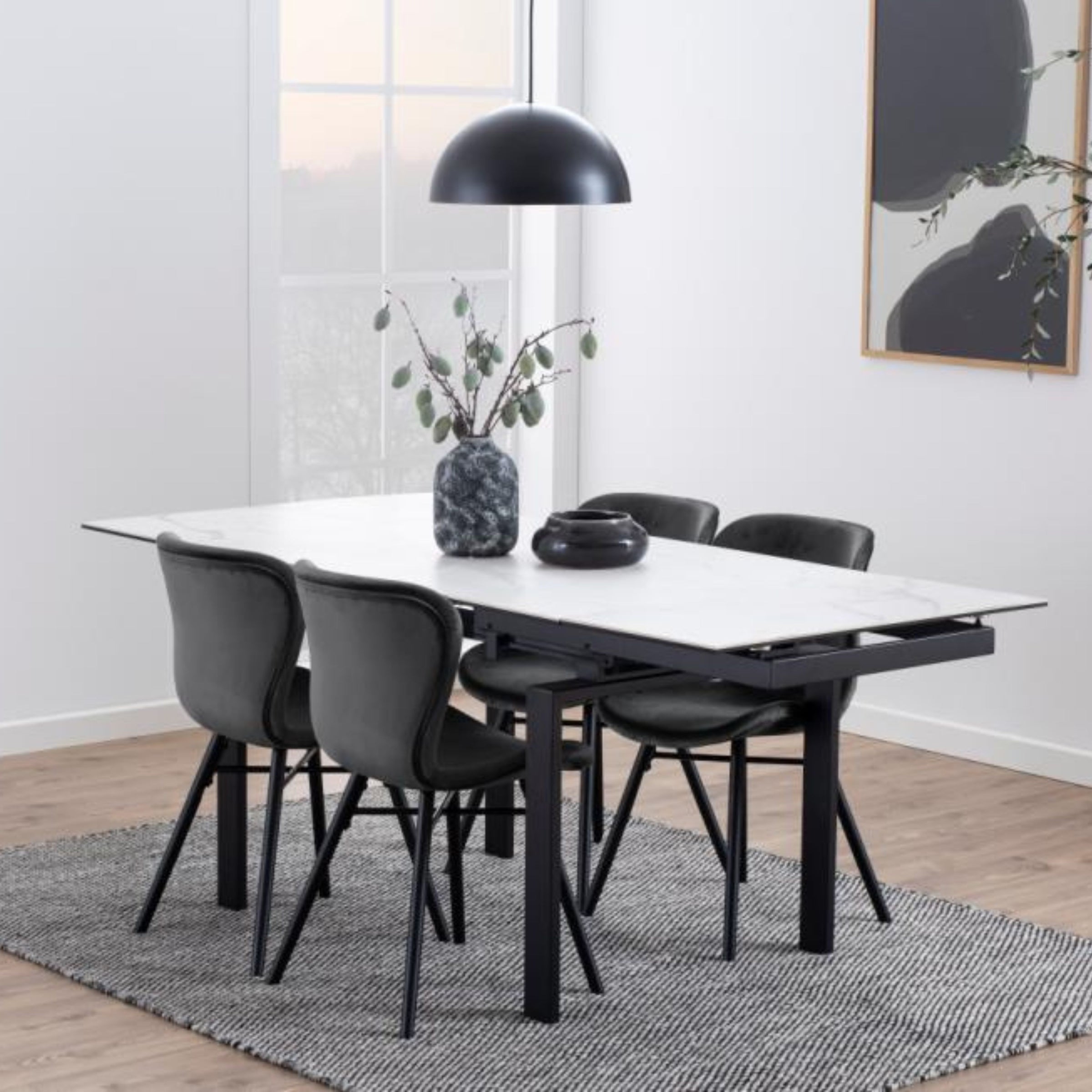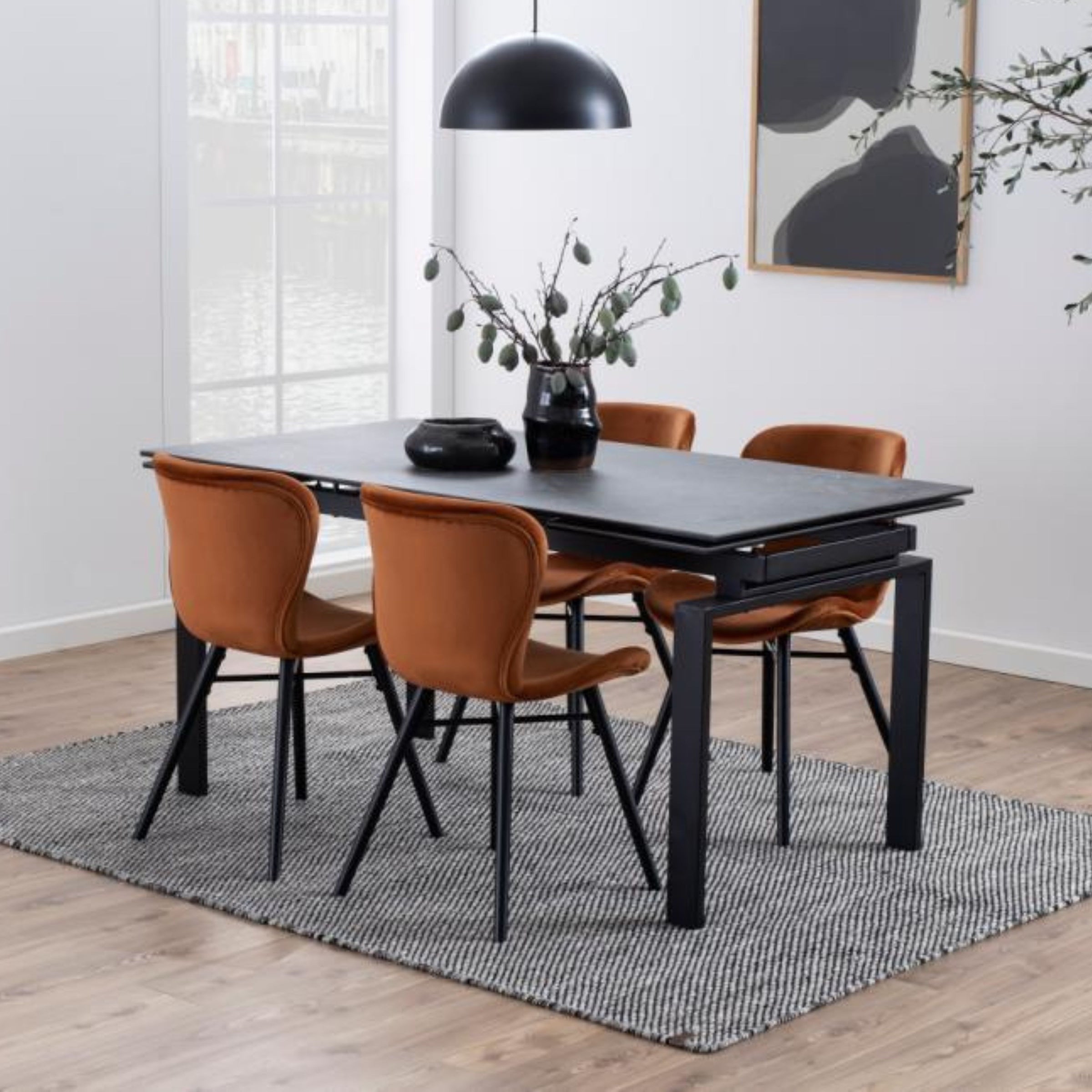 La stabilità è garantita dalle robuste gambe in legno laccato nero, che non solo offrono una base solida, ma aggiungono anche un'atmosfera calda alla tua sala.
