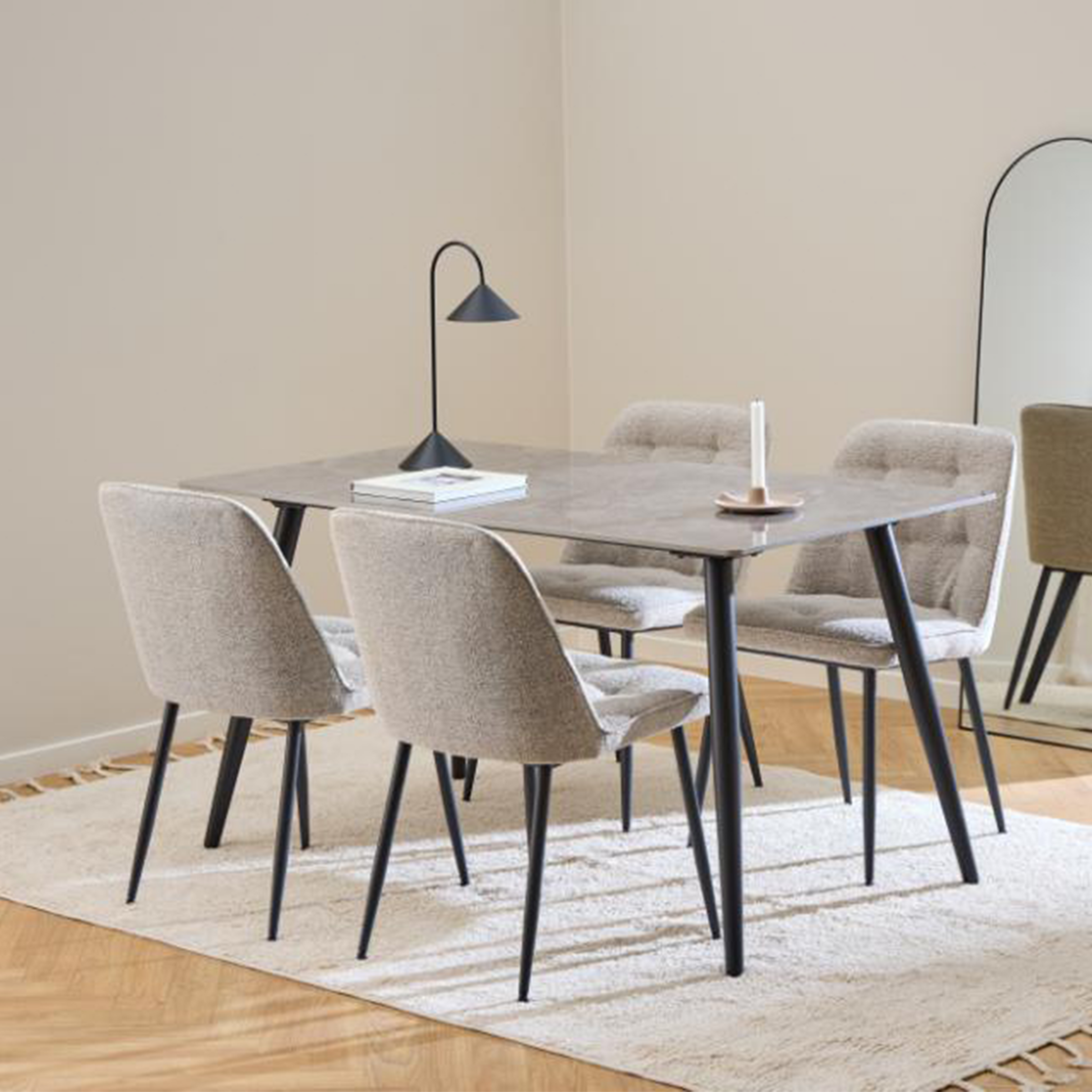 Aggiungi un tocco di eleganza senza tempo alla tua zona pranzo con questa sedia dal design sofisticato e funzionale. La sua silhouette slanciata si fonde con la ricca texture del tessuto simil-bouclé, offrendo non solo un'esperienza tattile unica, ma anche un look caldo e accogliente.