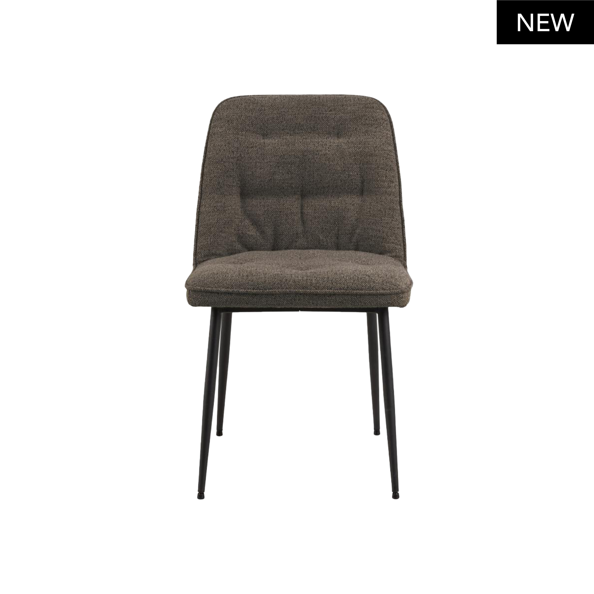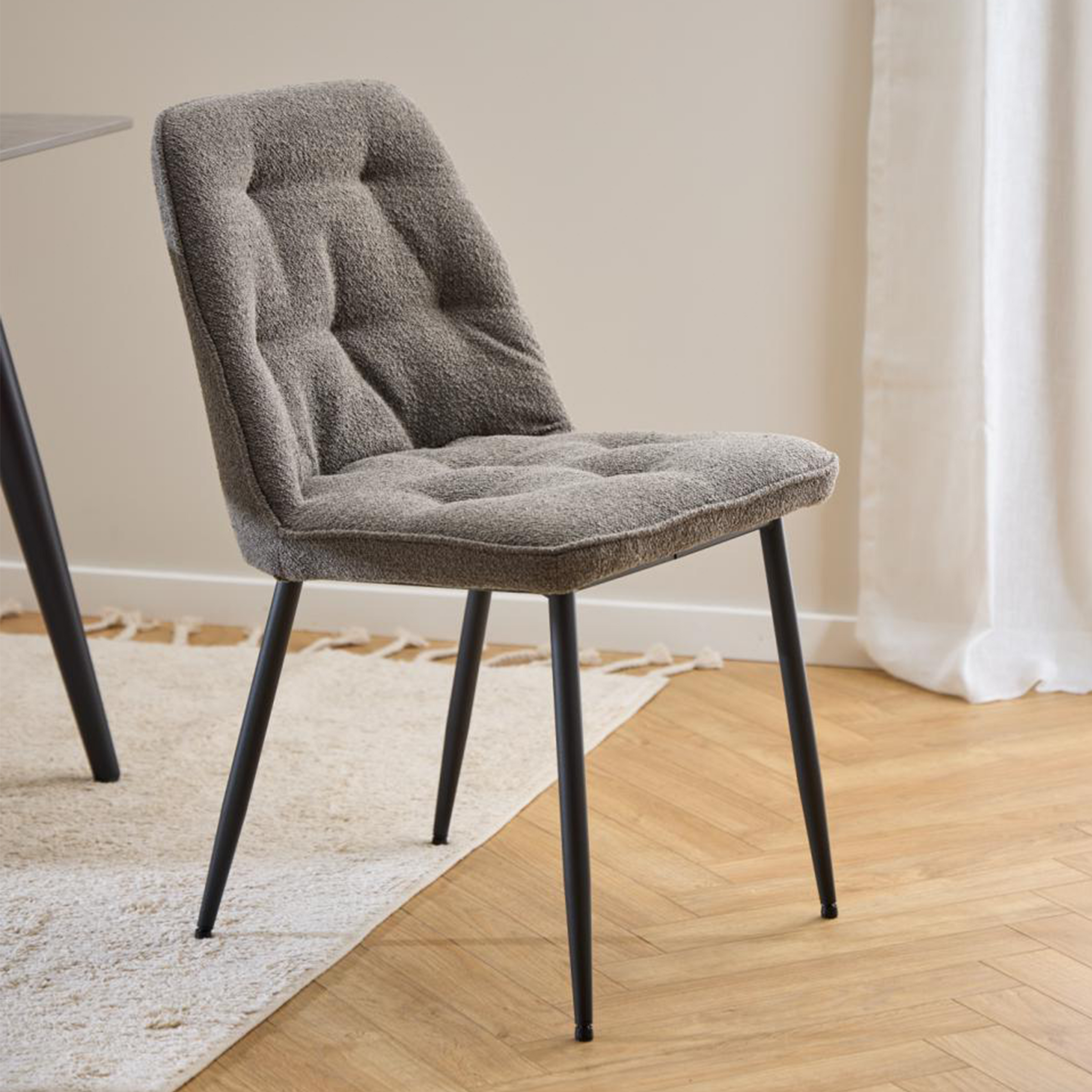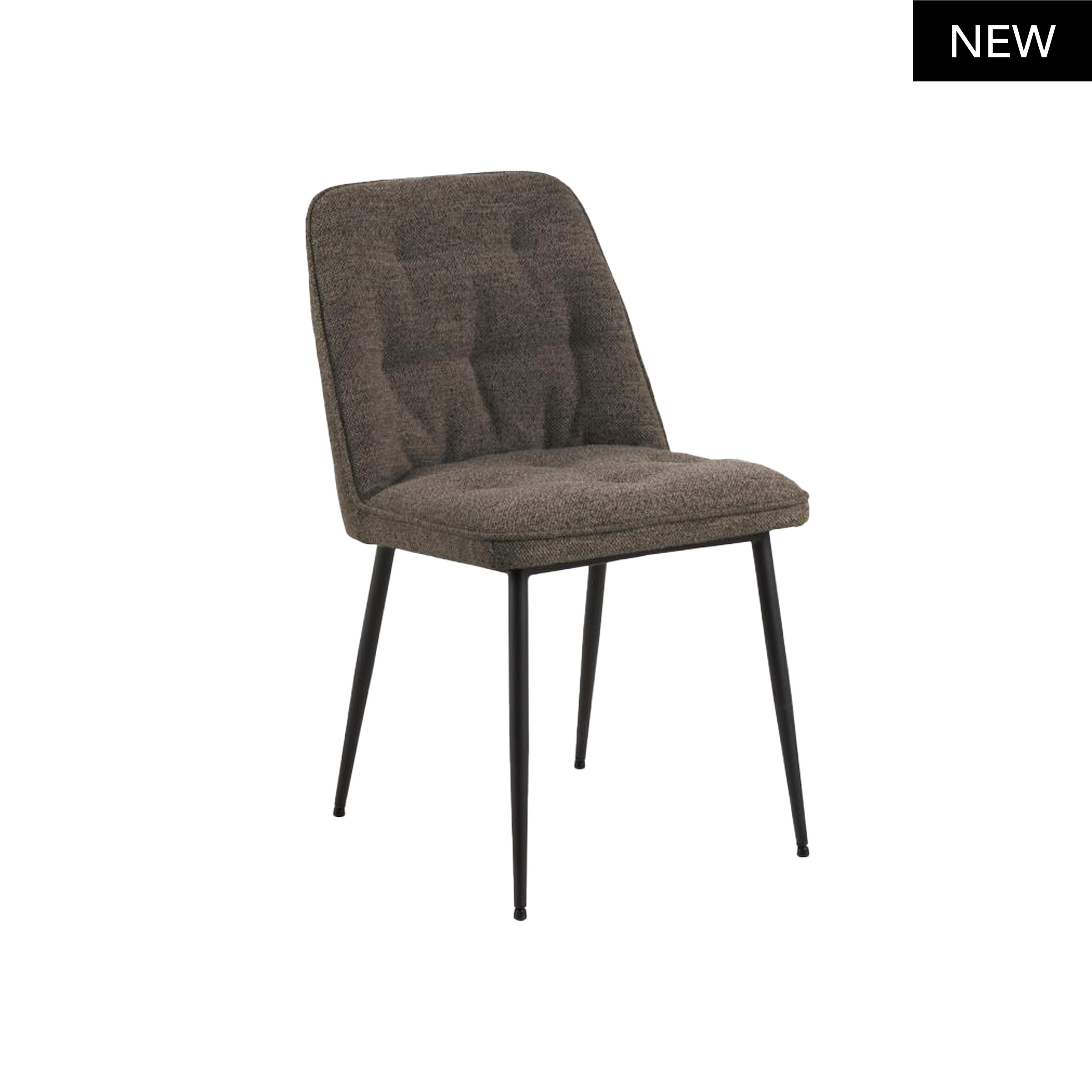 I dettagli trapuntati sul rivestimento aggiungono un ulteriore livello di profondità e carattere, rendendo questa sedia un vero pezzo d'arredamento. Le gambe rotonde in acciaio nero, con la loro finitura ruvida verniciata a polvere, garantiscono stabilità e un contrasto visivo che esalta la morbidezza del tessuto.