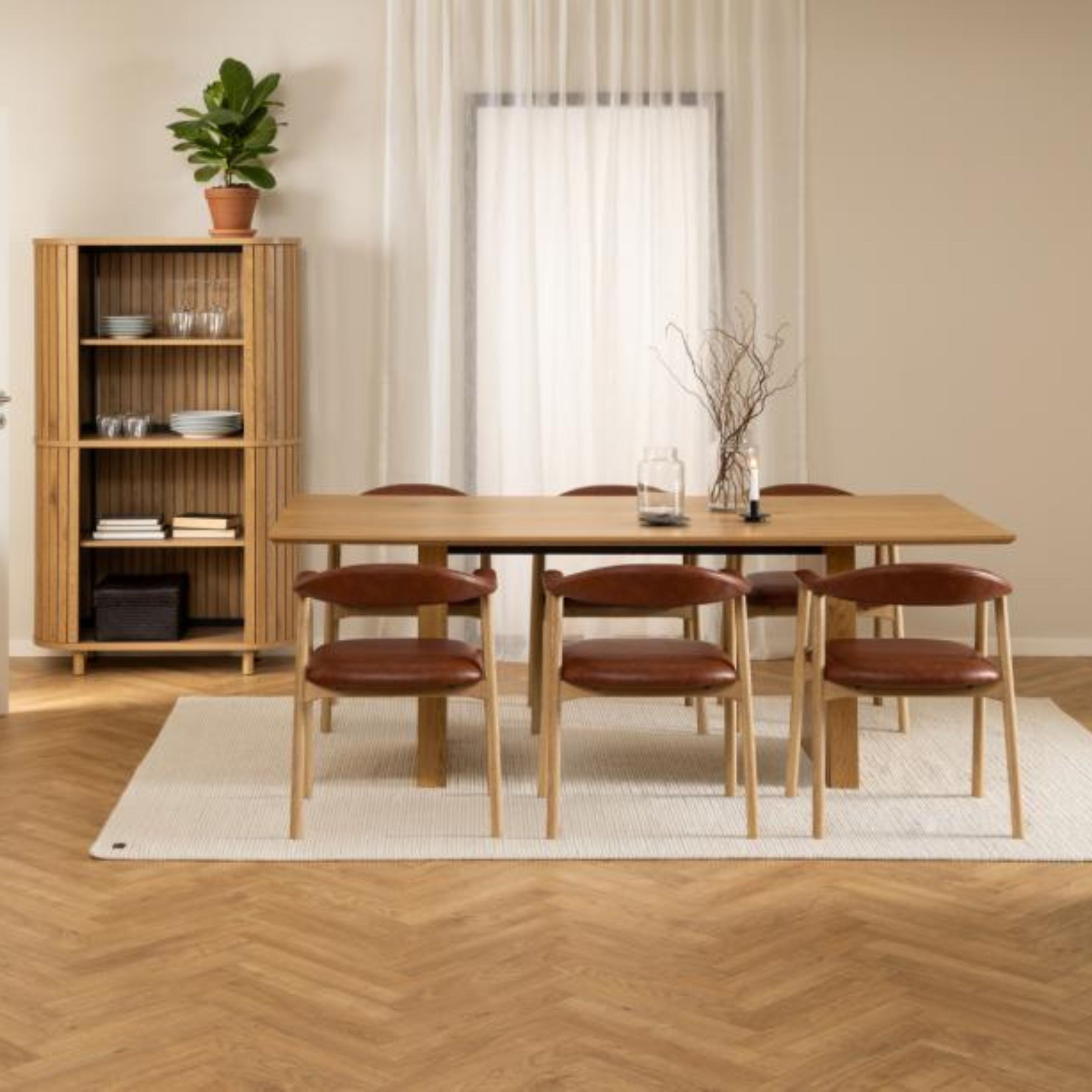 Realizzata in rovere oliato, la struttura non solo è solida e resistente, ma emana anche un calore naturale che rende ogni spazio più accogliente. Il tocco finale è dato dalla seduta rivestita in un morbido tessuto o ecopelle, che invita al relax e garantisce un comfort eccezionale per le tue cene in famiglia o con gli amici.