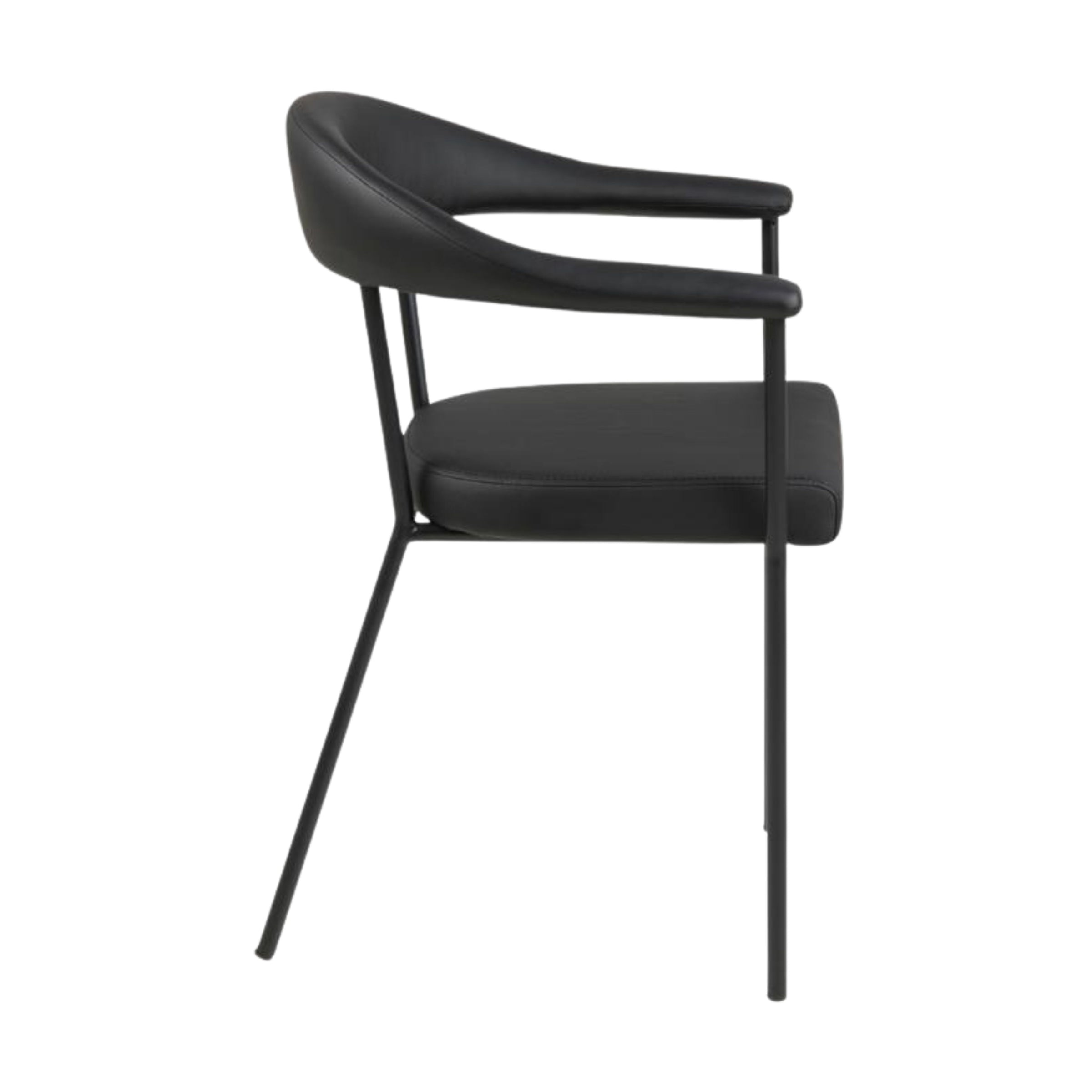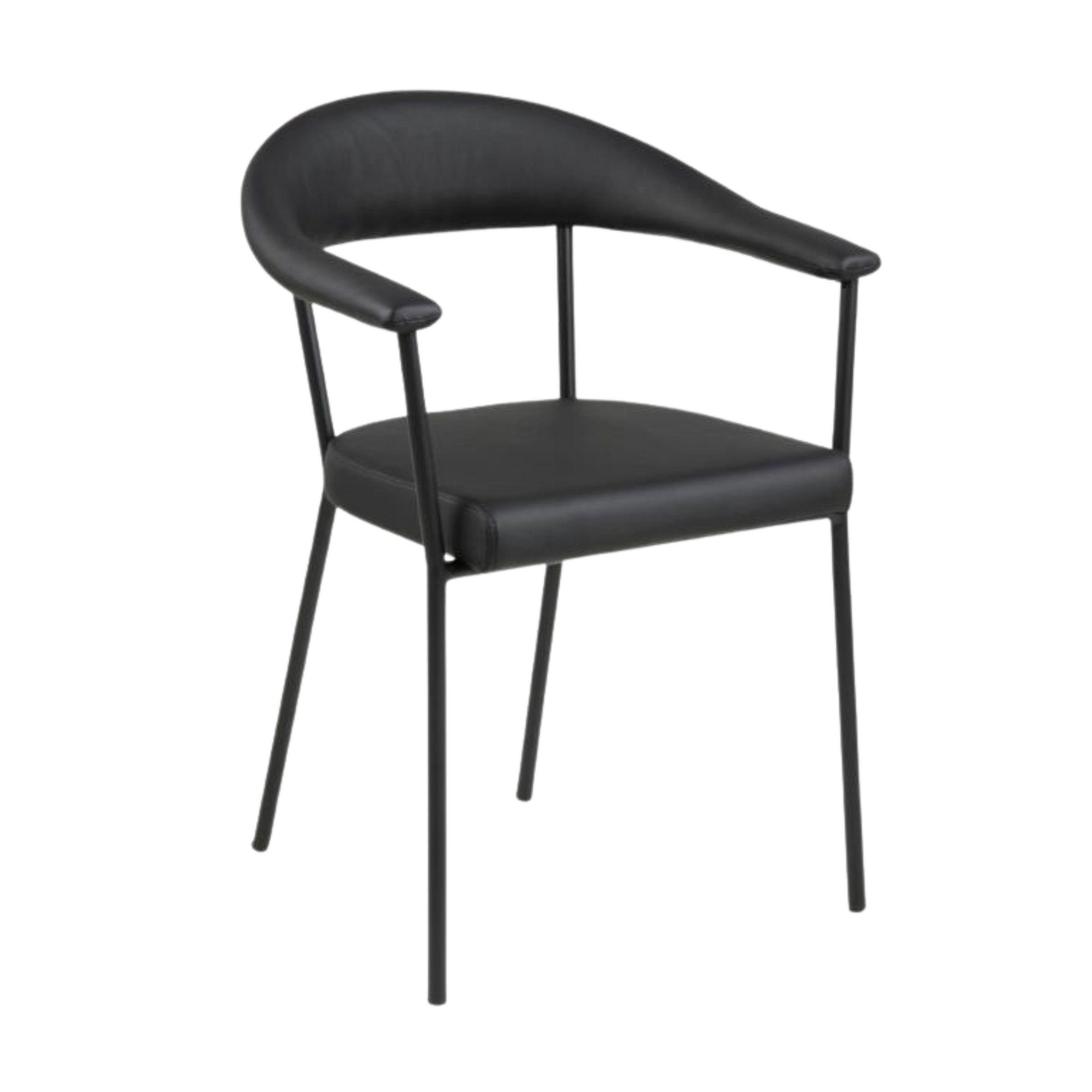 La seduta, ispirata all'essenza del minimalismo, è un vero gioiello di design. Rivestita in morbida ecopelle nera, avvolge delicatamente la struttura metallica, creando un contrasto visivo raffinato. Lo schienale e i braccioli sono leggermente curvi per offrire il massimo comfort, rendendo questa sedia perfetta non solo per i pasti, ma anche per i lunghi momenti di relax e conversazione.