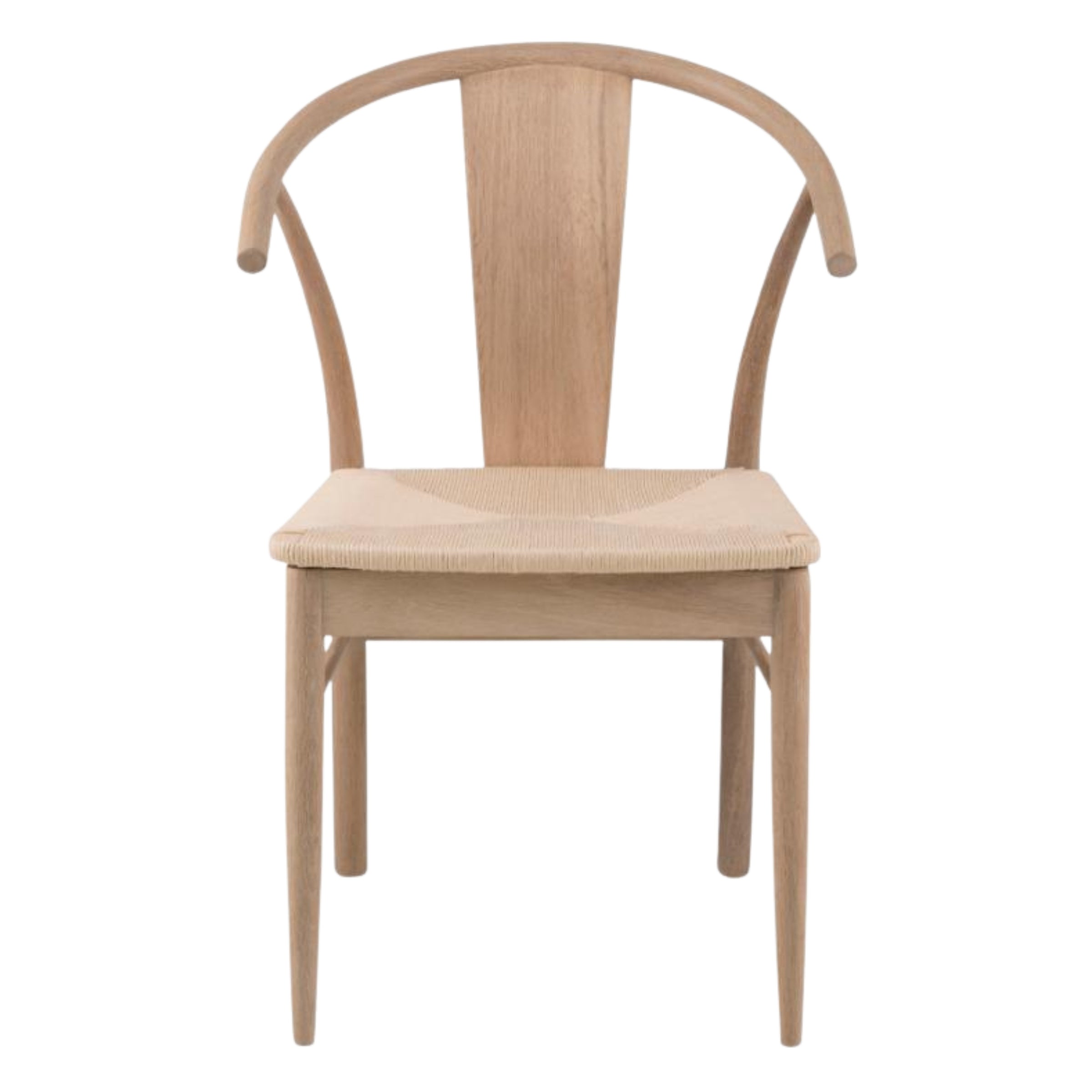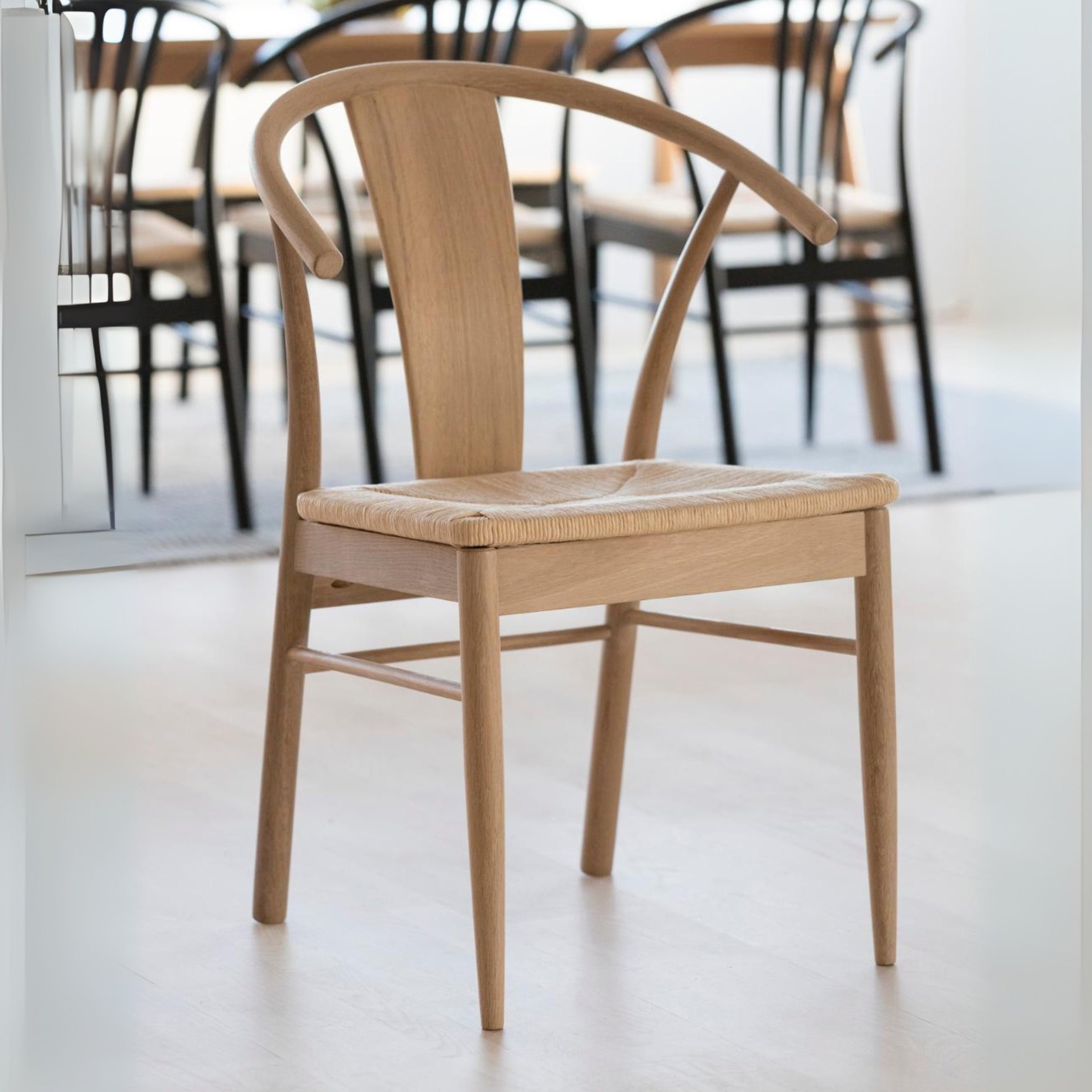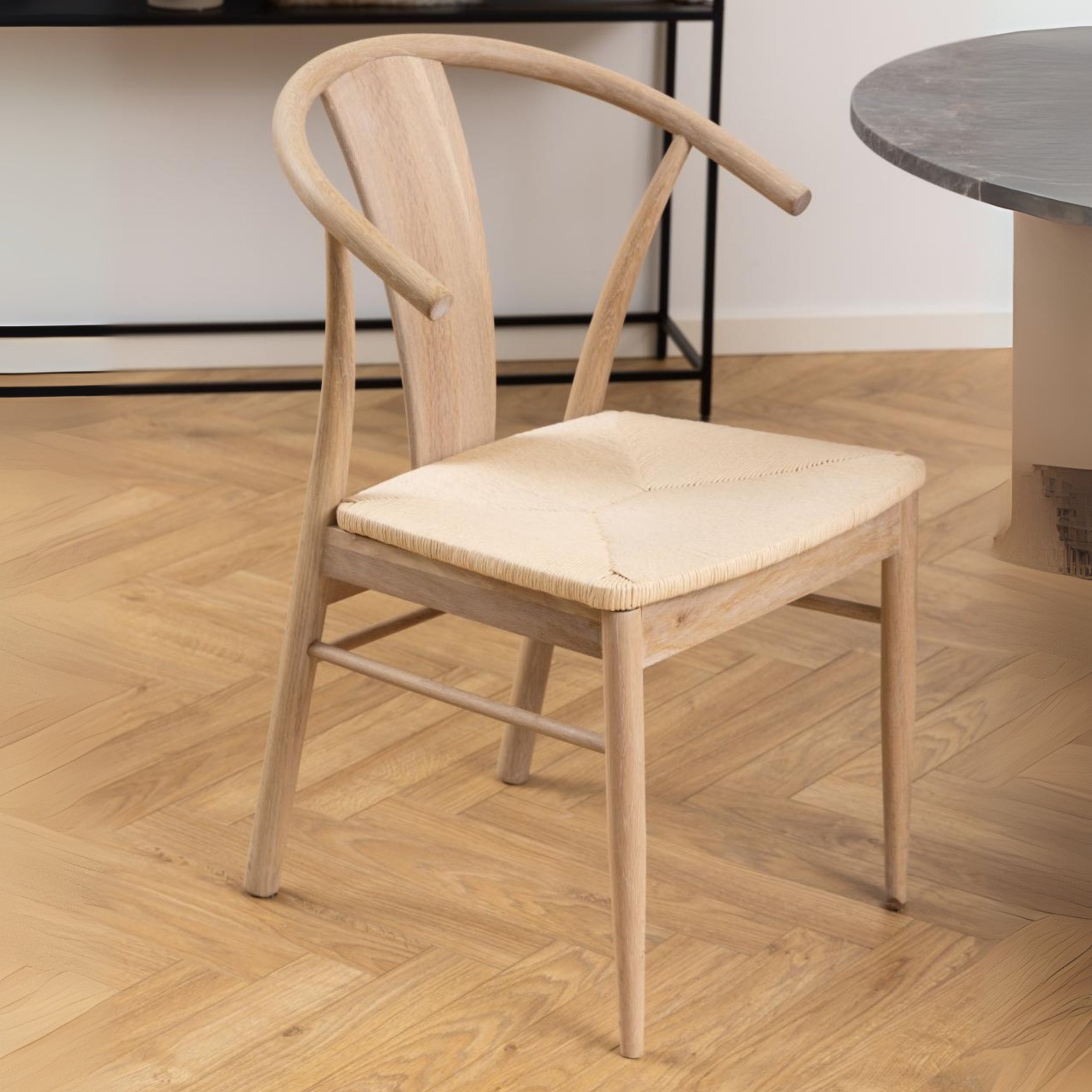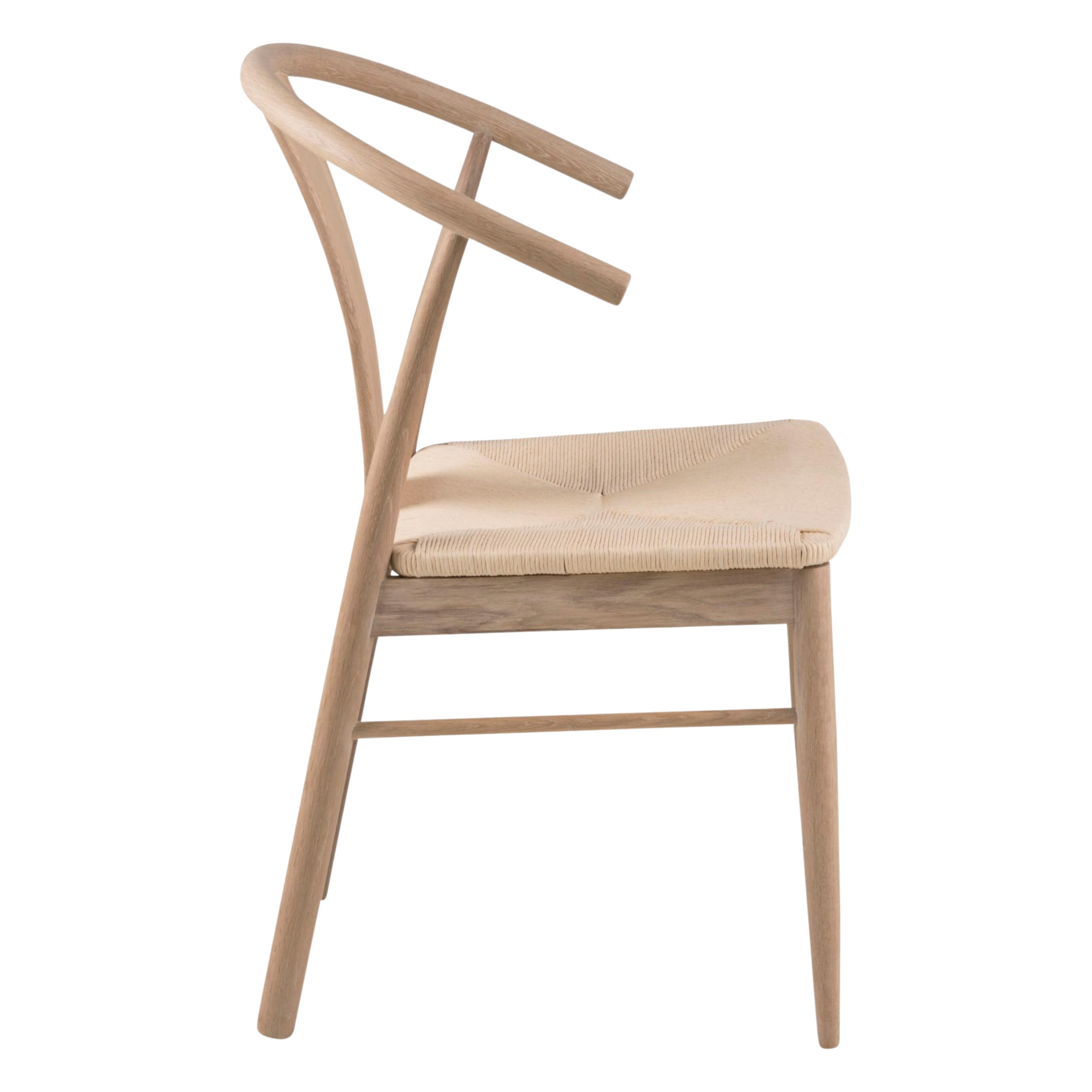 La struttura è realizzata in rovere oliato pigmentato bianco, un trattamento che esalta la bellezza naturale del legno e dona alla sedia un aspetto leggero e luminoso. La seduta intrecciata in corda di carta color bianco sporco aggiunge un dettaglio artigianale classico che crea un'atmosfera armoniosa e naturale.