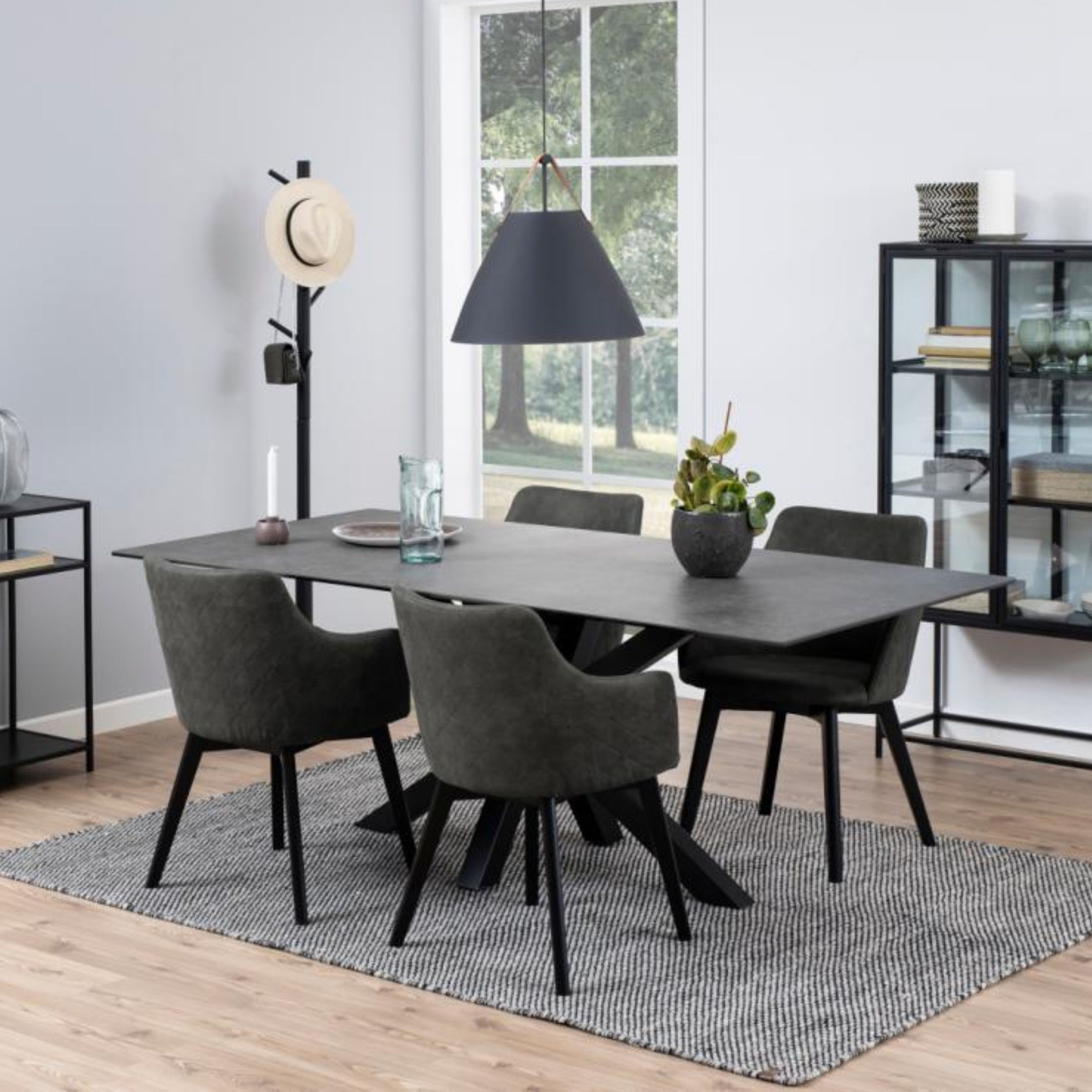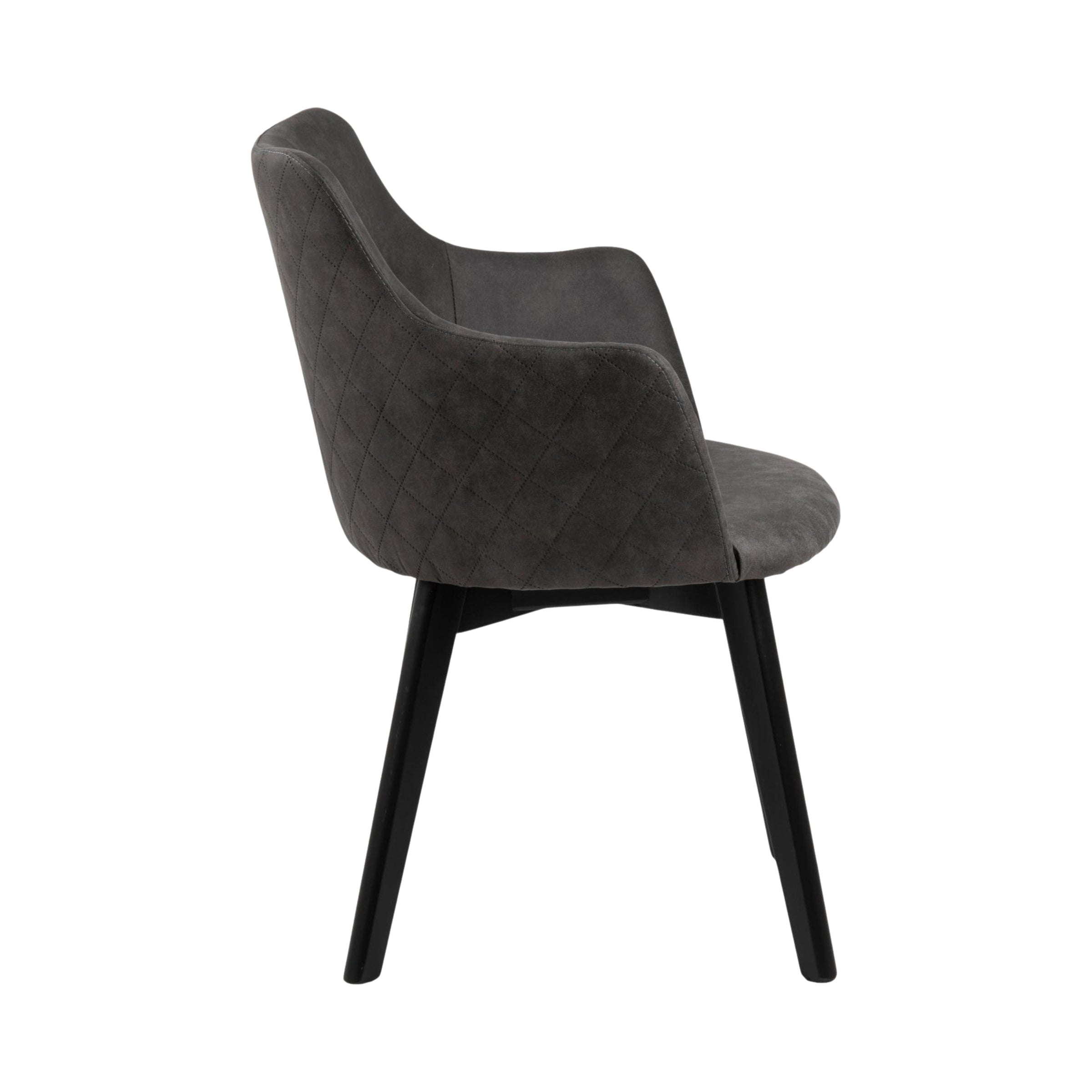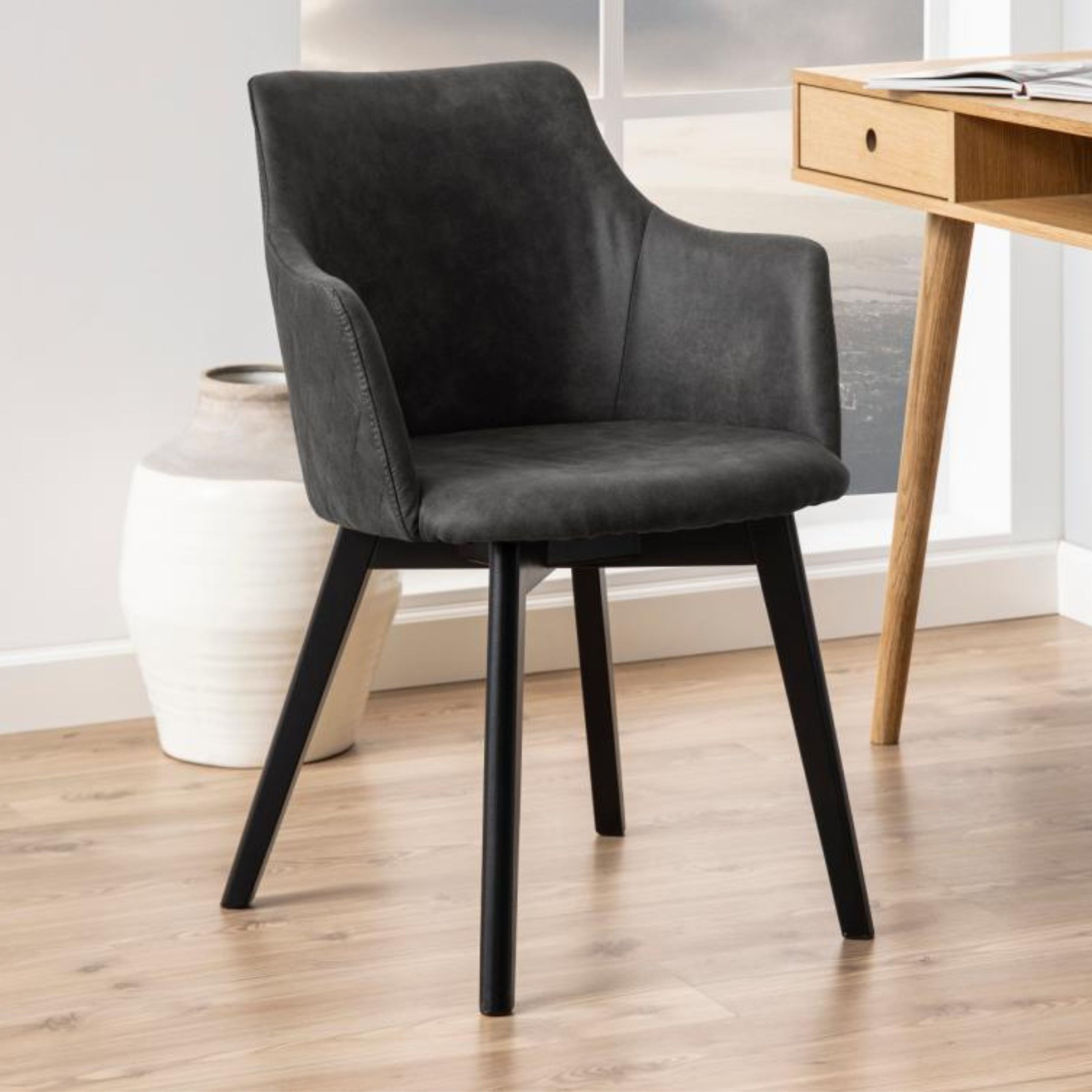 Un tocco di eleganza contemporanea per la tua zona pranzo. Questa sedia è un capolavoro di design, creata per offrire un forte contrasto visivo tra la solida base in rovere laccato nero e l'accogliente rivestimento in tessuto. Questo mix di materiali crea un'estetica moderna e sofisticata che si integra perfettamente in ogni ambiente.