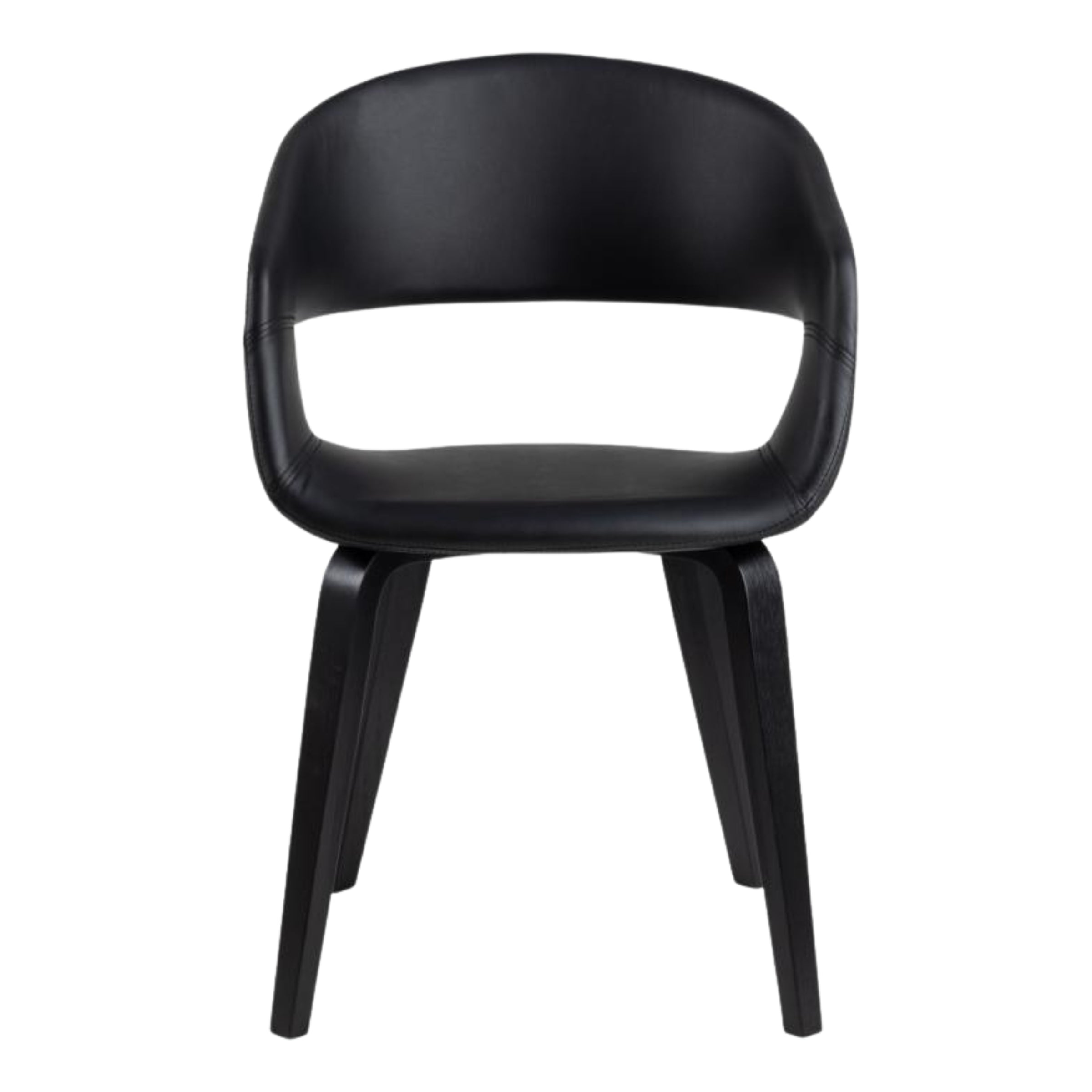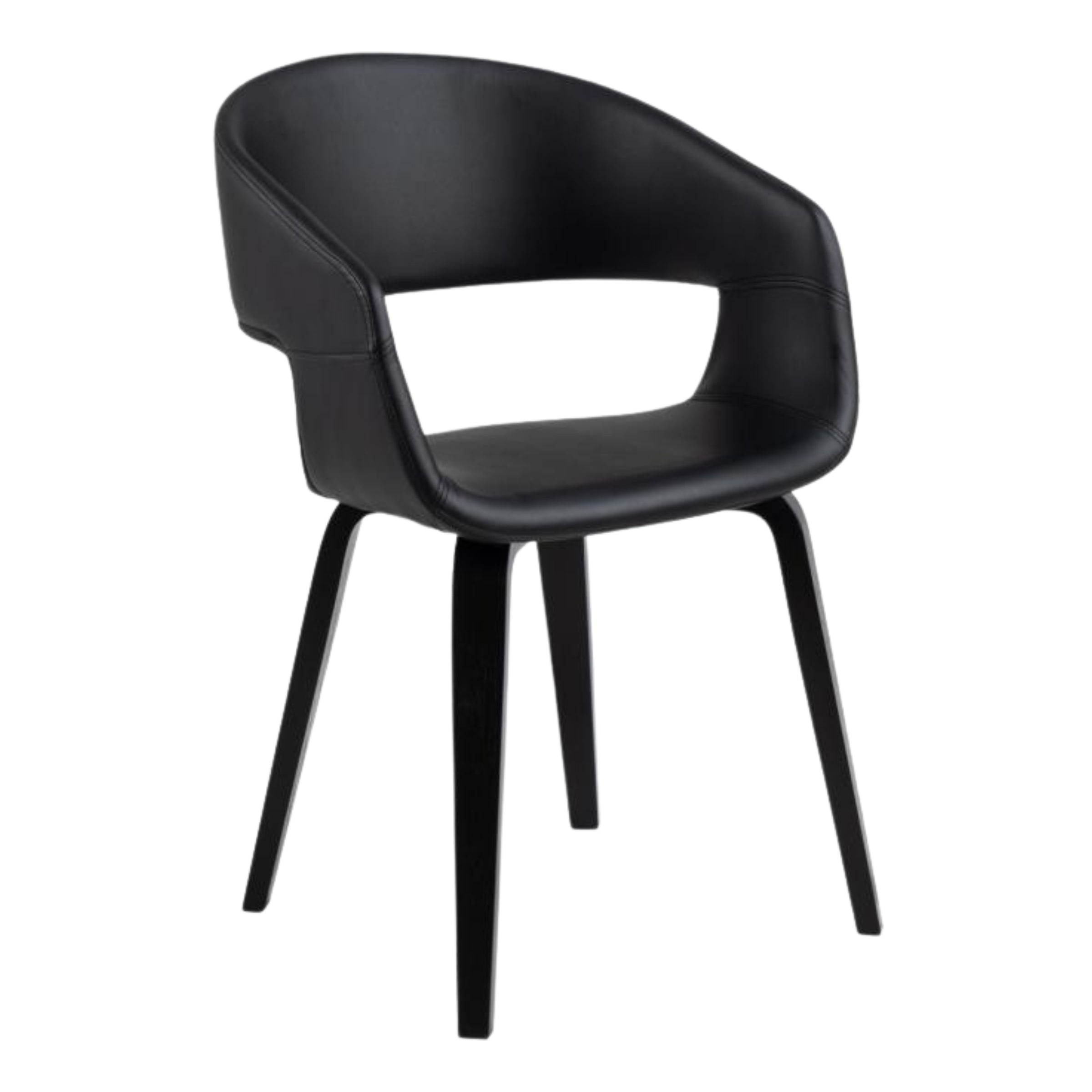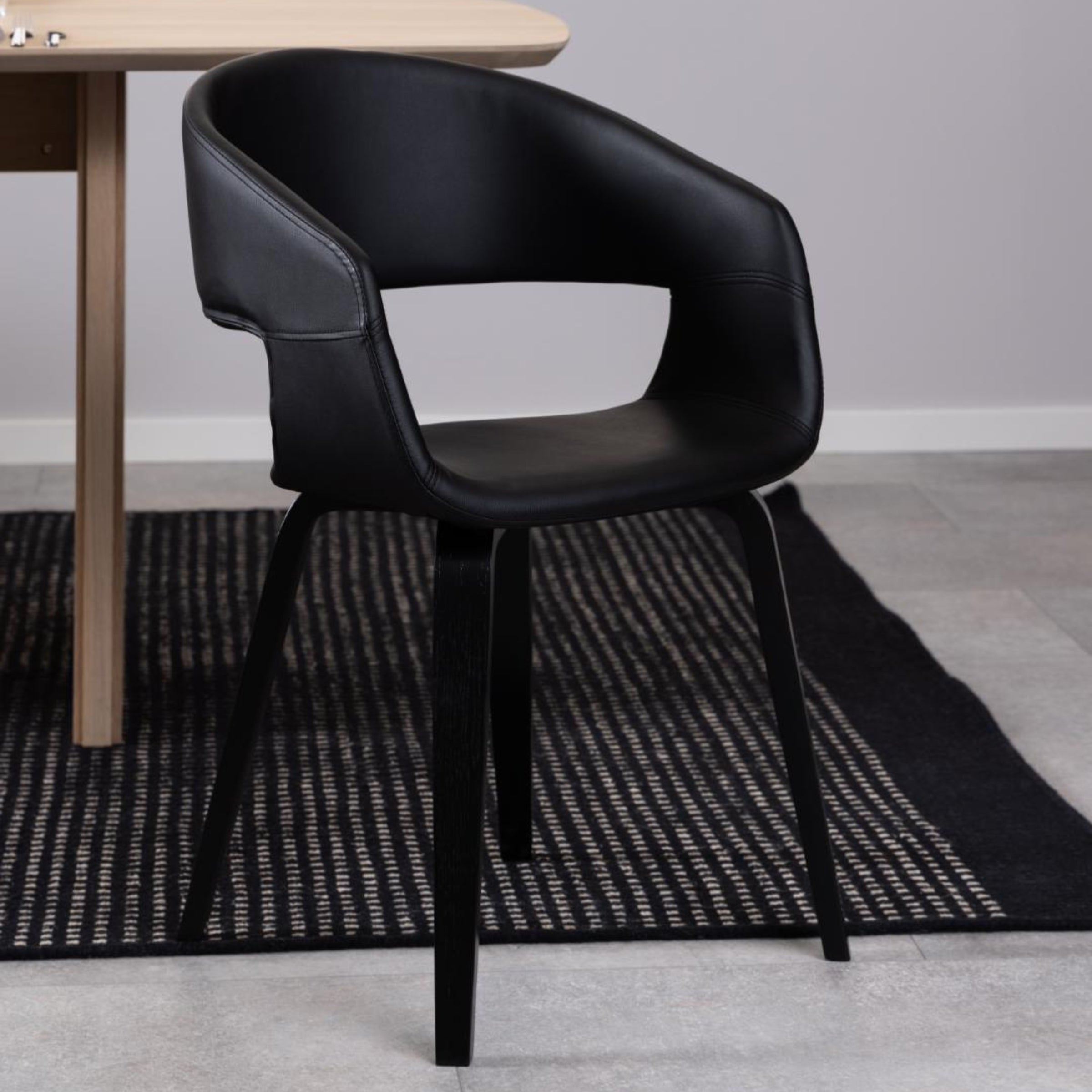 Il rivestimento in ecopelle liscia nera non è solo un piacere per gli occhi, ma è anche facile da pulire, garantendo praticità e durata nel tempo. Le gambe sagomate impiallacciate in rovere laccato aggiungono un contrasto caldo e naturale al nero, sottolineando il fascino retrò-moderno della sedia.