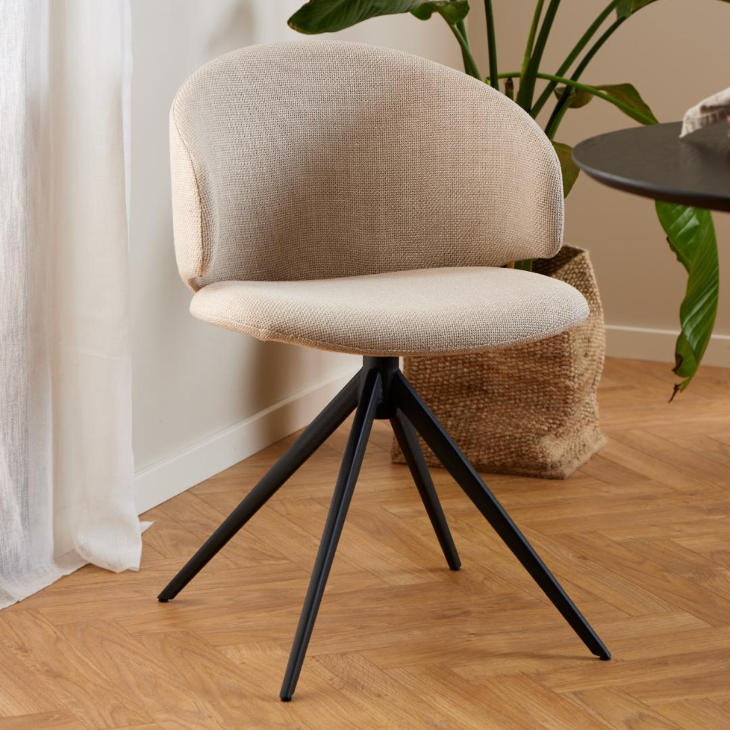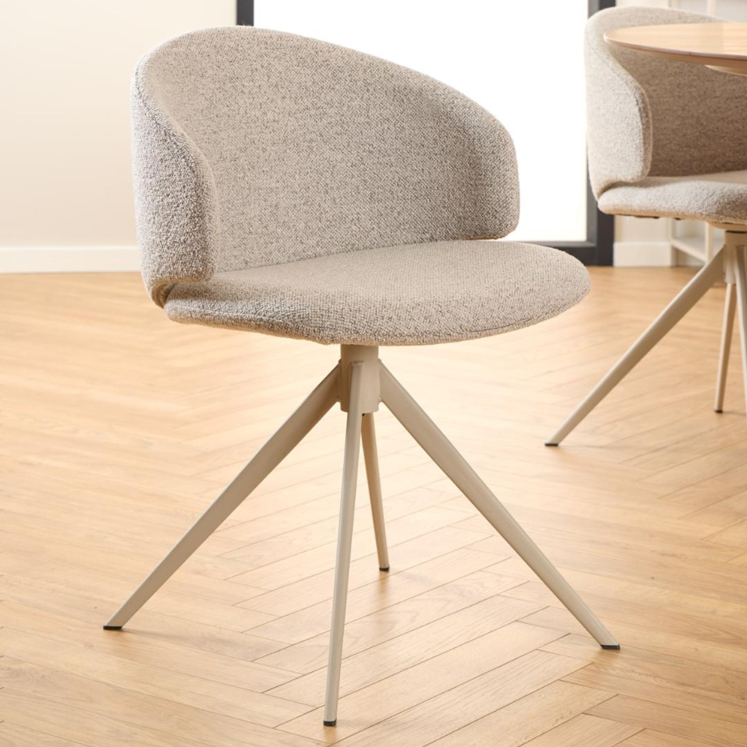 Il rivestimento in tessuto strutturato effetto bicolore non è solo piacevole alla vista, ma aggiunge anche una sensazione di profondità e calore all'ambiente. La vera magia di questa sedia, però, è nella sua base: la funzione girevole consente una libertà di movimento senza precedenti, rendendo più facile alzarsi e sedersi, o semplicemente voltarsi per conversare.