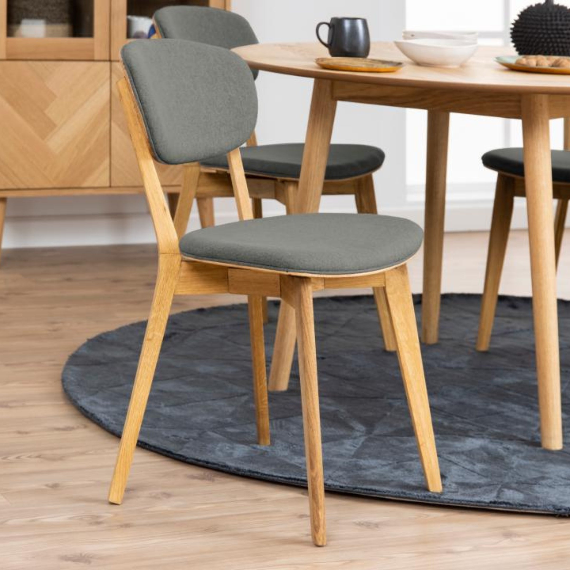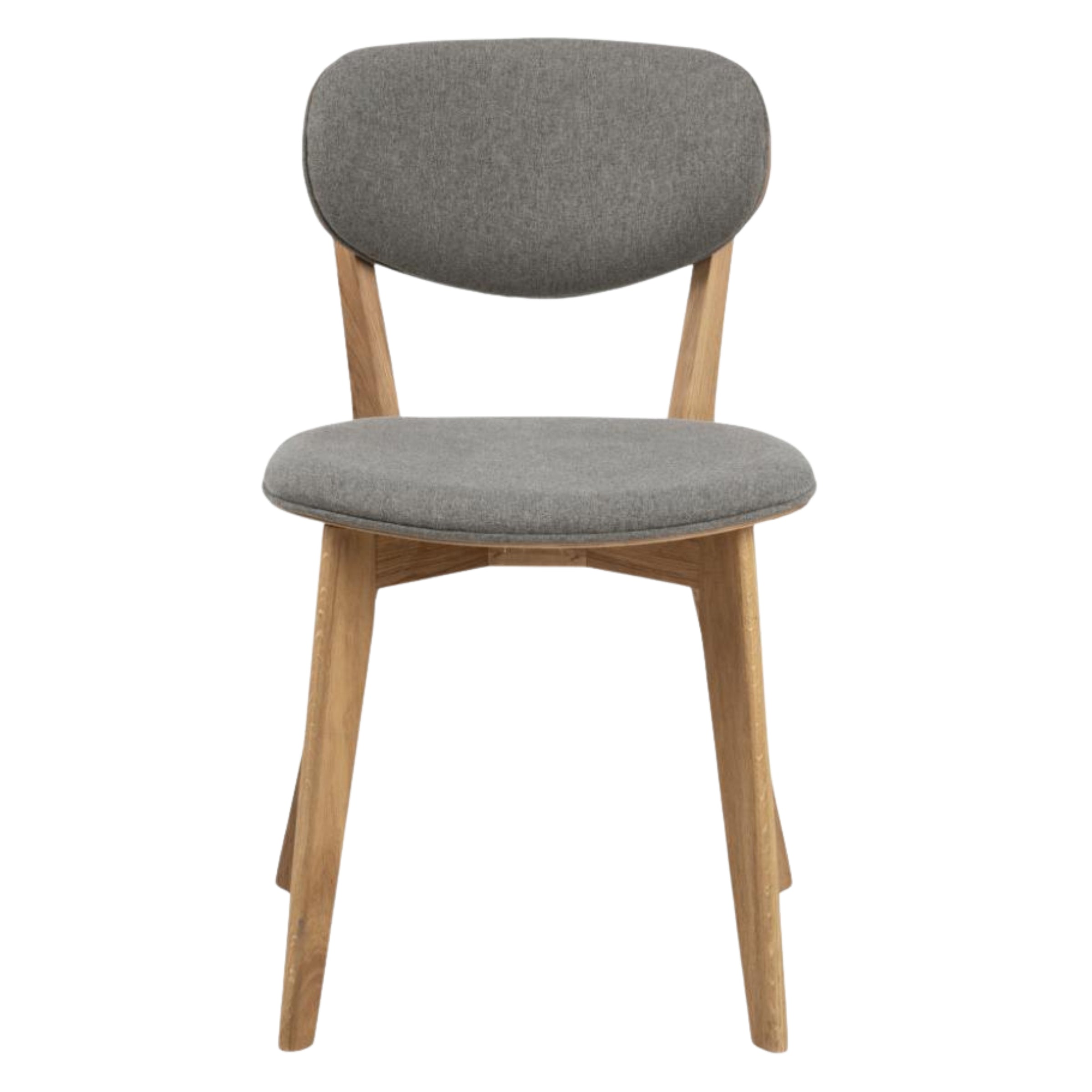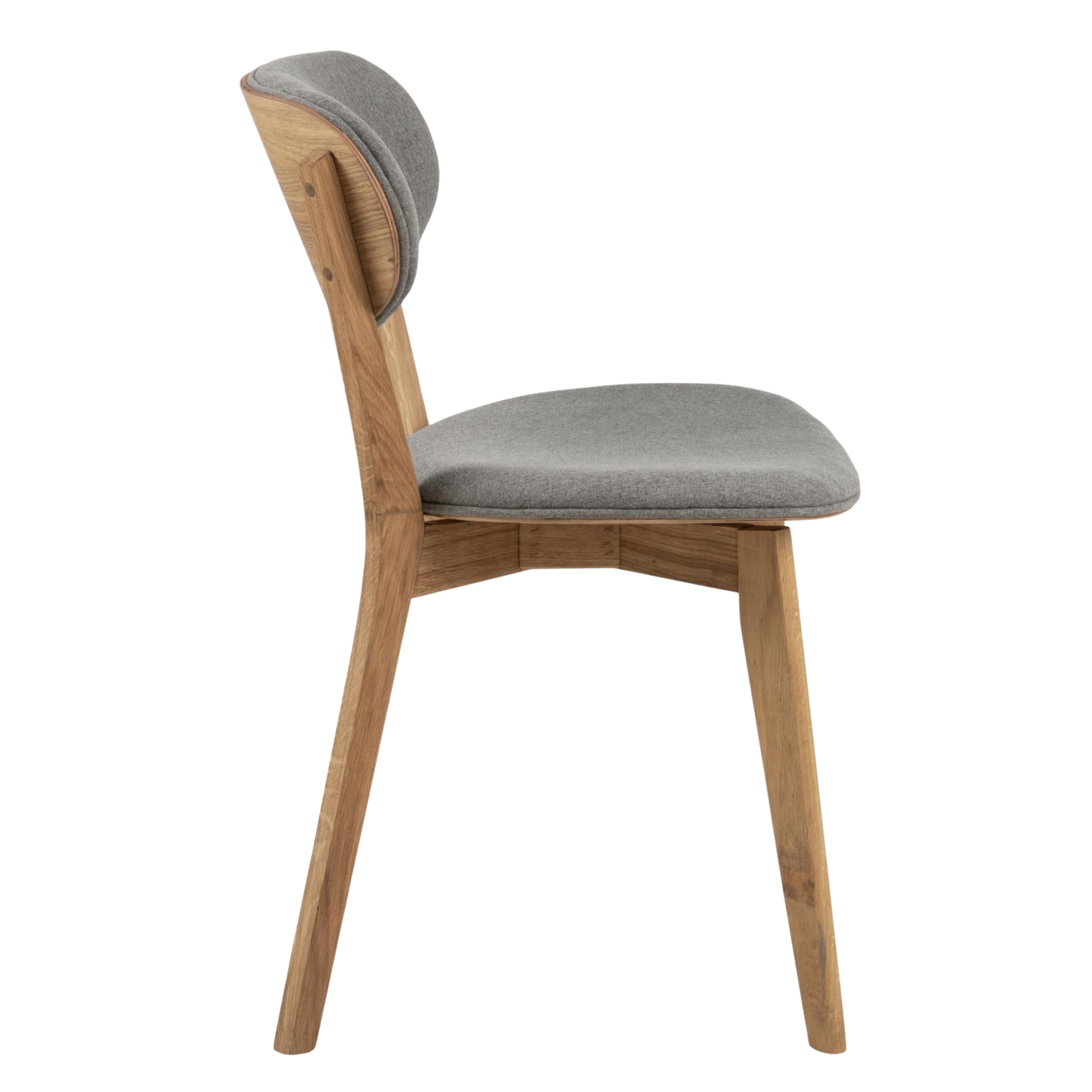 La seduta e lo schienale, dalla forma arrotondata, sono imbottiti e rivestiti in un tessuto grigio chiaro che ne esalta la sensazione di naturalezza. La sedia offre il massimo comfort, rendendo piacevoli anche i pasti più lunghi.