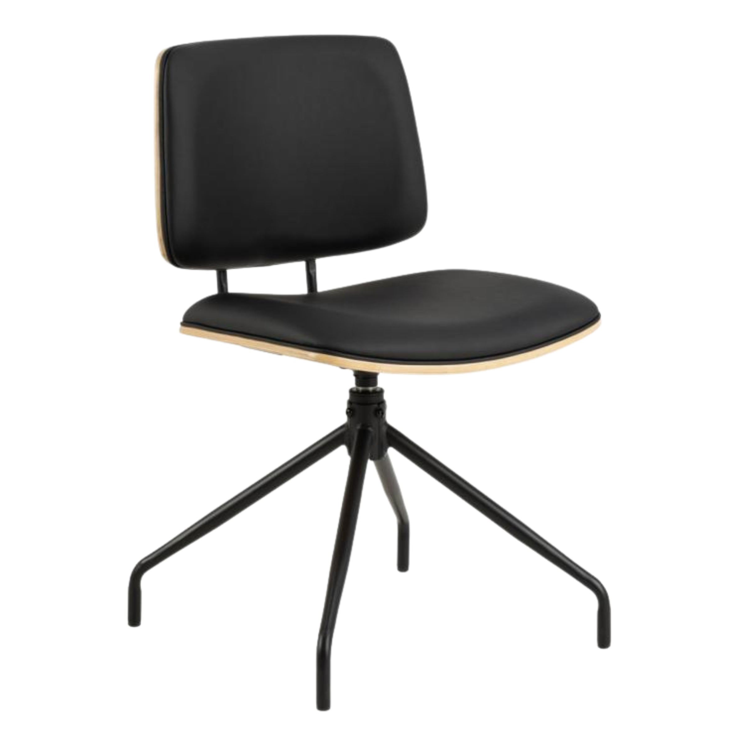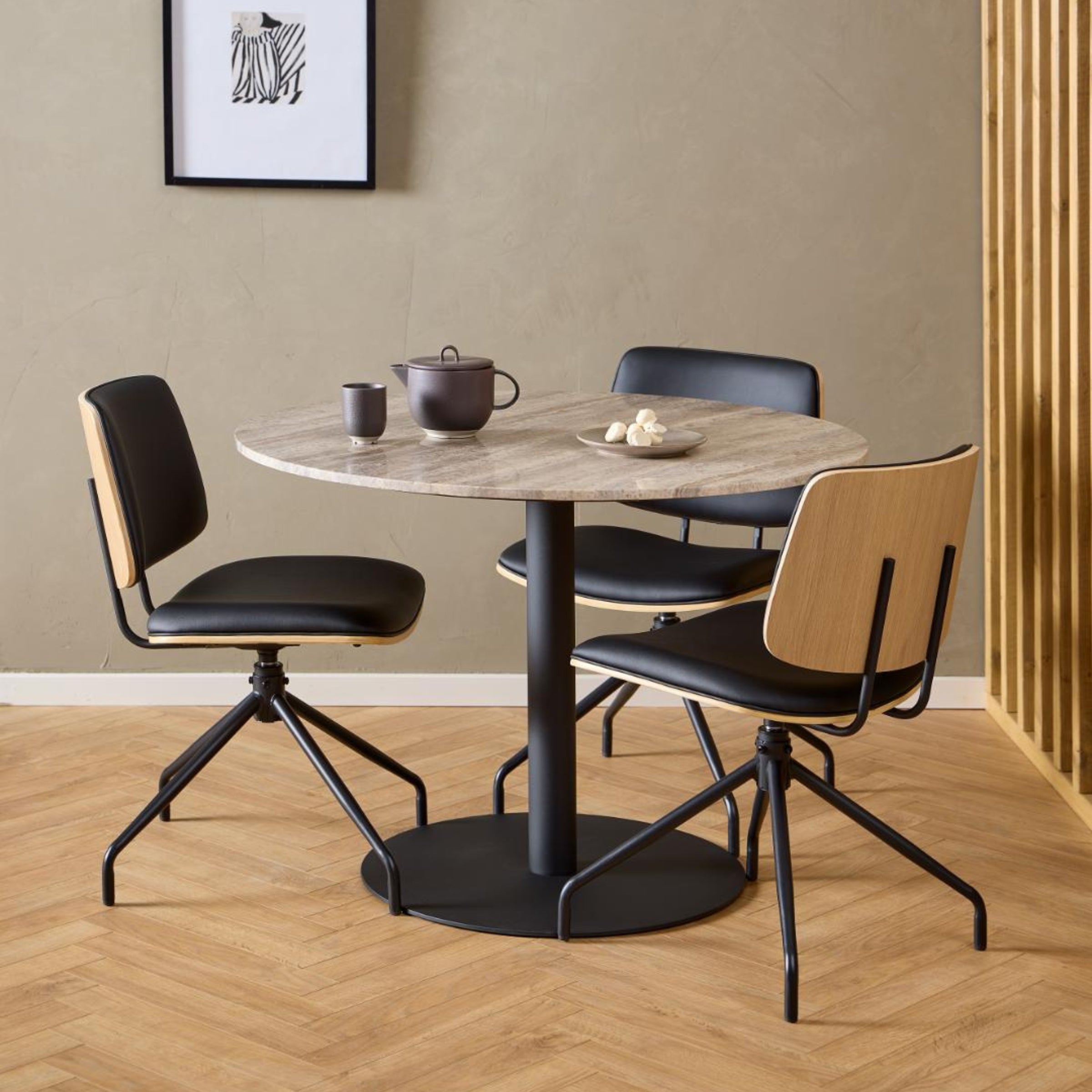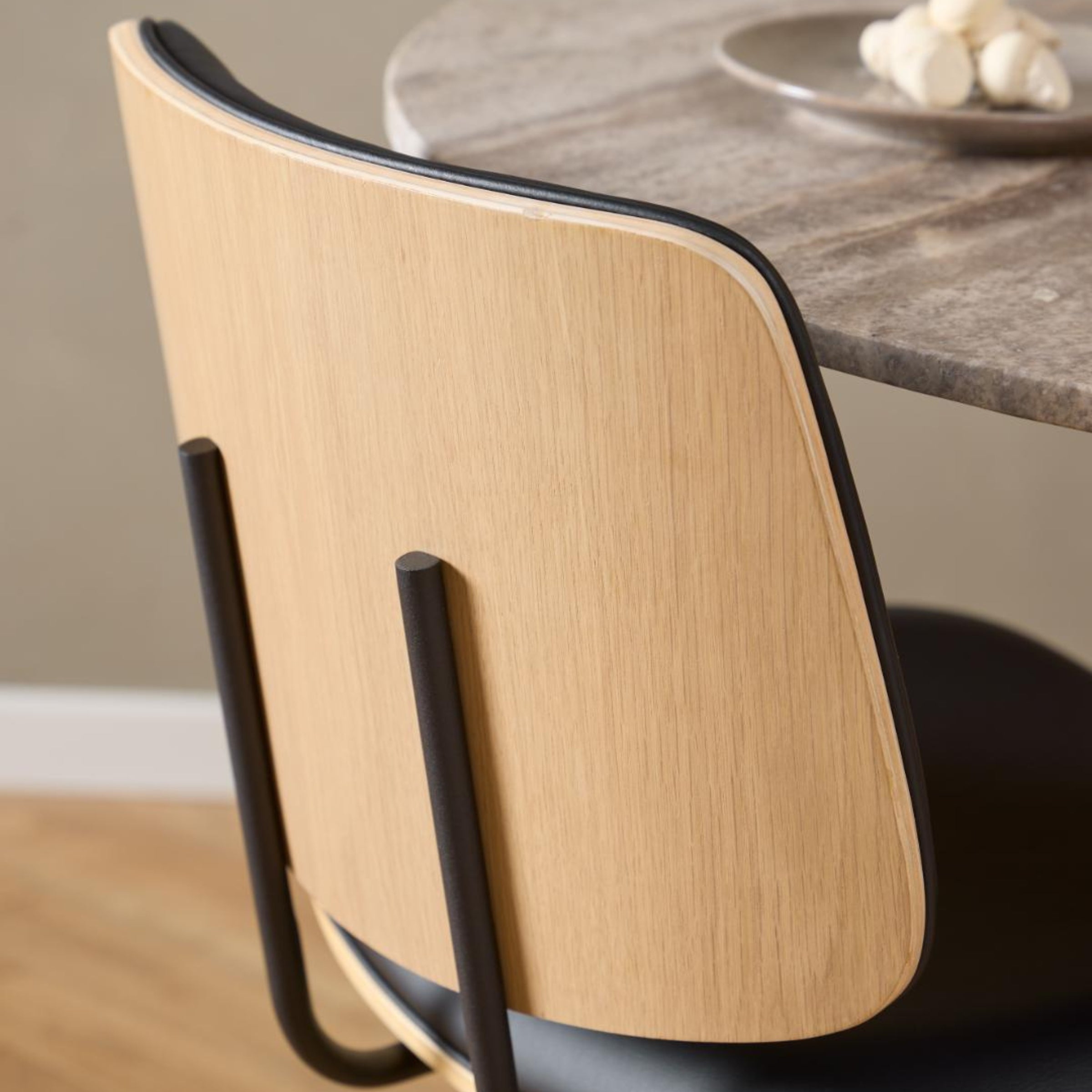 La seduta è rivestita in ecopelle nera, una tonalità neutra che si adatta a ogni stile, dalla cucina moderna al soggiorno classico. Il tocco unico è dato dalla impiallacciatura laccata rovere, che arricchisce il design con un'eleganza naturale e calda.