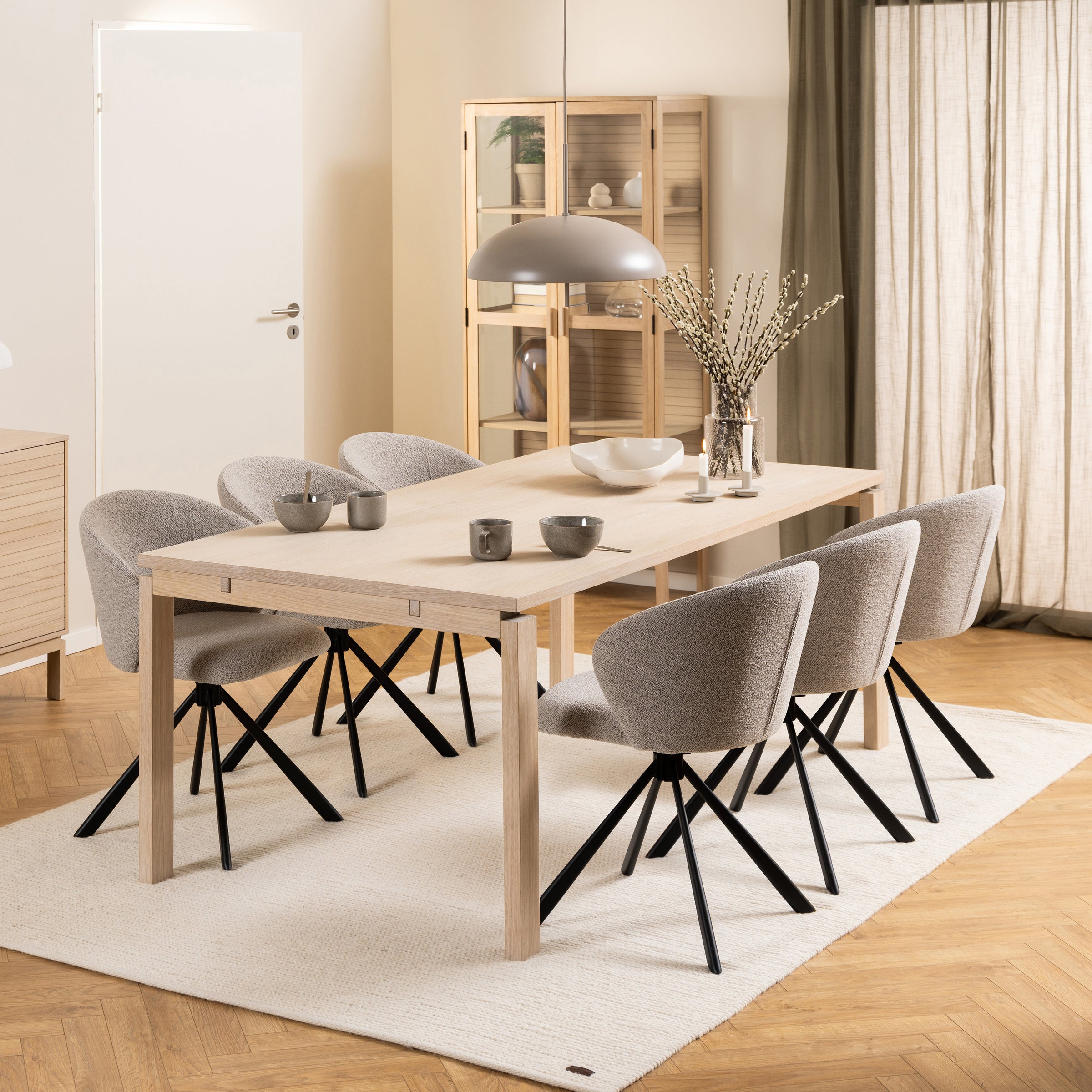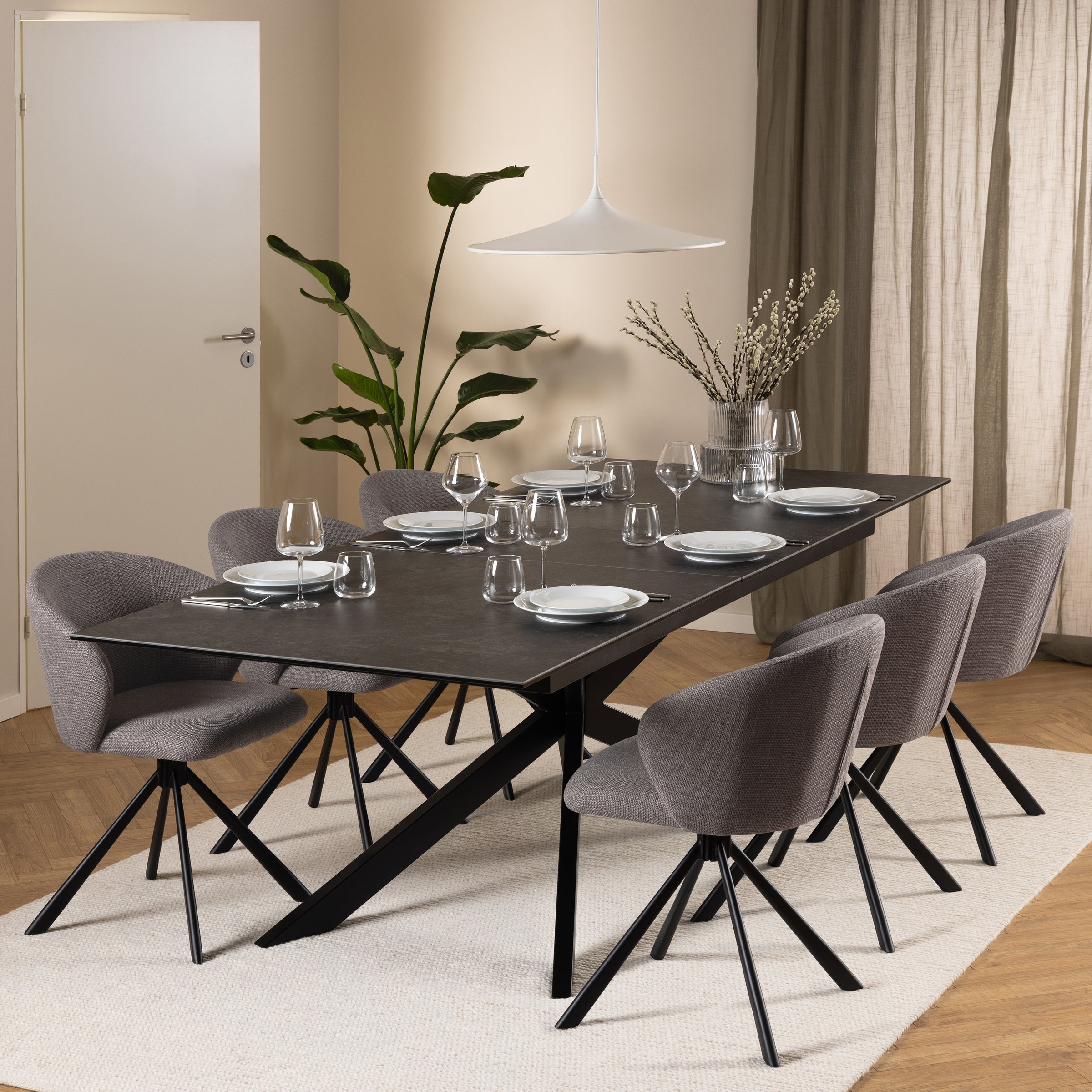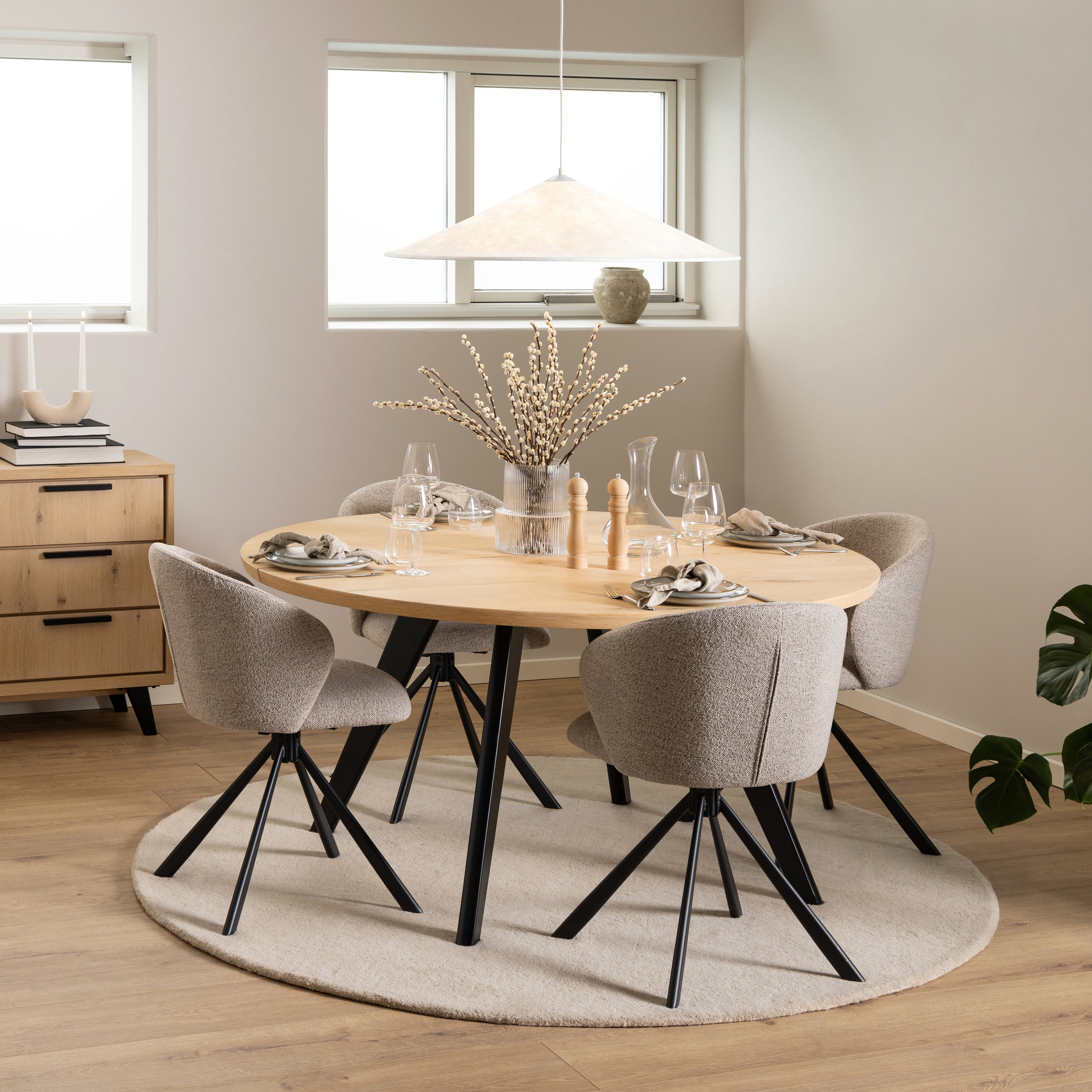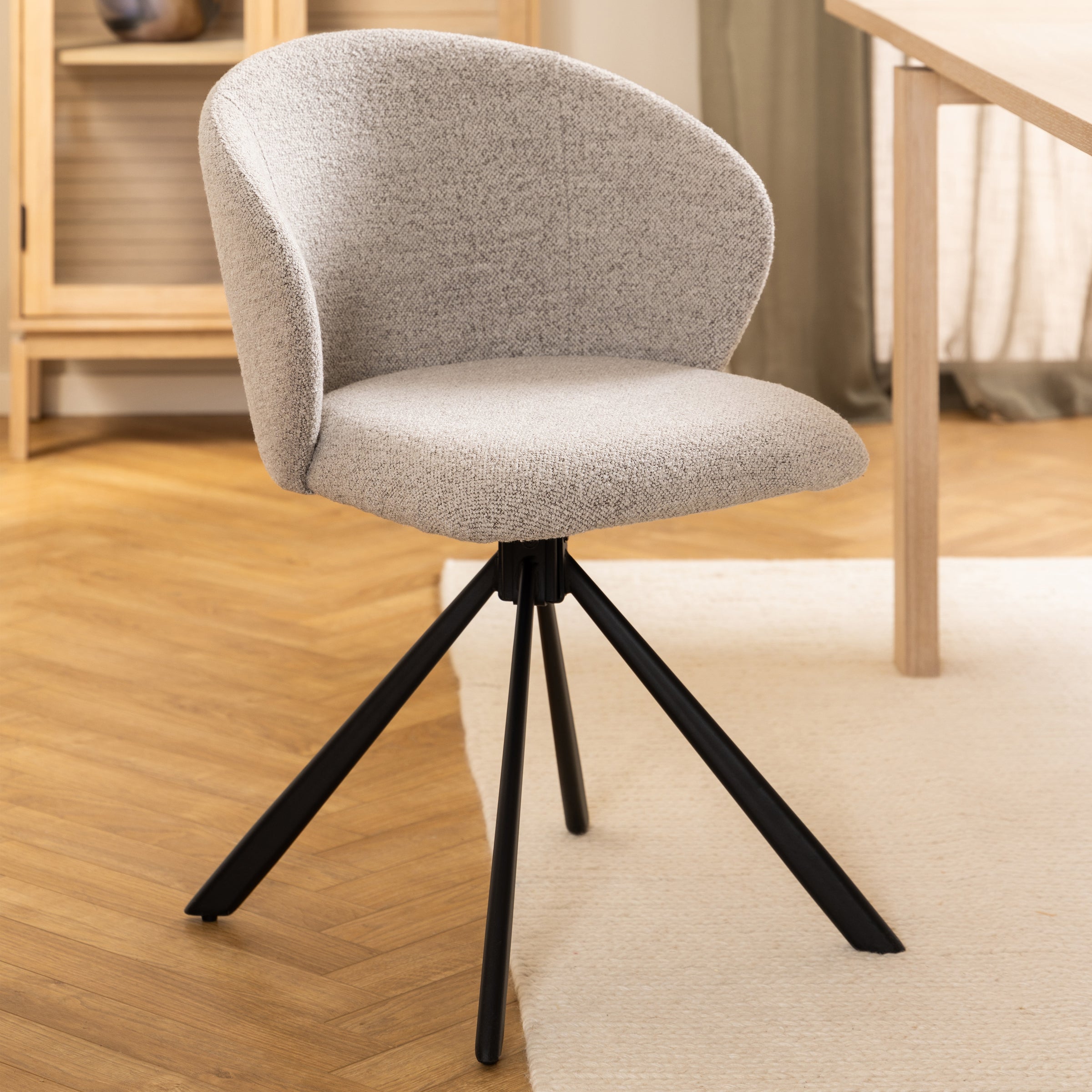 Grazie alla base girevole in sottile metallo nero, non dovrai più alzarti o spostare la sedia per muoverti, rendendo ogni momento a tavola più comodo. La seduta dalla forma organica con le sue curve femminili e le cuciture a 3 campi crea un look contemporaneo ed elegante.
